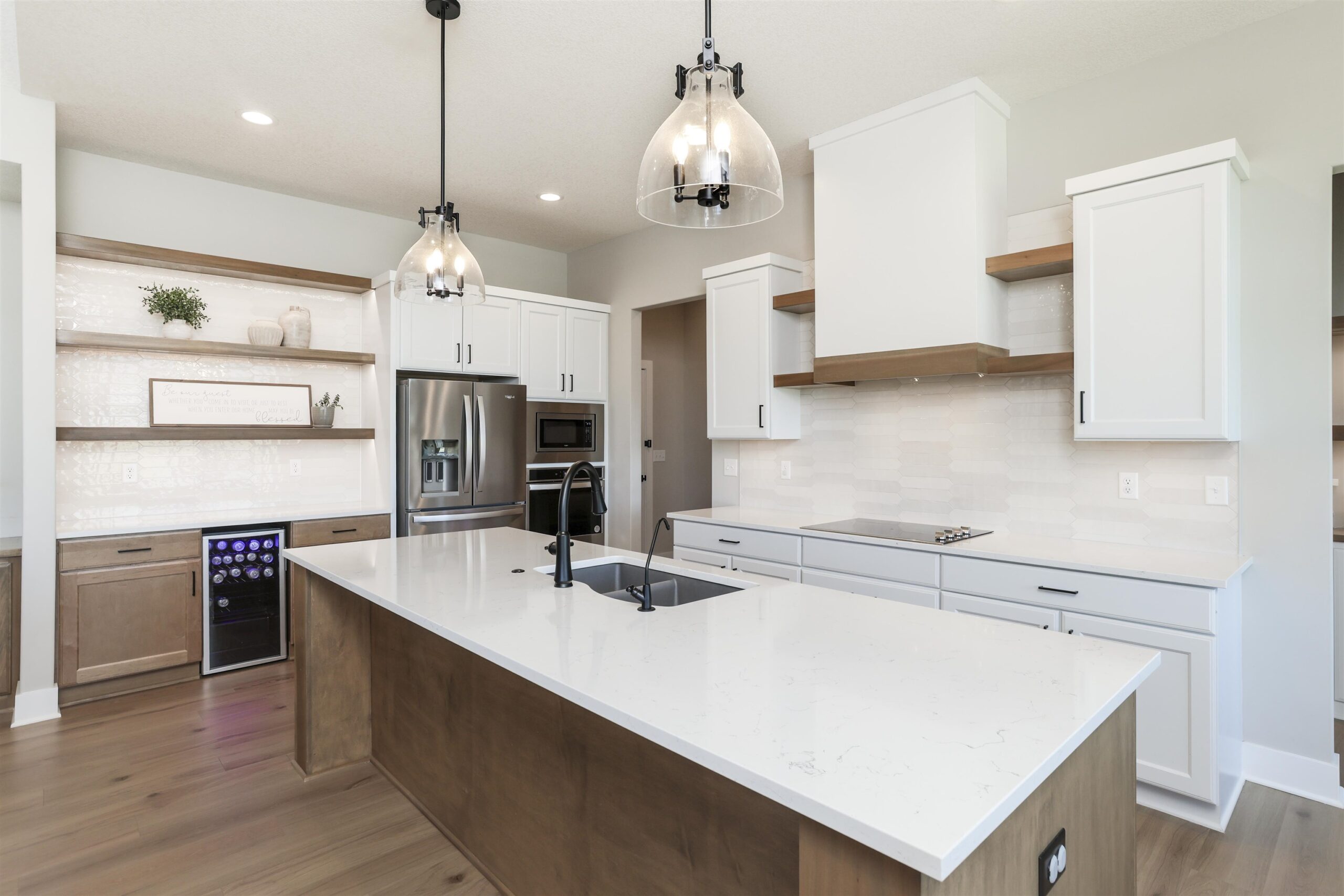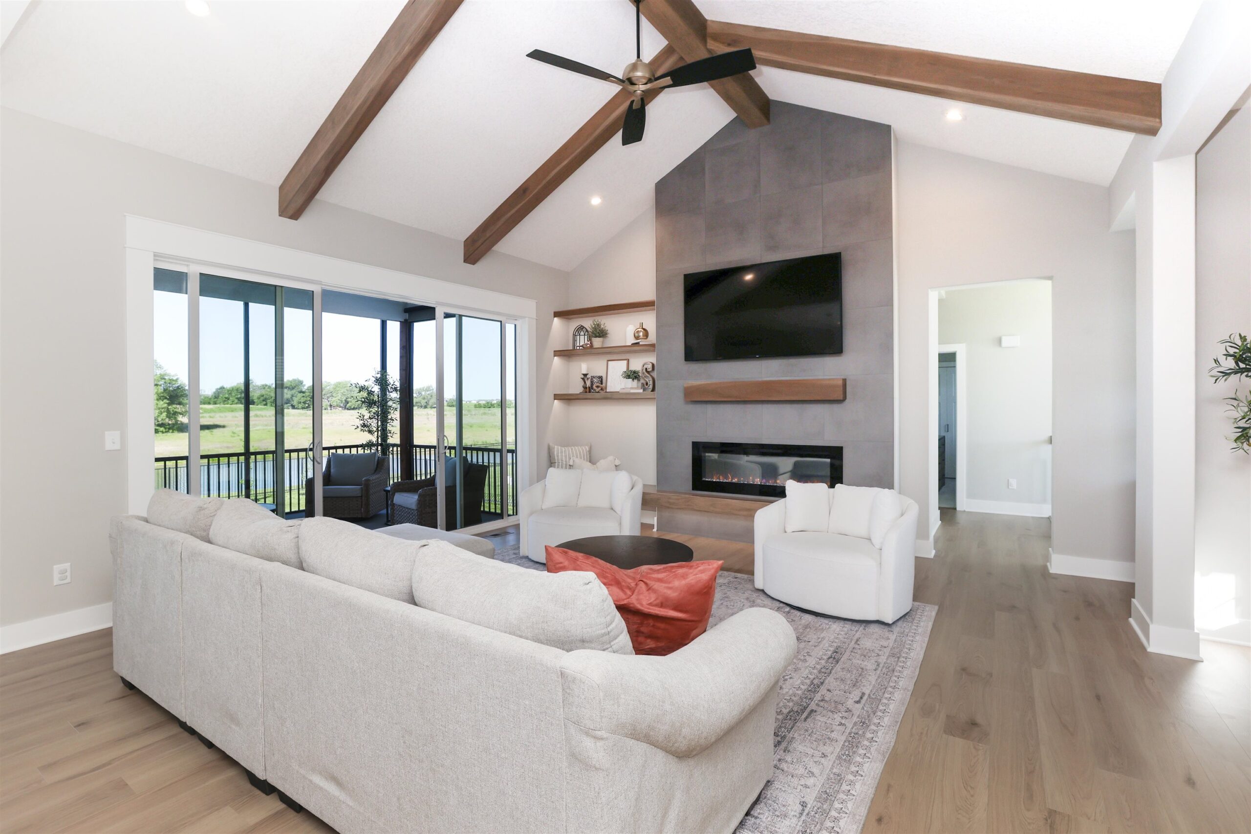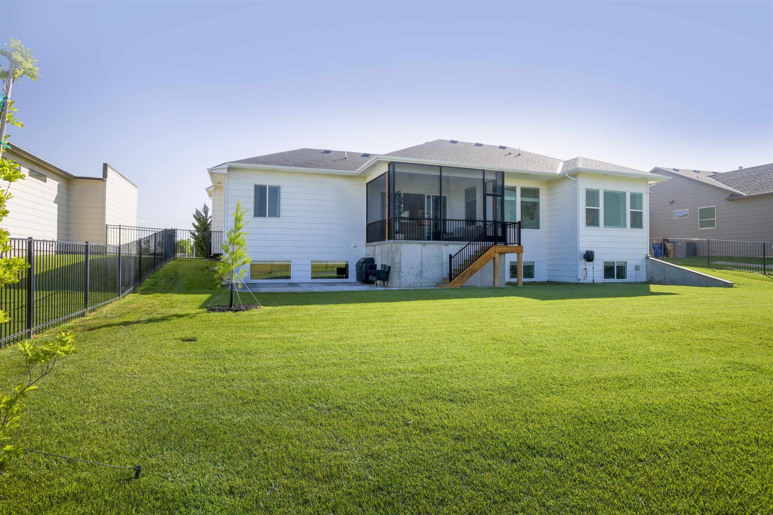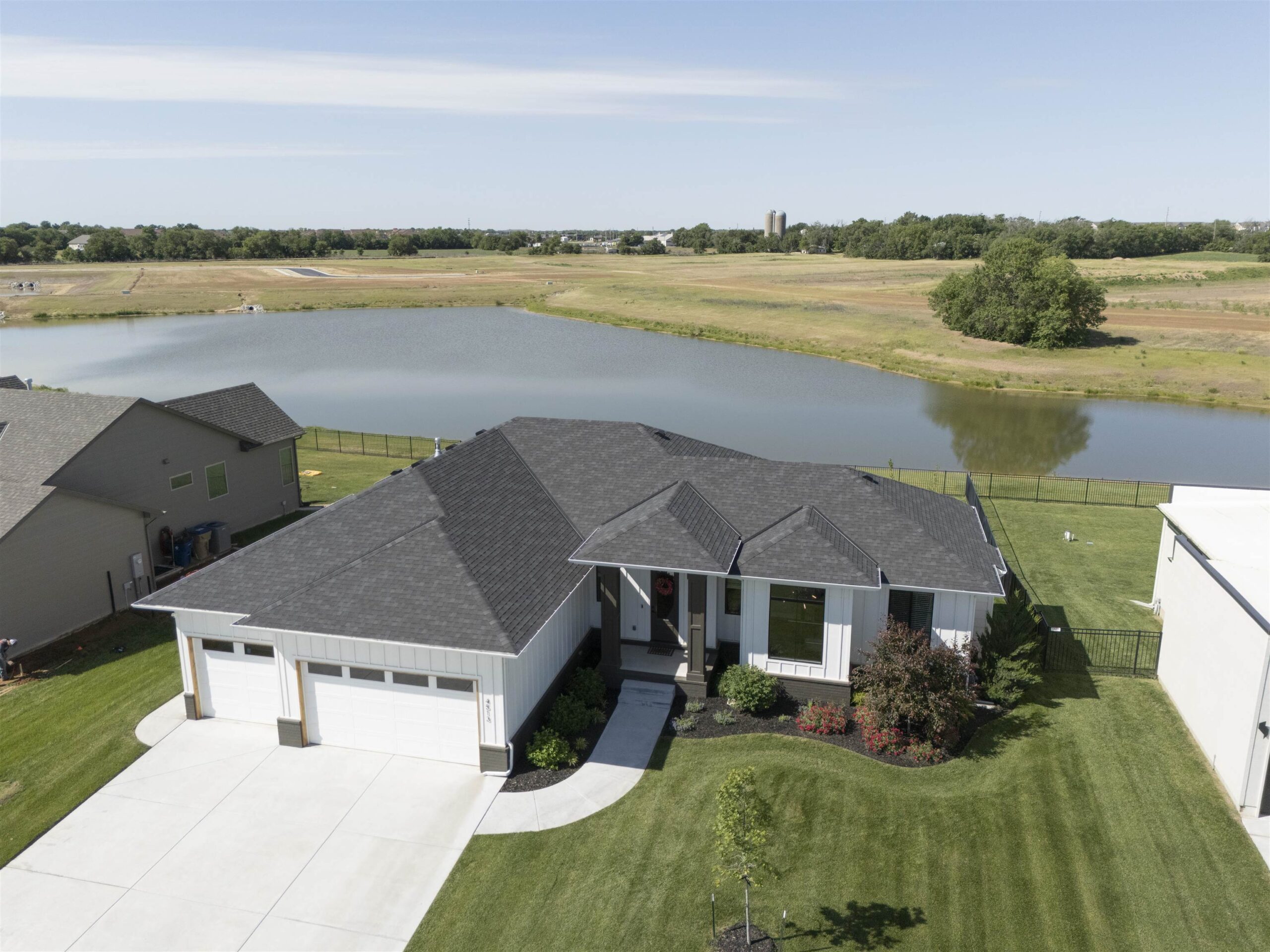 - Description: Now for sale in the sought-after Henwick Addition and located within Maize Schools, this stunning three-year-old former model home offers exceptional design, energy efficiency, and lake views. With five bedrooms, three bathrooms, and a fully finished three-car garage complete with insulation and sheetrock, this home delivers both comfort and style. A spacious front porch and oversized picture windows welcome you in, revealing gorgeous lake views visible immediately through the expansive living room’s sliding glass doors. Step out to the elevated concrete screened-in patio featuring electric shades—perfect for relaxing or entertaining. Inside, the main floor impresses with a vaulted and beamed ceiling, LVP flooring throughout, and a sleek electric fireplace with built-in bookshelves and a hidden drawer in the mantel. The open-concept kitchen includes an oversized island, abundant cabinetry, floating shelves, and a side wine/coffee bar. A walk-in pantry and built-in drop zone near the garage entry provide added convenience. The master suite offers a luxurious escape with a massive glass-enclosed walk-in shower, dual vanities, and a walk-in closet that connects directly to the main floor laundry room. A split bedroom layout places two additional bedrooms and a full bath on the opposite side of the home. An elegant staircase with a statement light fixture leads to the finished view-out basement. Downstairs features a spacious family room, game area, and a large wet bar with an island, ample storage, and space for a full-size fridge. Two more bedrooms, a third bathroom with privacy door between vanity and shower/toilet area, and a large storage room complete the lower level. Outside, the wrought iron fenced yard includes a sprinkler system, irrigation well, fresh landscaping, and newly planted trees. The seller has upgraded the attic with R49 energy-efficient insulation for increased comfort and efficiency. Full of character and meticulously maintained, this home is move-in ready and sure to impress. Show all description