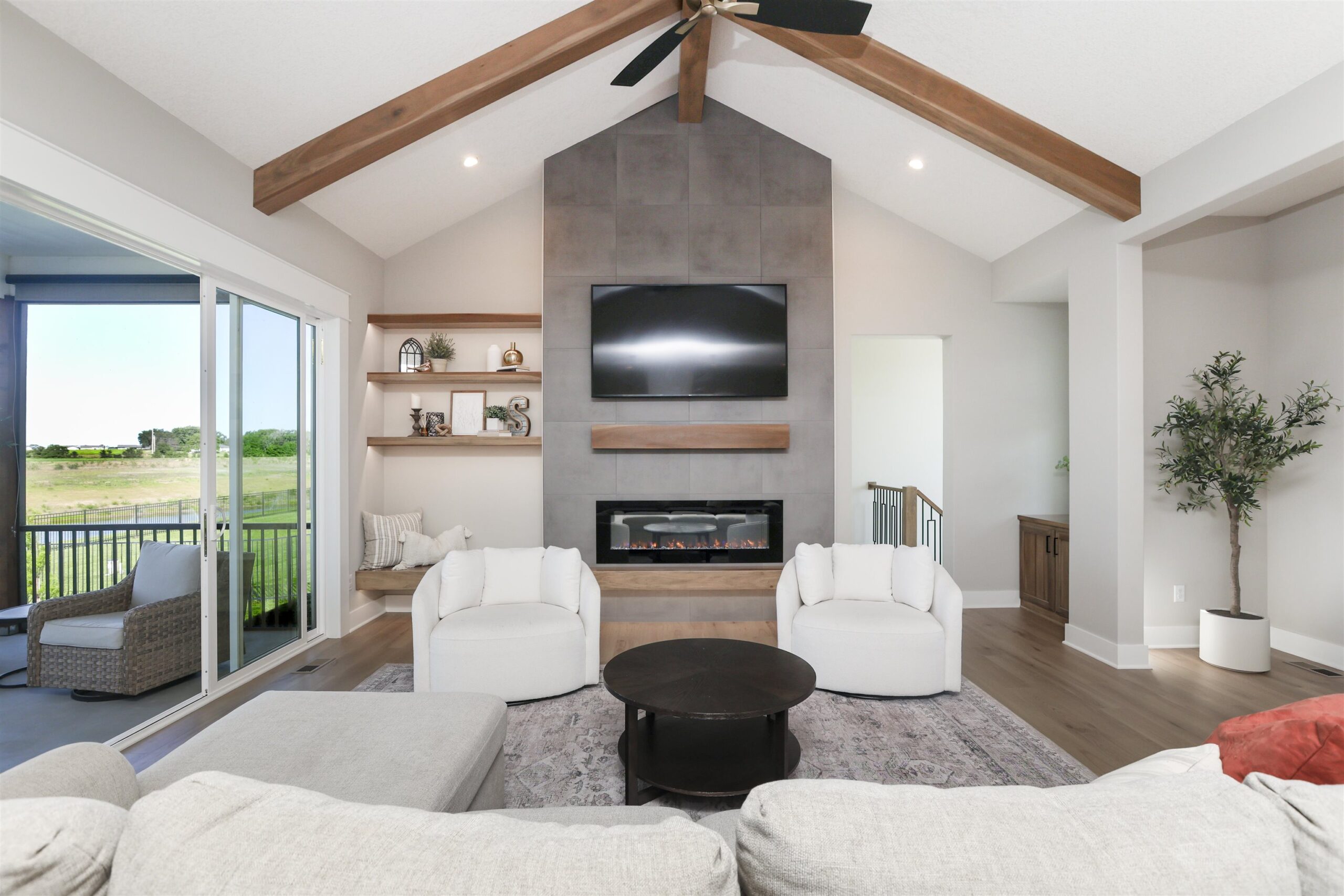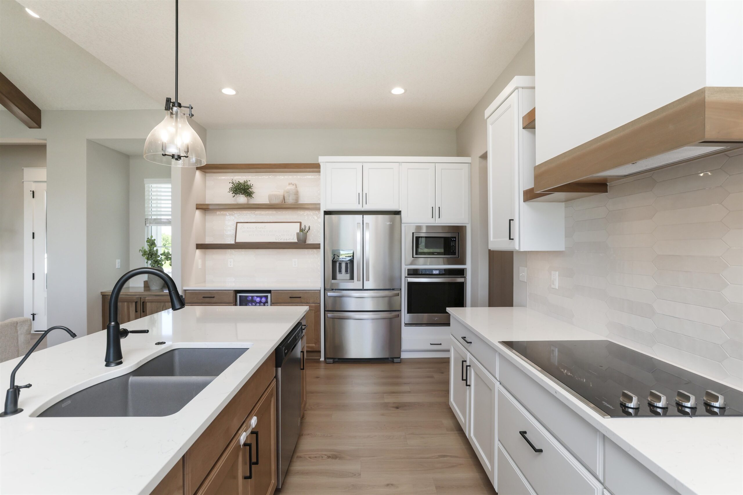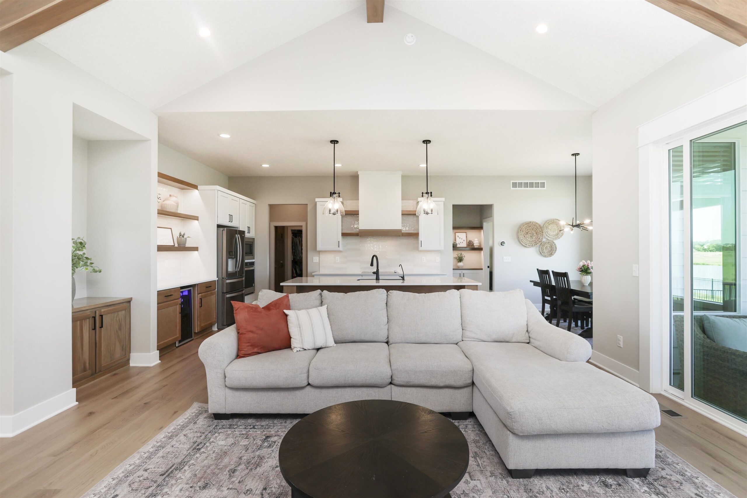- Description: Now for sale in the sought-after Henwick Addition and located within Maize Schools, this stunning three-year-old former model home offers exceptional design, energy efficiency, and lake views. With five bedrooms, three bathrooms, and a fully finished three-car garage complete with insulation and sheetrock, this home delivers both comfort and style. A spacious front porch and oversized picture windows welcome you in, revealing gorgeous lake views visible immediately through the expansive living room’s sliding glass doors. Step out to the elevated concrete screened-in patio featuring electric shades—perfect for relaxing or entertaining. Inside, the main floor impresses with a vaulted and beamed ceiling, LVP flooring throughout, and a sleek electric fireplace with built-in bookshelves and a hidden drawer in the mantel. The open-concept kitchen includes an oversized island, abundant cabinetry, floating shelves, and a side wine/coffee bar. A walk-in pantry and built-in drop zone near the garage entry provide added convenience. The master suite offers a luxurious escape with a massive glass-enclosed walk-in shower, dual vanities, and a walk-in closet that connects directly to the main floor laundry room. A split bedroom layout places two additional bedrooms and a full bath on the opposite side of the home. An elegant staircase with a statement light fixture leads to the finished view-out basement. Downstairs features a spacious family room, game area, and a large wet bar with an island, ample storage, and space for a full-size fridge. Two more bedrooms, a third bathroom with privacy door between vanity and shower/toilet area, and a large storage room complete the lower level. Outside, the wrought iron fenced yard includes a sprinkler system, irrigation well, fresh landscaping, and newly planted trees. The seller has upgraded the attic with R49 energy-efficient insulation for increased comfort and efficiency. Full of character and meticulously maintained, this home is move-in ready and sure to impress. Show all description