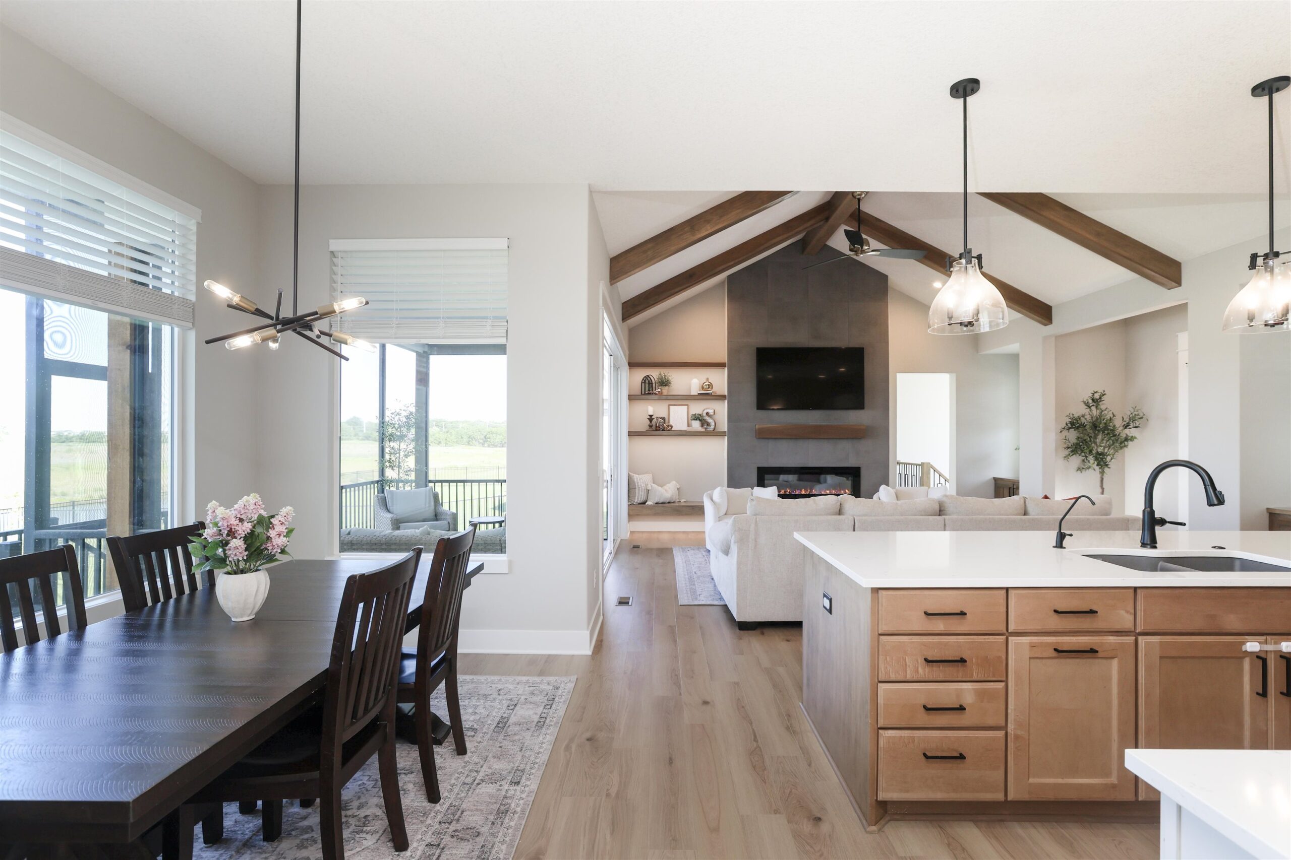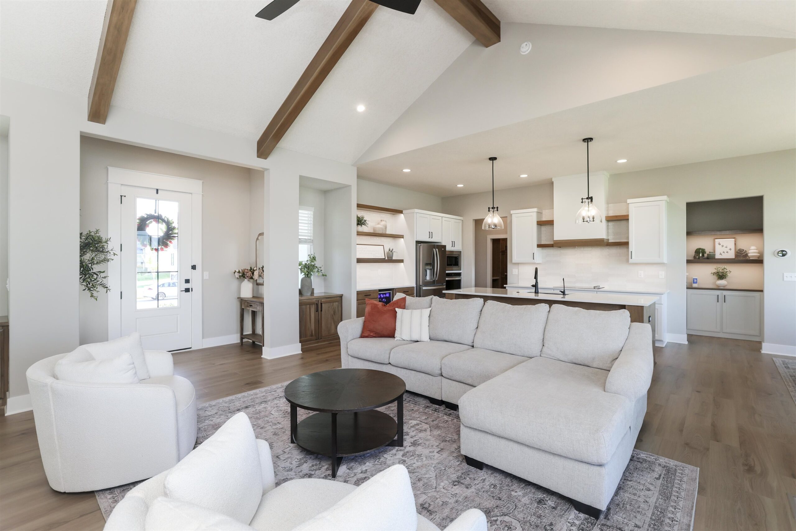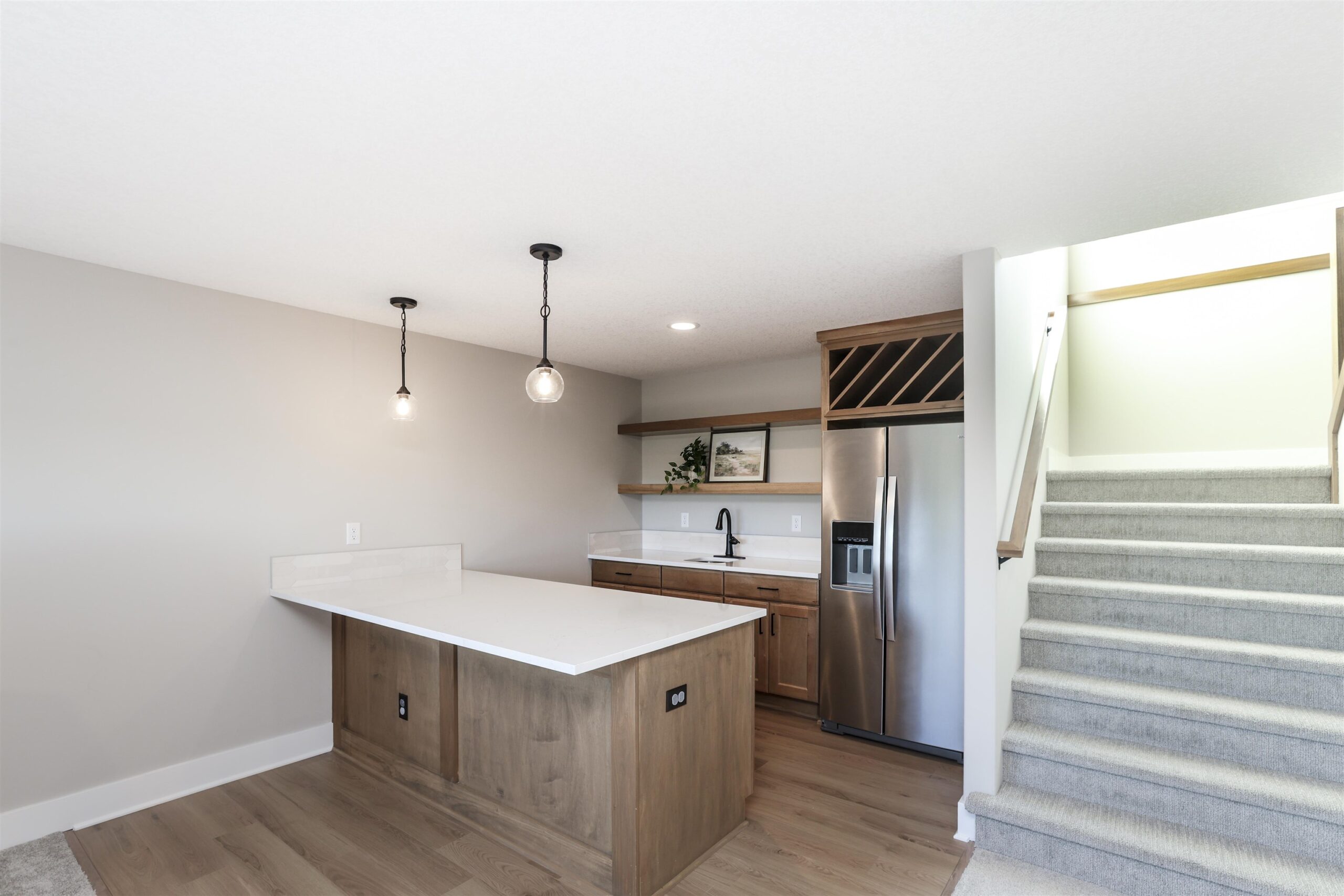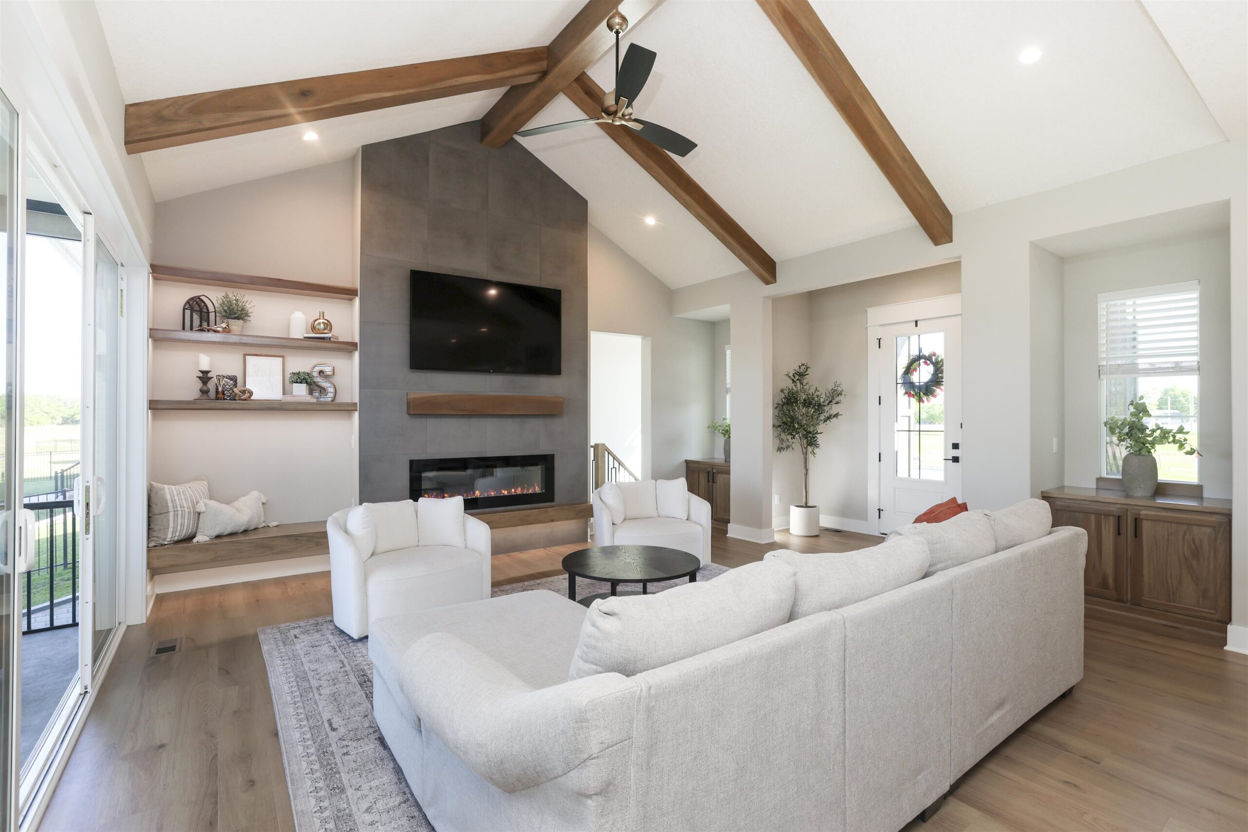 - Description: Now for sale in the sought-after Henwick Addition and located within Maize Schools, this stunning three-year-old former model home offers exceptional design, energy efficiency, and lake views. With five bedrooms, three bathrooms, and a fully finished three-car garage complete with insulation and sheetrock, this home delivers both comfort and style. A spacious front porch and oversized picture windows welcome you in, revealing gorgeous lake views visible immediately through the expansive living room’s sliding glass doors. Step out to the elevated concrete screened-in patio featuring electric shades—perfect for relaxing or entertaining. Inside, the main floor impresses with a vaulted and beamed ceiling, LVP flooring throughout, and a sleek electric fireplace with built-in bookshelves and a hidden drawer in the mantel. The open-concept kitchen includes an oversized island, abundant cabinetry, floating shelves, and a side wine/coffee bar. A walk-in pantry and built-in drop zone near the garage entry provide added convenience. The master suite offers a luxurious escape with a massive glass-enclosed walk-in shower, dual vanities, and a walk-in closet that connects directly to the main floor laundry room. A split bedroom layout places two additional bedrooms and a full bath on the opposite side of the home. An elegant staircase with a statement light fixture leads to the finished view-out basement. Downstairs features a spacious family room, game area, and a large wet bar with an island, ample storage, and space for a full-size fridge. Two more bedrooms, a third bathroom with privacy door between vanity and shower/toilet area, and a large storage room complete the lower level. Outside, the wrought iron fenced yard includes a sprinkler system, irrigation well, fresh landscaping, and newly planted trees. The seller has upgraded the attic with R49 energy-efficient insulation for increased comfort and efficiency. Full of character and meticulously maintained, this home is move-in ready and sure to impress. Show all description