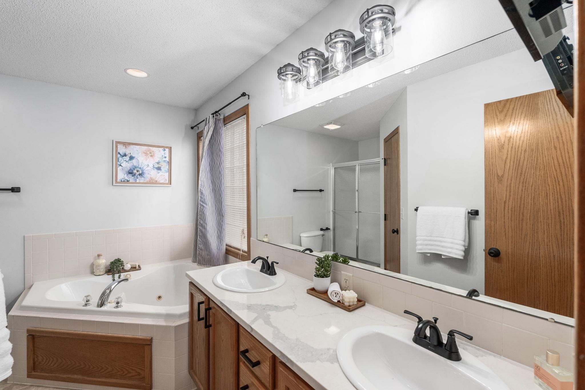- Master Bedroom: Split Bedroom Plan, Master Bedroom Bath, Sep. Tub/Shower/Mstr Bdrm, Two Sinks, Quartz Counters