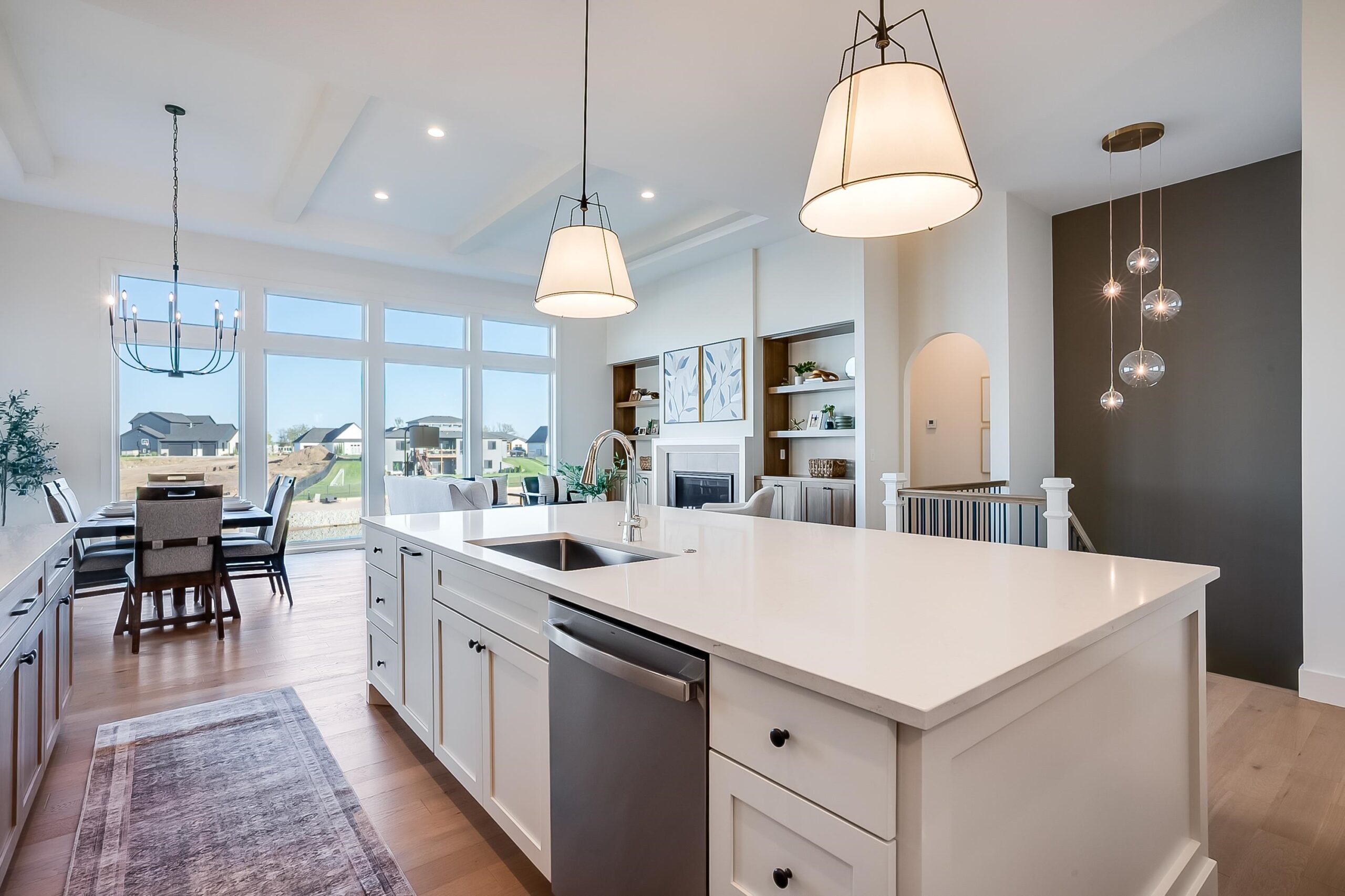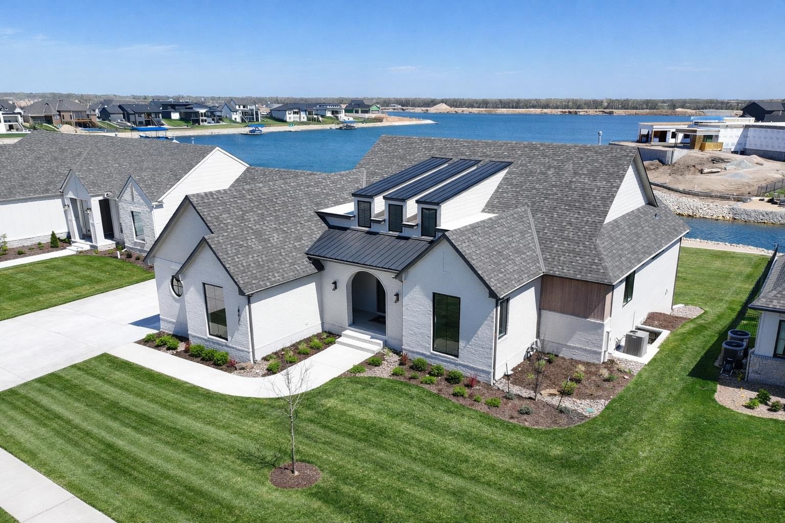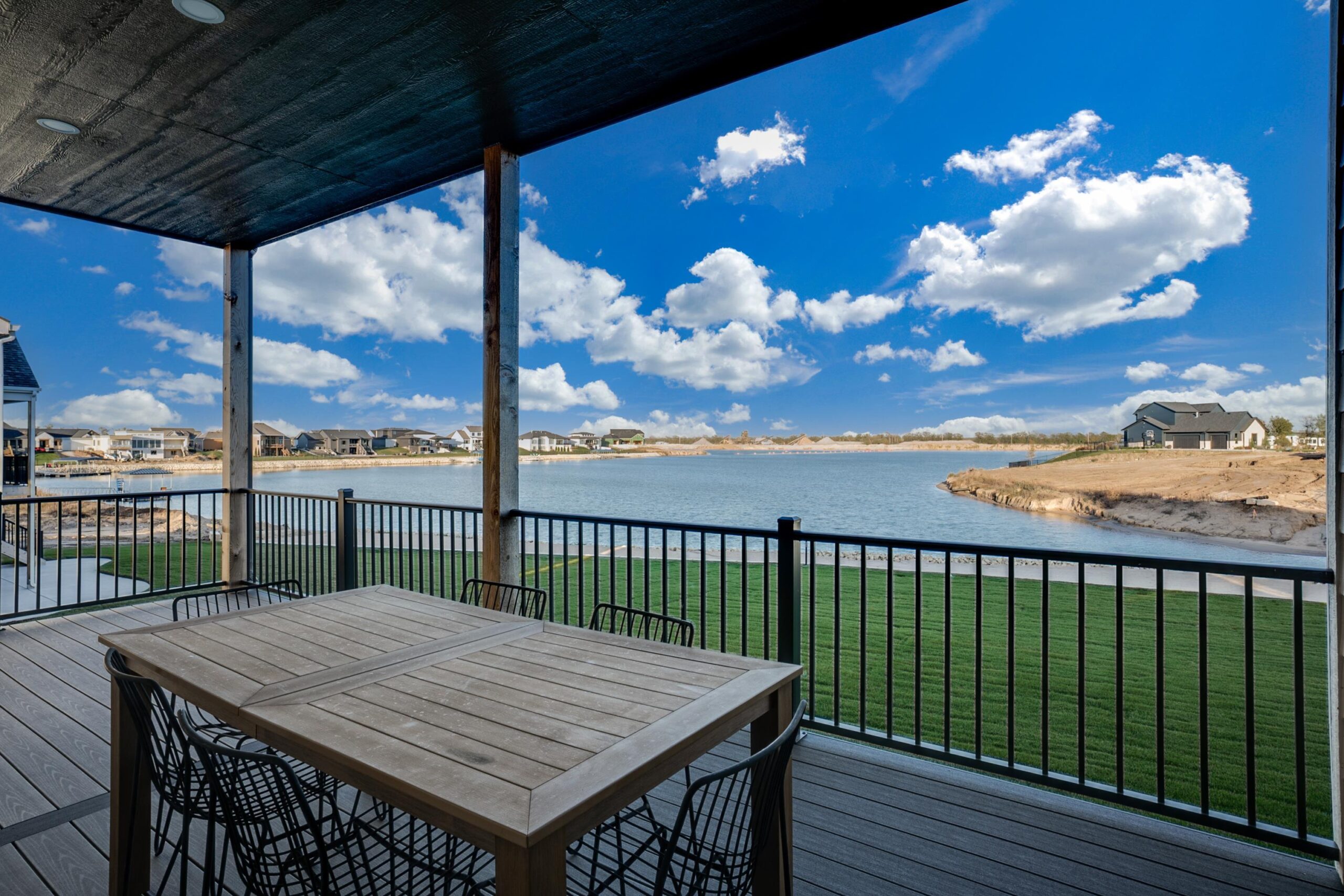 - Description: Welcome to The Linden Plan by Nies Homes—where luxury meets lake life in the exclusive Castaway community. Situated on a premium lakefront lot, this home boasts a timeless elevation with rich brick, wood accents, dormer windows, and an elegant arched entryway. Inside, you're greeted by soaring ceilings, a grand living room with floor-to-ceiling windows showcasing breathtaking water views, and a stunning fireplace flanked by custom built-ins. The gourmet kitchen features a 10’ island, gas range, double ovens, walk-in pantry, and endless cabinetry. The luxurious Master Suite includes a spacious bedroom, dual vanities, custom tile shower with dual heads, and a private dressing room. Main floor also offers two additional bedrooms with walk-in closets accompanied by a stylish hall bath, a private office, a convenient half bath for guests, and access to the covered deck. The walk-out basement impresses with 9' ceilings, expansive living space, game room with wet bar, two more large bedrooms, and two baths—one perfectly placed for easy access from your private beach. Step outside to your covered patio and enjoy direct access to the 140-acre spring-fed boating lake. Castaway offers unmatched amenities including a lakeside clubhouse, pool, playground, basketball court, and public beach areas. Live every day like a vacation—right here at Castaway. Some information may be estimated and is not guaranteed. Please verify schools with USD 266. Show all description