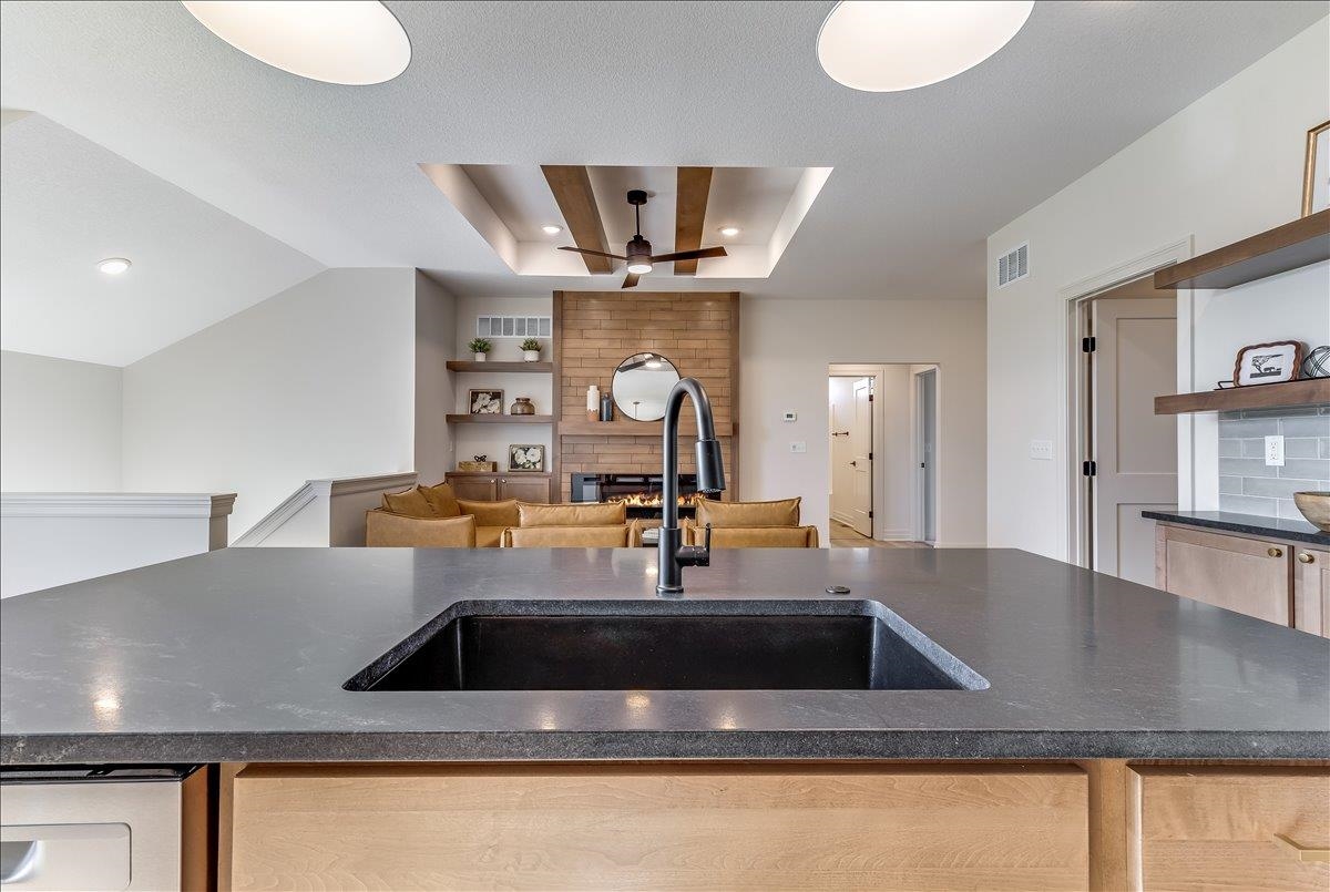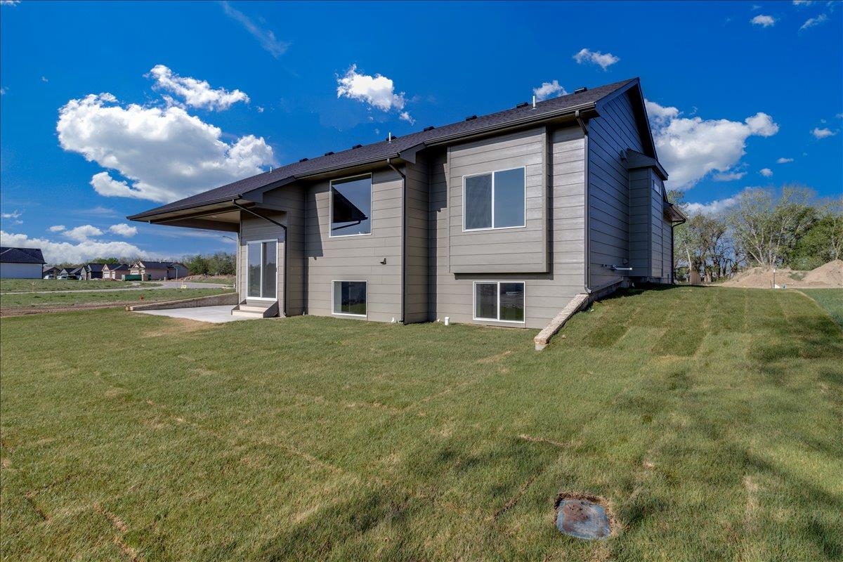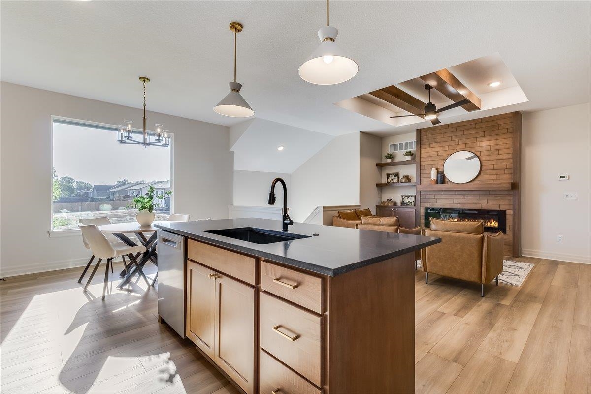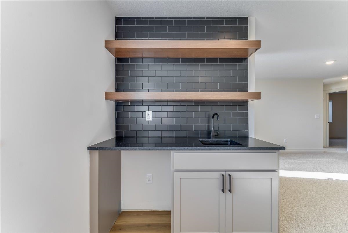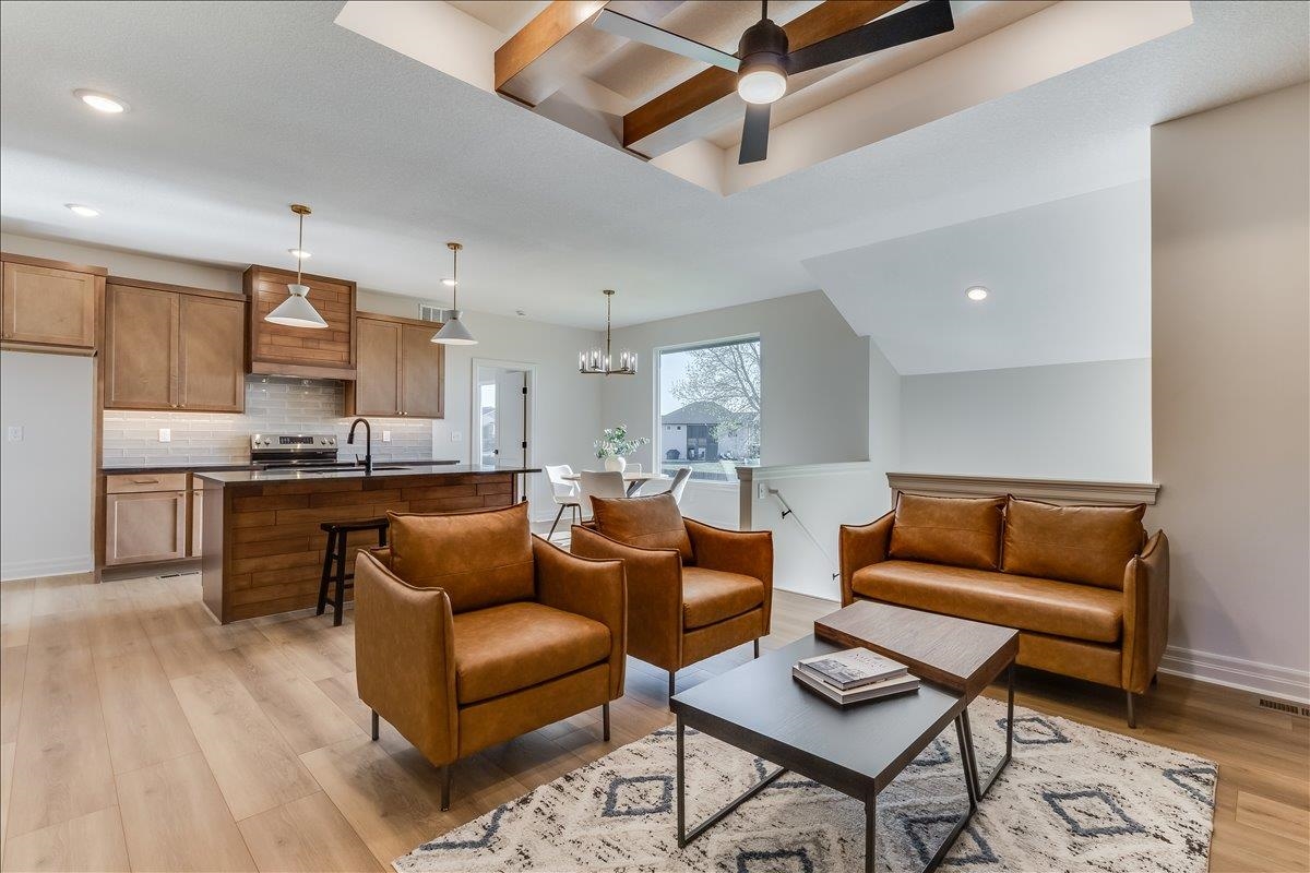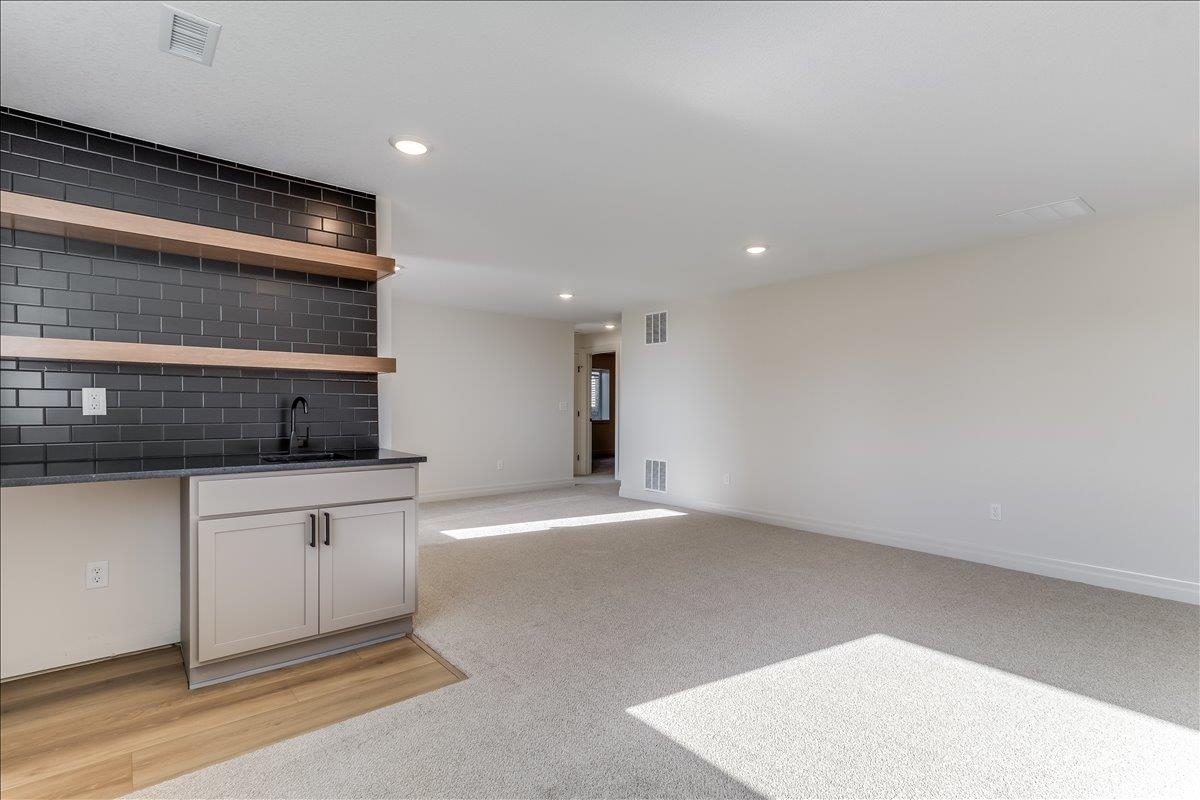 - Description: JK Blue Living presents the AVA mid level 6 bedroom home with full finished lower level, great room design with decorative electrict fireplace, LVP floooring great room, kitchen and dining and quartz counter tops, beamed ceilings, walk in pantry, and main floor utility. The lower level has a finished rec room with wet bar, bath and 3 bedrooms. The mid level patio is covered and great for outdoor living. The home offers a 3 car garage as well. The home includes sprinkler system, sod and some landscaping. Show all description