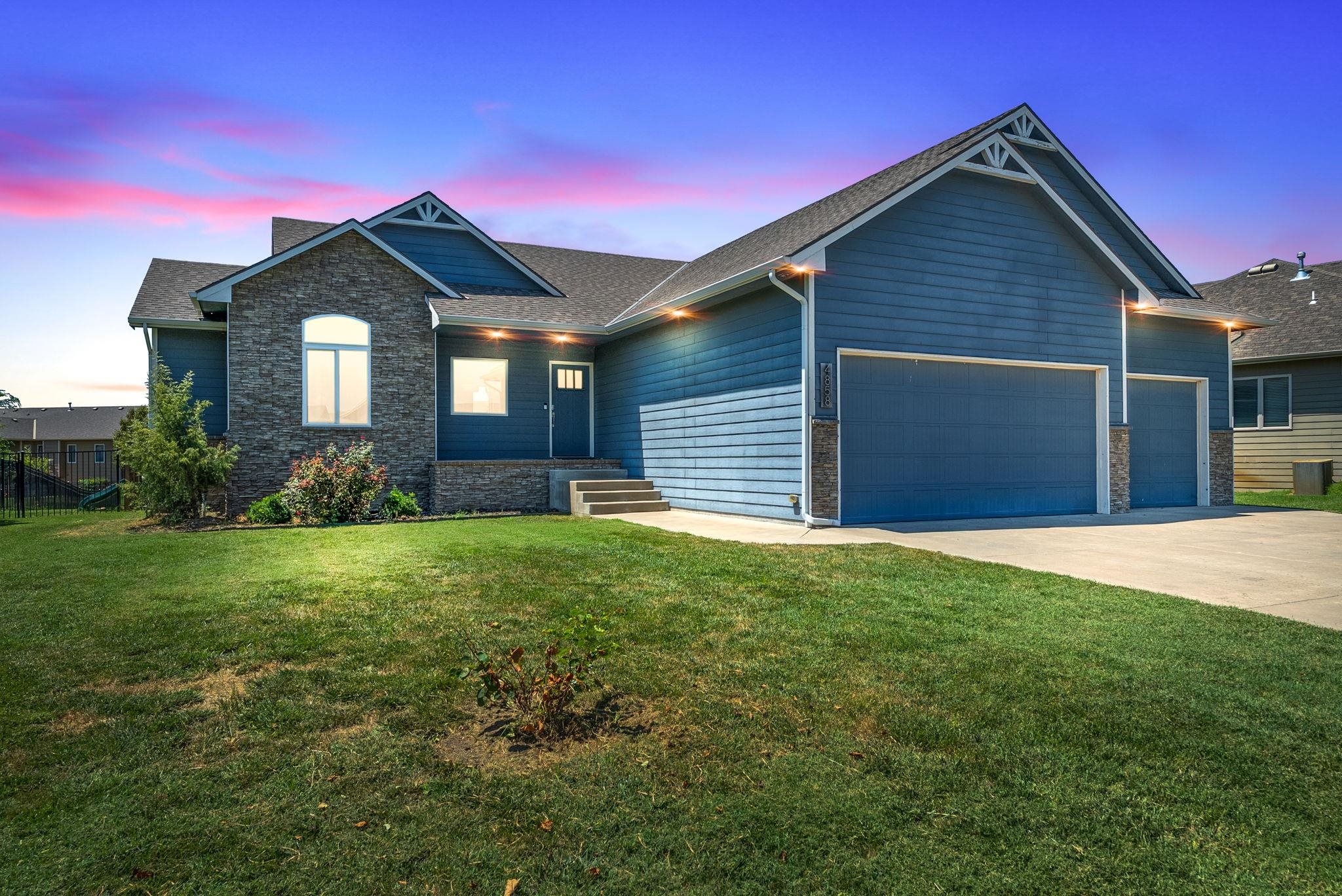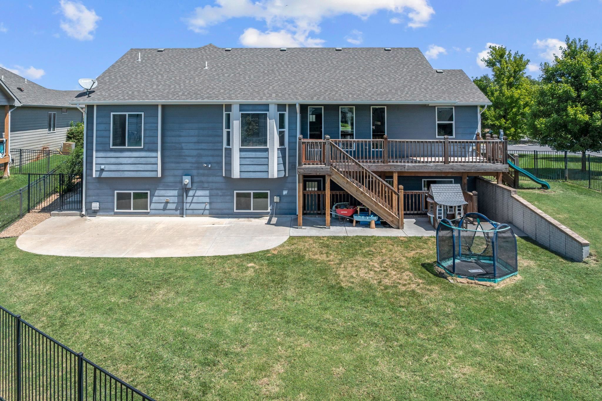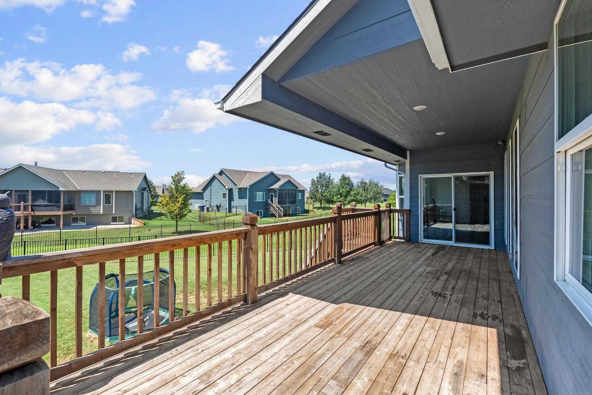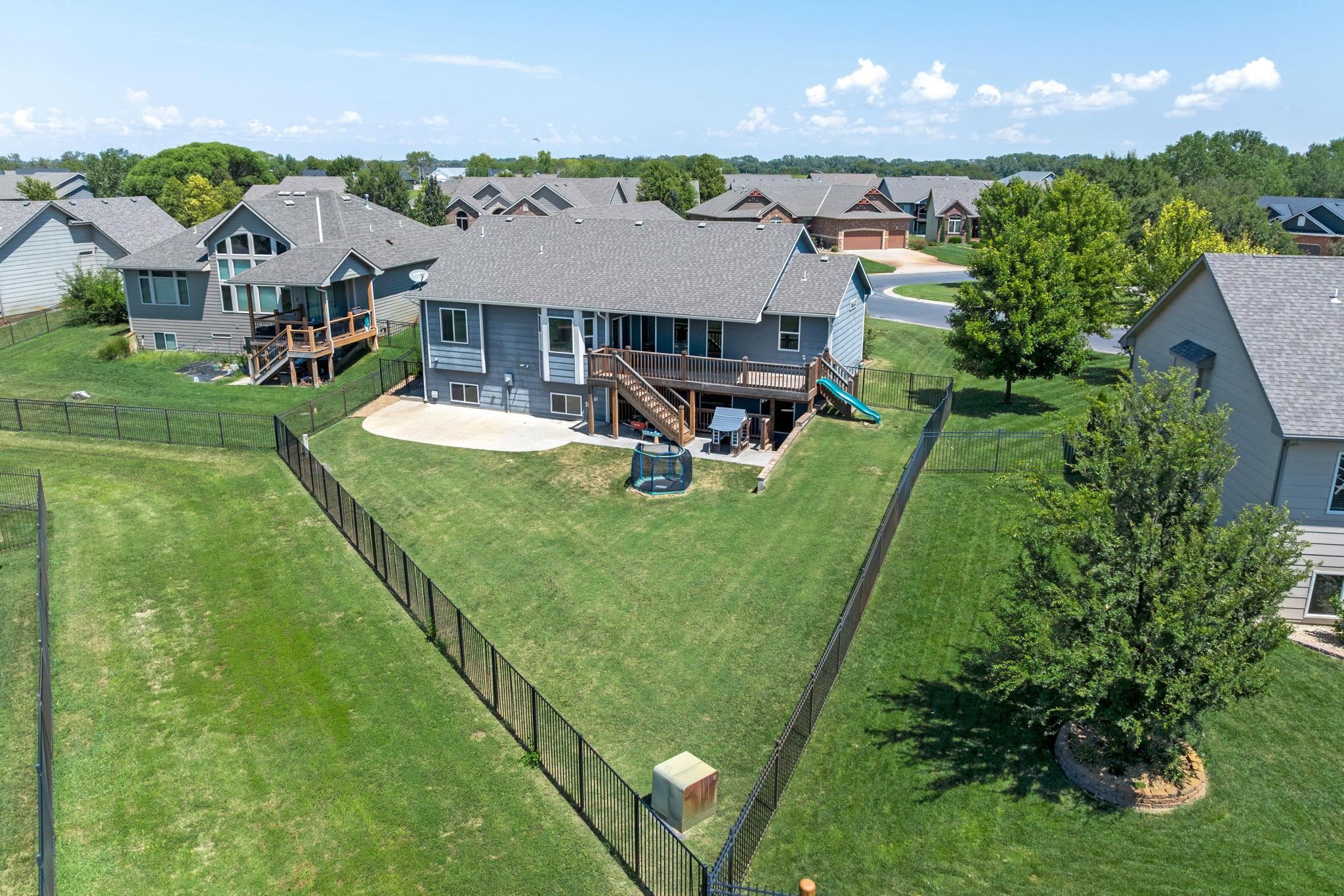 - Description: Welcome to this stunning 6-bedroom, 3-bathroom home offering nearly 3, 000 square feet of bright and functional living space, perfectly situated on a large cul-de-sac lot in Emerald Springs. Step inside to discover a bright and airy open-concept layout with soaring vaulted ceilings, tall picture windows, and natural light pouring in throughout. The spacious living area flows seamlessly into a stylish kitchen, ideal for both everyday living and entertaining. The main-floor primary suite is a true retreat—featuring a spa-like ensuite with a large walk-in shower, separate soaking tub, dual vanities, and two walk-in closets. You'll also love the convenience of the connected main-floor laundry. Two additional bedrooms and a full bath complete the main level. Downstairs, the walk-out basement impresses with a generous family room, custom built-ins, a wet bar, and oversized windows that let in tons of natural light. You'll find three more bedrooms and a full bath—perfect for guests, teens, or home office setups. Enjoy outdoor living on the huge covered deck or entertain on the spacious backyard patio. A wrought iron fence surrounds the beautifully maintained yard, offering privacy and style. All of this is located in the highly sought-after Maize School District, just minutes from major highways, shopping, and restaurants. Don't miss your chance to call this incredible home yours—schedule your private showing today! Show all description