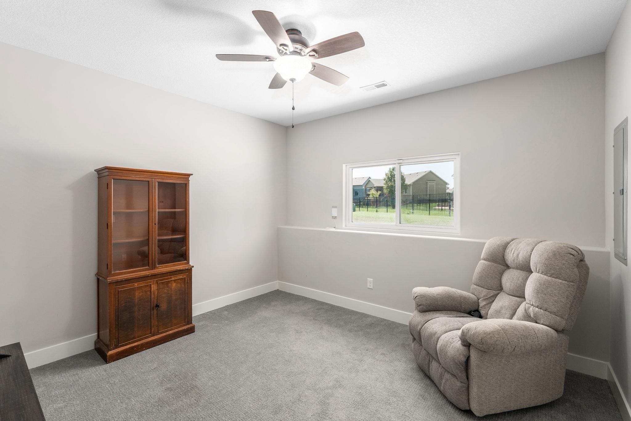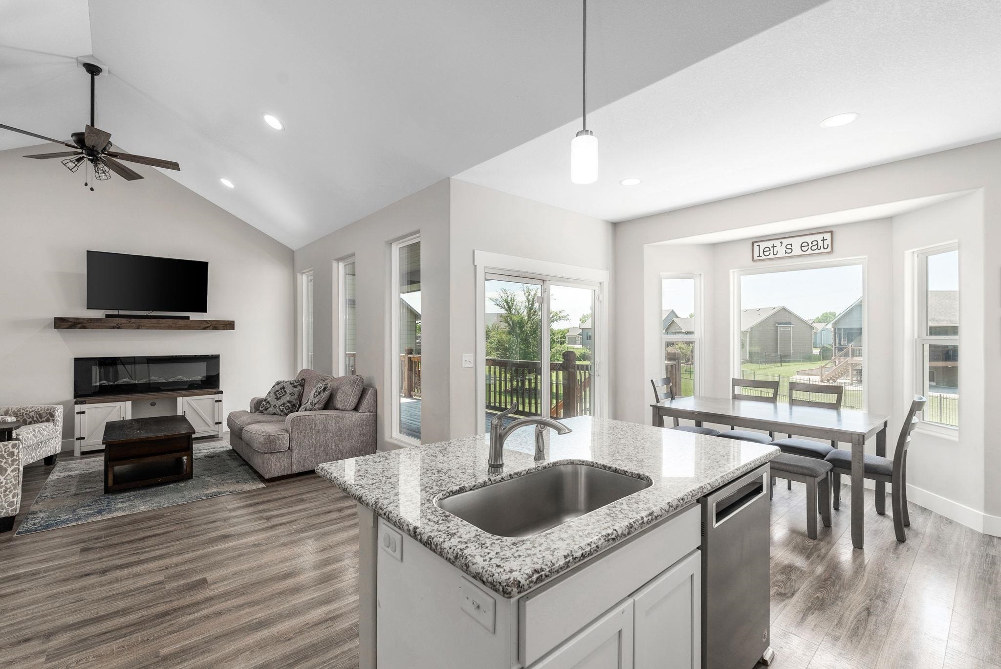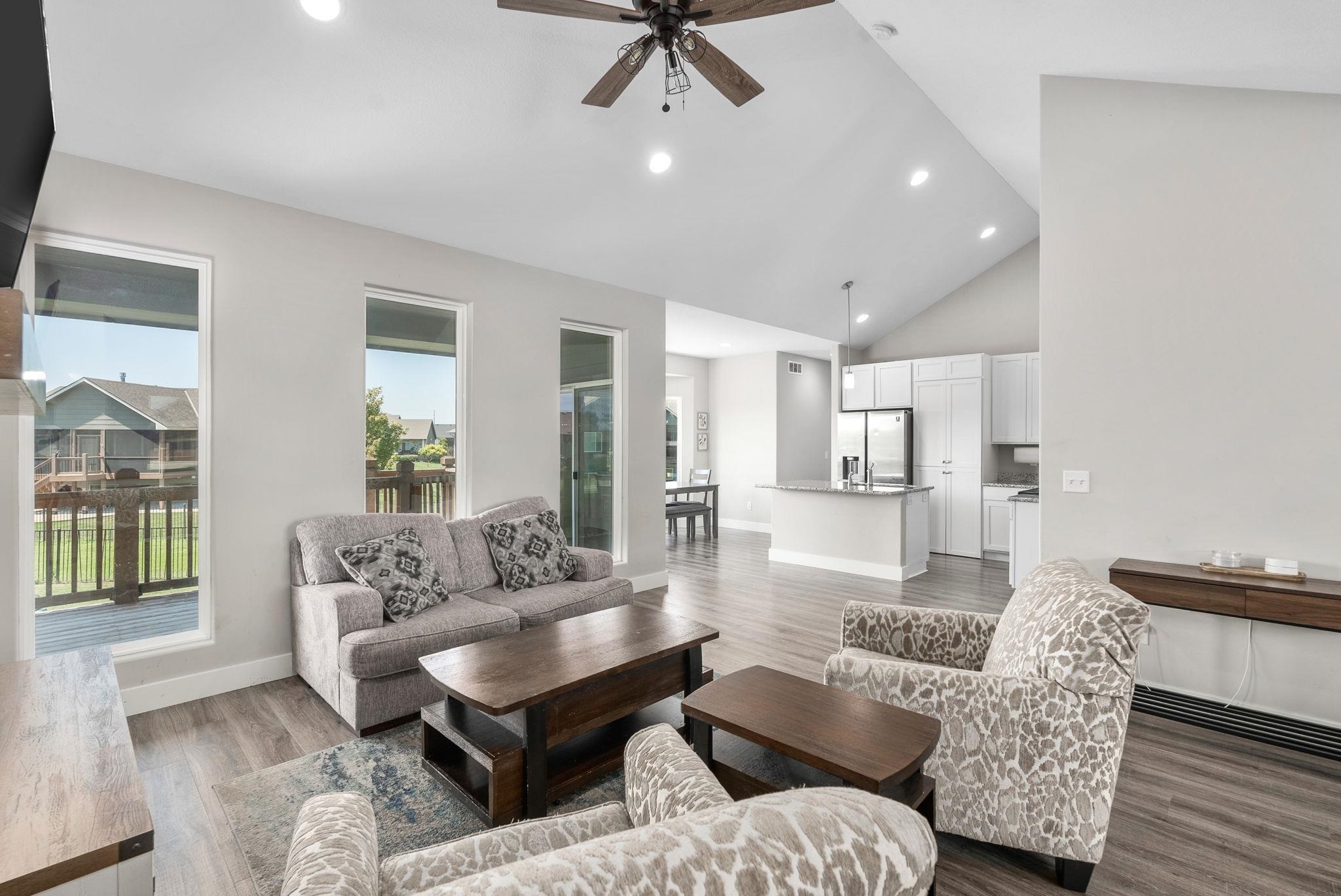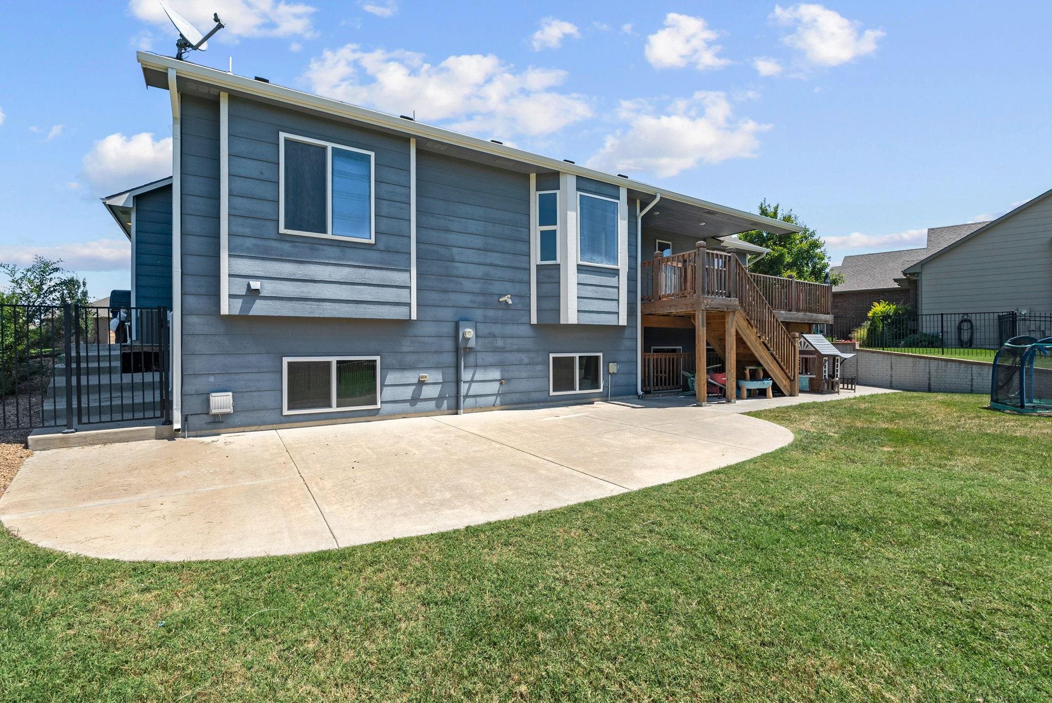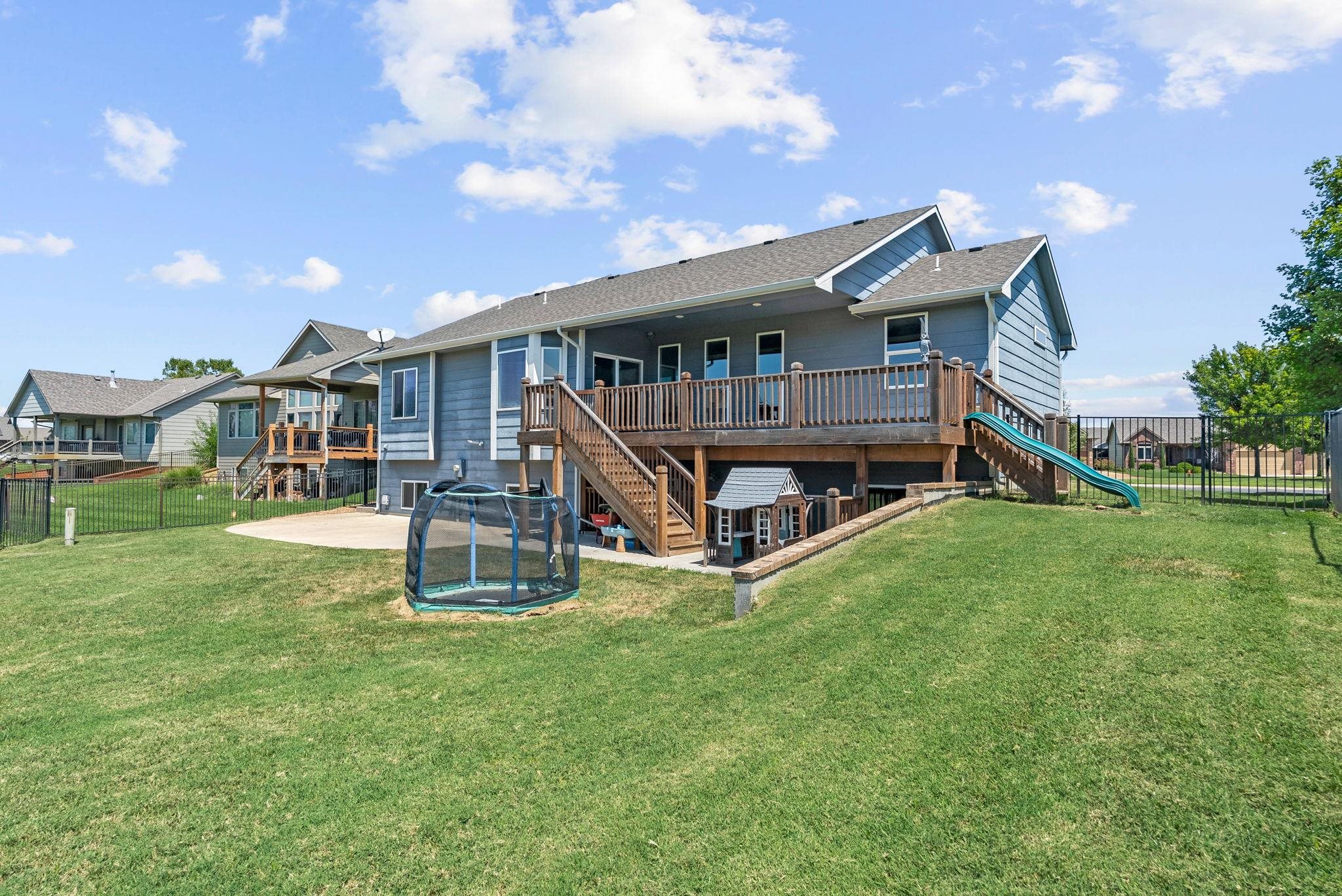 - Description: Welcome to this stunning 6-bedroom, 3-bathroom home offering nearly 3, 000 square feet of bright and functional living space, perfectly situated on a large cul-de-sac lot in Emerald Springs. Step inside to discover a bright and airy open-concept layout with soaring vaulted ceilings, tall picture windows, and natural light pouring in throughout. The spacious living area flows seamlessly into a stylish kitchen, ideal for both everyday living and entertaining. The main-floor primary suite is a true retreat—featuring a spa-like ensuite with a large walk-in shower, separate soaking tub, dual vanities, and two walk-in closets. You'll also love the convenience of the connected main-floor laundry. Two additional bedrooms and a full bath complete the main level. Downstairs, the walk-out basement impresses with a generous family room, custom built-ins, a wet bar, and oversized windows that let in tons of natural light. You'll find three more bedrooms and a full bath—perfect for guests, teens, or home office setups. Enjoy outdoor living on the huge covered deck or entertain on the spacious backyard patio. A wrought iron fence surrounds the beautifully maintained yard, offering privacy and style. All of this is located in the highly sought-after Maize School District, just minutes from major highways, shopping, and restaurants. Don't miss your chance to call this incredible home yours—schedule your private showing today! Show all description