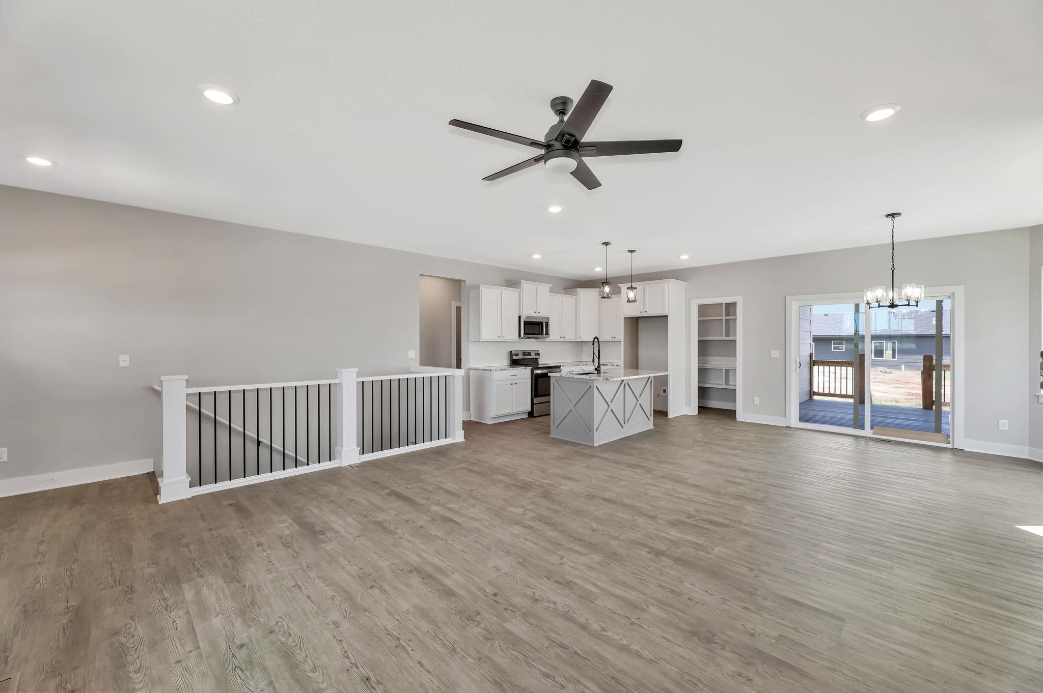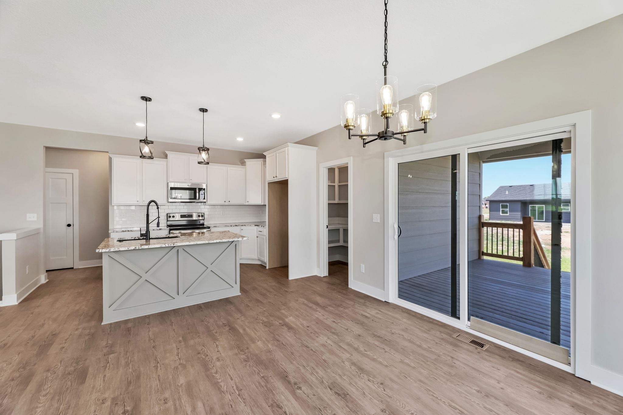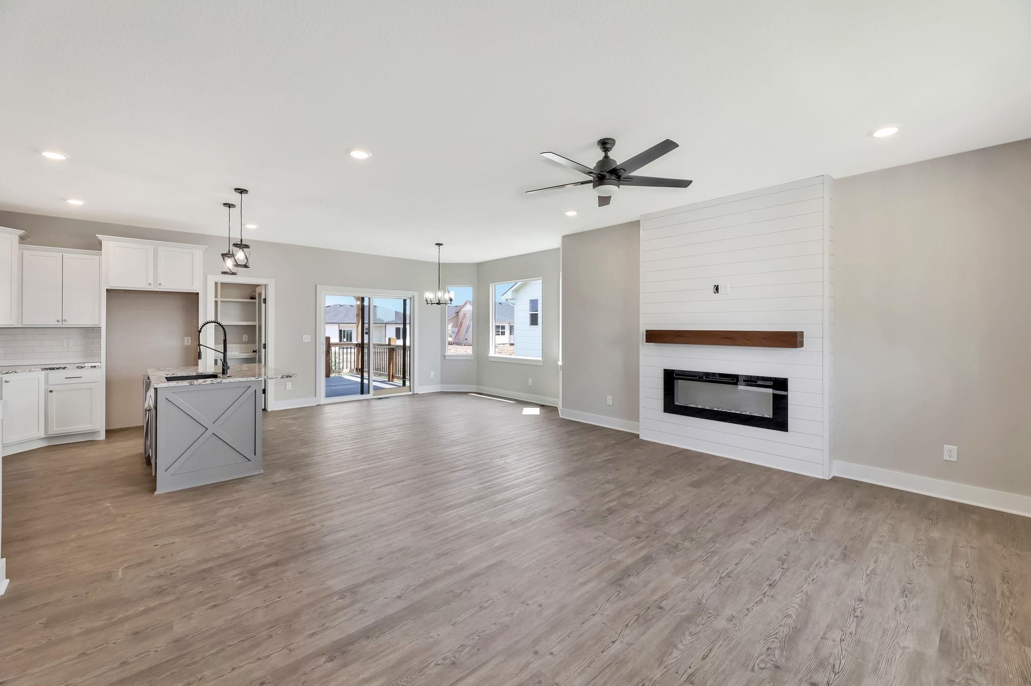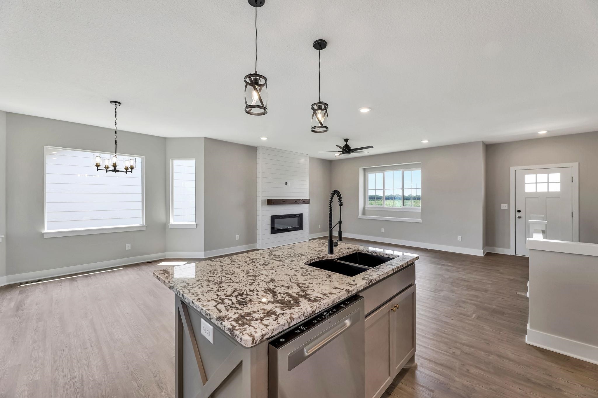 - Description: You will love this plan located in Trinity Point 2nd Addition, just south on Hoover from MacArthur! 2442 sq. ft. 4 bedrooms, 3 baths with a 3-car tandem garage. Interior features include luxury vinyl tile flooring, 50 inch electric fireplace in liv.rm. with shiplap surround, white trim and doors, 9 ft. ceilings with vaulted in the master, dining and living room. Kitchen features hidden walk-in pantry, eating island and stainless steel dishwasher, microwave and stove. 12x12 covered wood deck off dining room. Master suite includes a 5 ft. subway tiled shower. Granite countertops in kitchen and baths. Fully finished basement includes 2 additional bedrooms, 1 bath and a family room. Enjoy the landscaped yard with sprinkler system. Specials are only $135 per month. Future HOA to be determined. Listing agent related to builder. Show all description