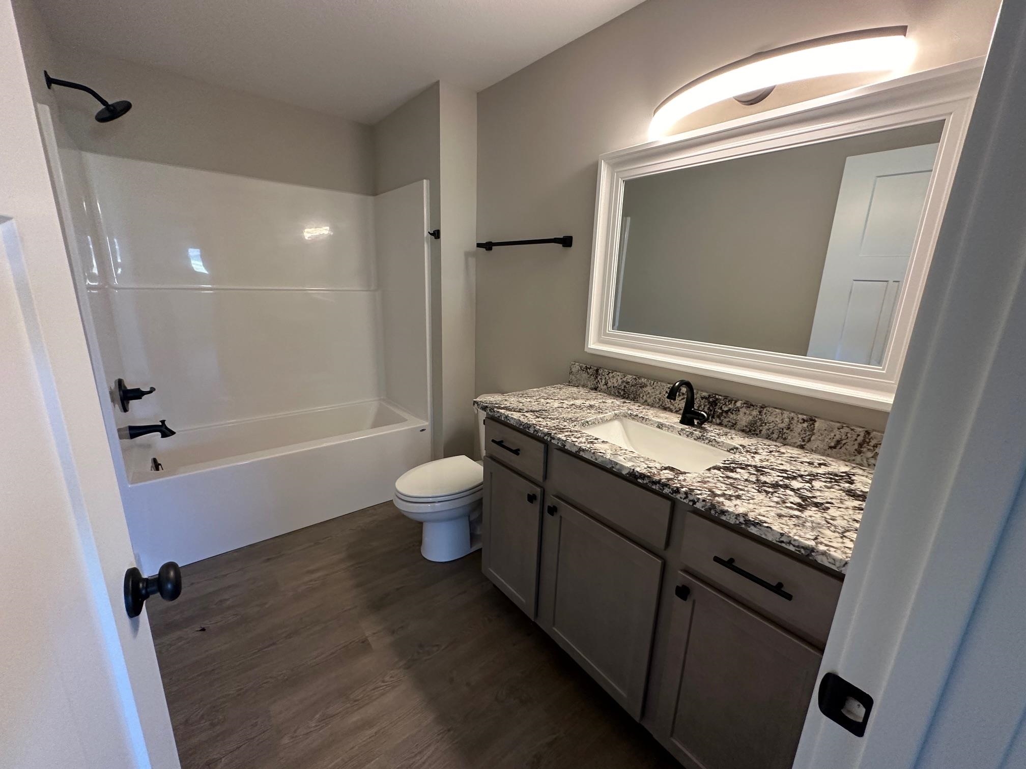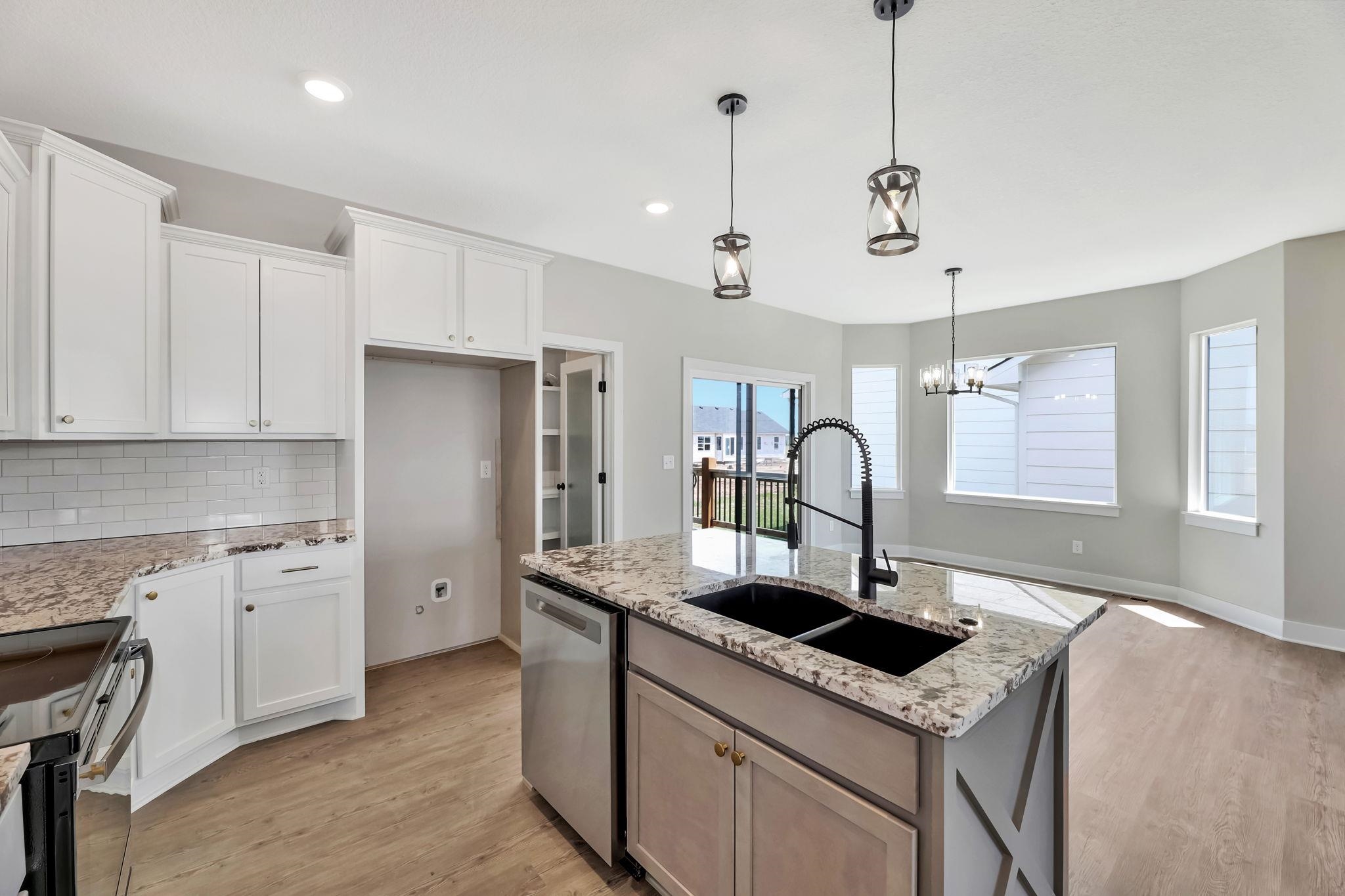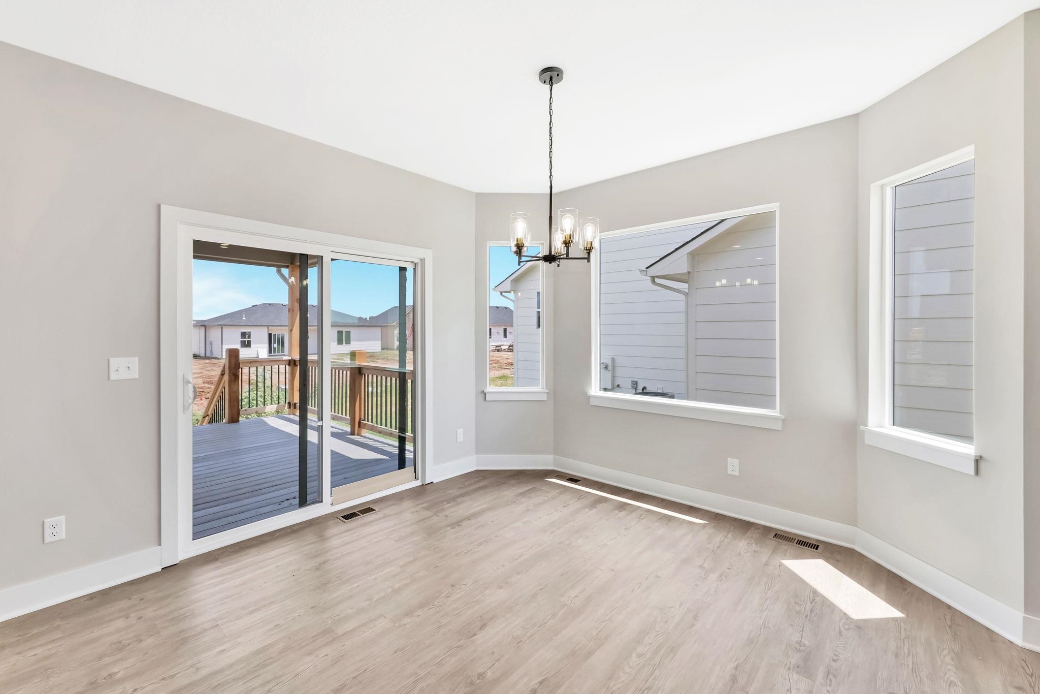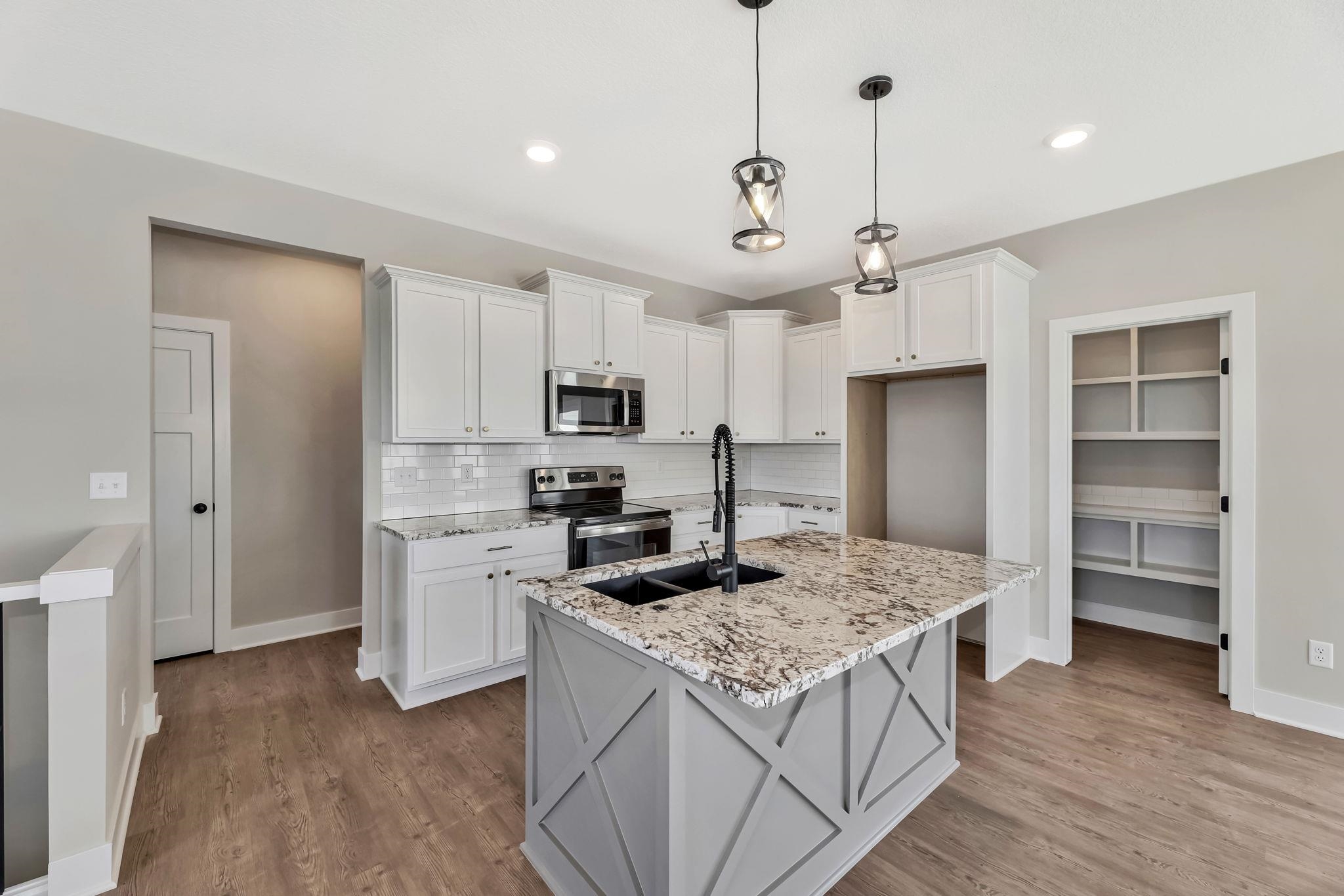 - Description: You will love this plan located in Trinity Point 2nd Addition, just south on Hoover from MacArthur! 2442 sq. ft. 4 bedrooms, 3 baths with a 3-car tandem garage. Interior features include luxury vinyl tile flooring, 50 inch electric fireplace in liv.rm. with shiplap surround, white trim and doors, 9 ft. ceilings with vaulted in the master, dining and living room. Kitchen features hidden walk-in pantry, eating island and stainless steel dishwasher, microwave and stove. 12x12 covered wood deck off dining room. Master suite includes a 5 ft. subway tiled shower. Granite countertops in kitchen and baths. Fully finished basement includes 2 additional bedrooms, 1 bath and a family room. Enjoy the landscaped yard with sprinkler system. Specials are only $135 per month. Future HOA to be determined. Listing agent related to builder. Show all description