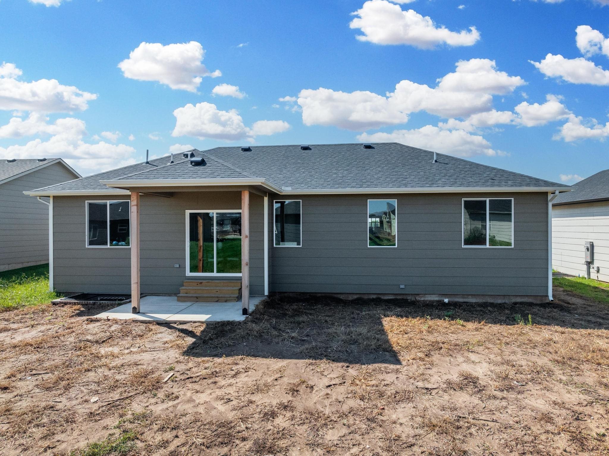 - Exterior Amenities: Guttering - ALL, Landscaping Not Included, Frame w/Less than 50% Mas