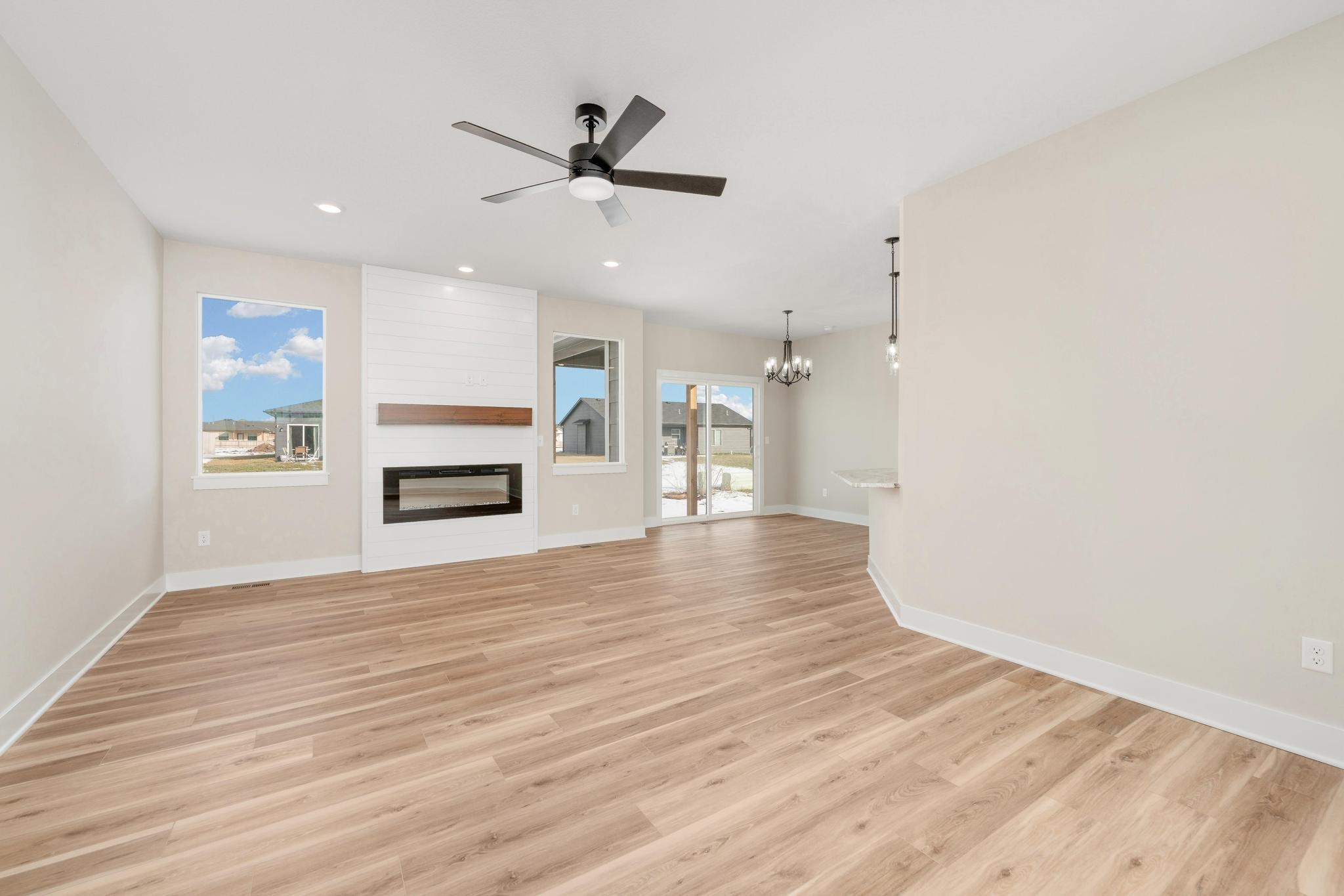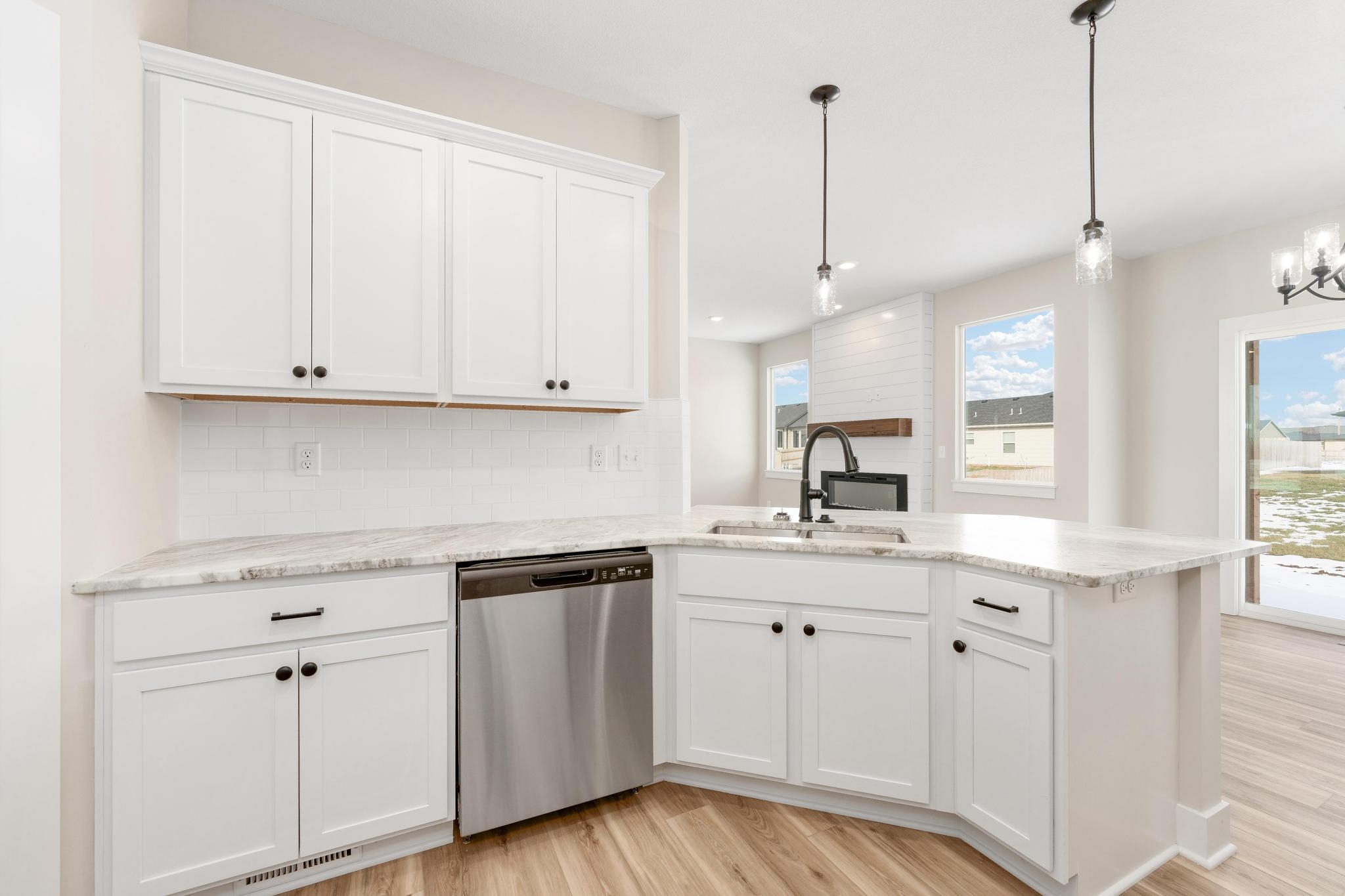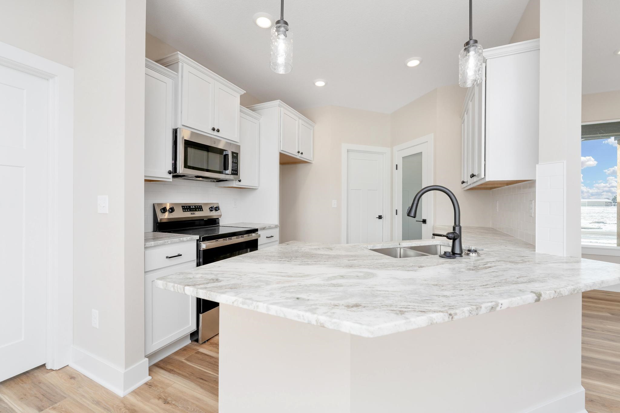 - Description: Come explore this gorgeous new home in Trinity Point Addition! This property offers 3 bedrooms and 2 baths, 1379 sq.ft, unfin.basement along with a spacious 3-car garage and 9 ft. ceilings. Inside, you'll find an inviting open living area featuring a 50-inch electric fireplace and stylish LVP flooring throughout. The kitchen is a chef’s dream, equipped with stainless steel appliances, including a microwave, dishwasher, and range oven. Offers a walk-in pantry and quartz countertops. Adjacent to the dining area is a lovely covered patio, perfect for outdoor entertaining. The thoughtful split-bedroom layout provides added privacy, with the master suite that has a walk-in closet. The master bath features a tiled shower, double sinks, and elegant quartz countertops. Main floor laundry included. Two additional bedrooms share a hall bath. For even more space, consider the basement finish options, which could include an additional 2 bedrooms, 1 bath, and a family room. With a covered porch and patio, outdoor living is made easy and enjoyable. Special taxes at only $139 per month. Options subject to change without notice. Don’t miss your chance to make it yours! This property has been virtually staged. Show all description