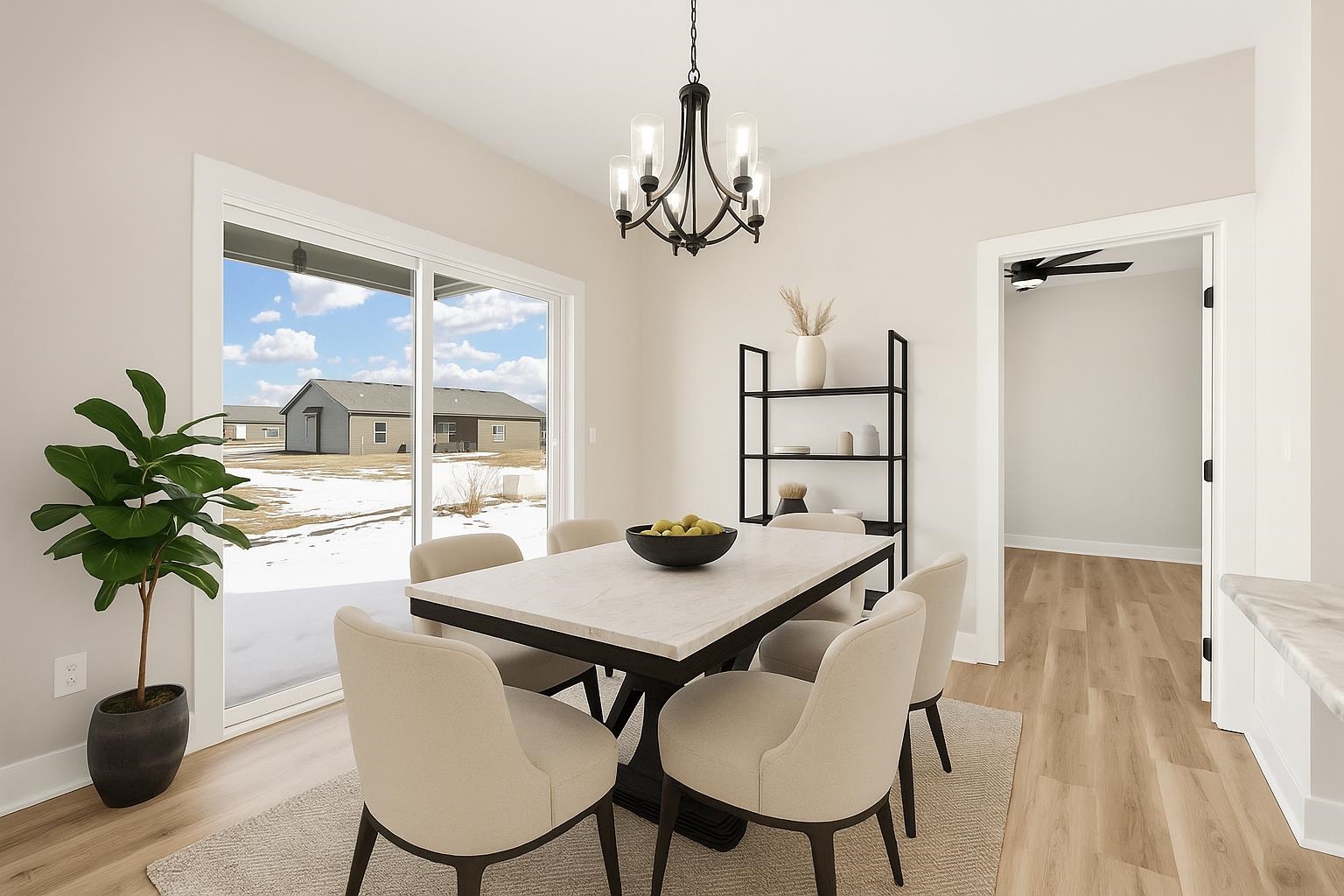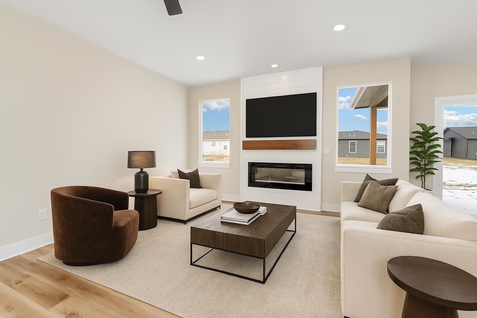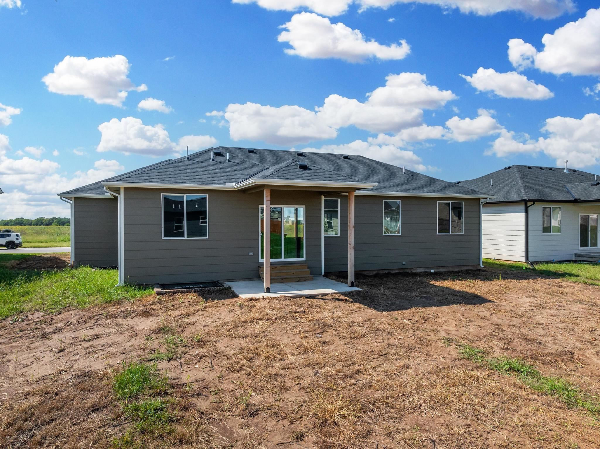 - Description: Come explore this gorgeous new home in Trinity Point Addition! This property offers 3 bedrooms and 2 baths, 1379 sq.ft, unfin.basement along with a spacious 3-car garage and 9 ft. ceilings. Inside, you'll find an inviting open living area featuring a 50-inch electric fireplace and stylish LVP flooring throughout. The kitchen is a chef’s dream, equipped with stainless steel appliances, including a microwave, dishwasher, and range oven. Offers a walk-in pantry and quartz countertops. Adjacent to the dining area is a lovely covered patio, perfect for outdoor entertaining. The thoughtful split-bedroom layout provides added privacy, with the master suite that has a walk-in closet. The master bath features a tiled shower, double sinks, and elegant quartz countertops. Main floor laundry included. Two additional bedrooms share a hall bath. For even more space, consider the basement finish options, which could include an additional 2 bedrooms, 1 bath, and a family room. With a covered porch and patio, outdoor living is made easy and enjoyable. Special taxes at only $139 per month. Options subject to change without notice. Don’t miss your chance to make it yours! This property has been virtually staged. Show all description