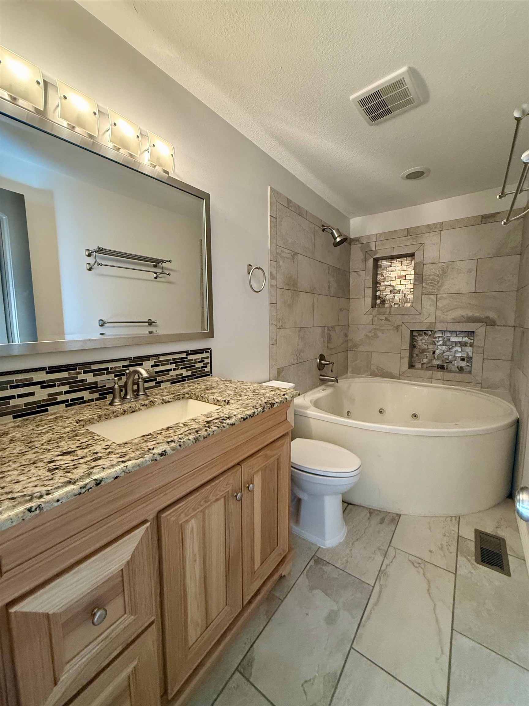 - Description: Charming 2 bedroom located on a corner lot. This home has an updated kitchen with granite, tile flooring, all new wood cabinets and stainless appliances. Original hardwood flooring in living room opening up to a large dining room area. Bathroom has been completely updated with granite, tile flooring, new vanity and jacuzzi soaker tub. Large corner lot with side drive parking and fully fenced yard. The backyard has a large patio with seating and shed. Show all description