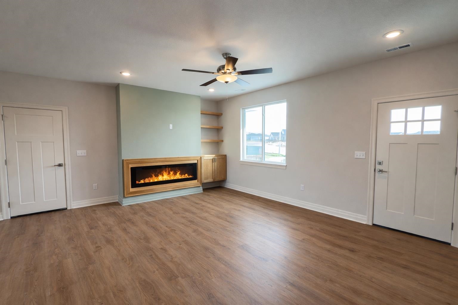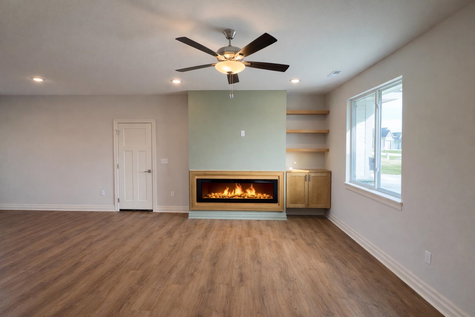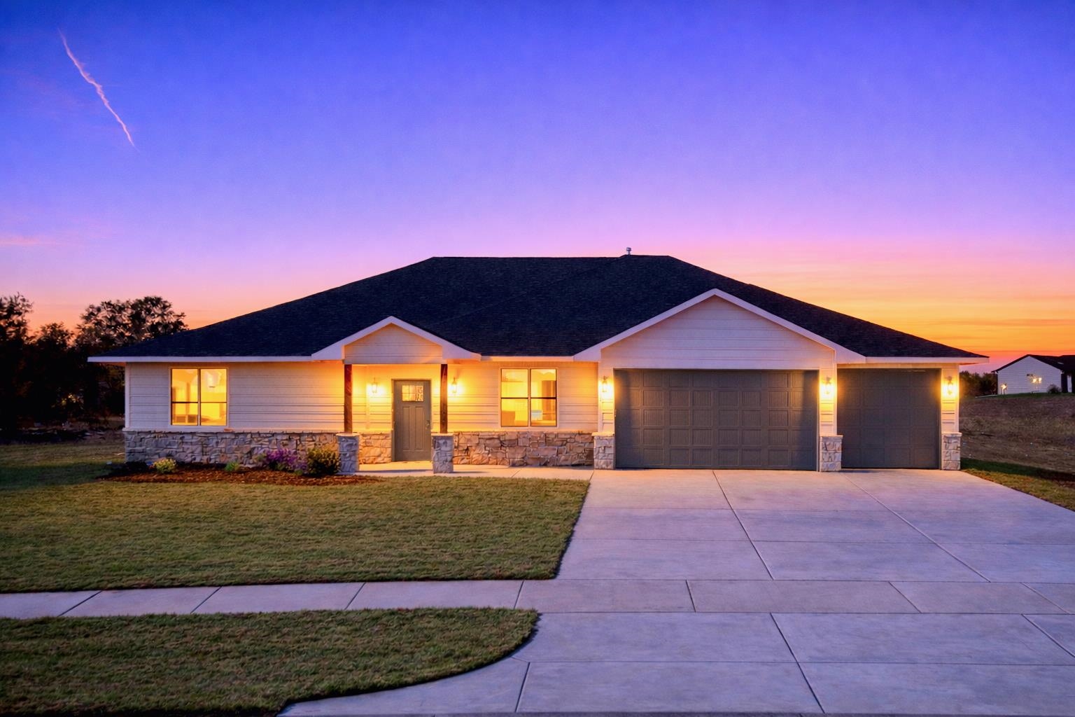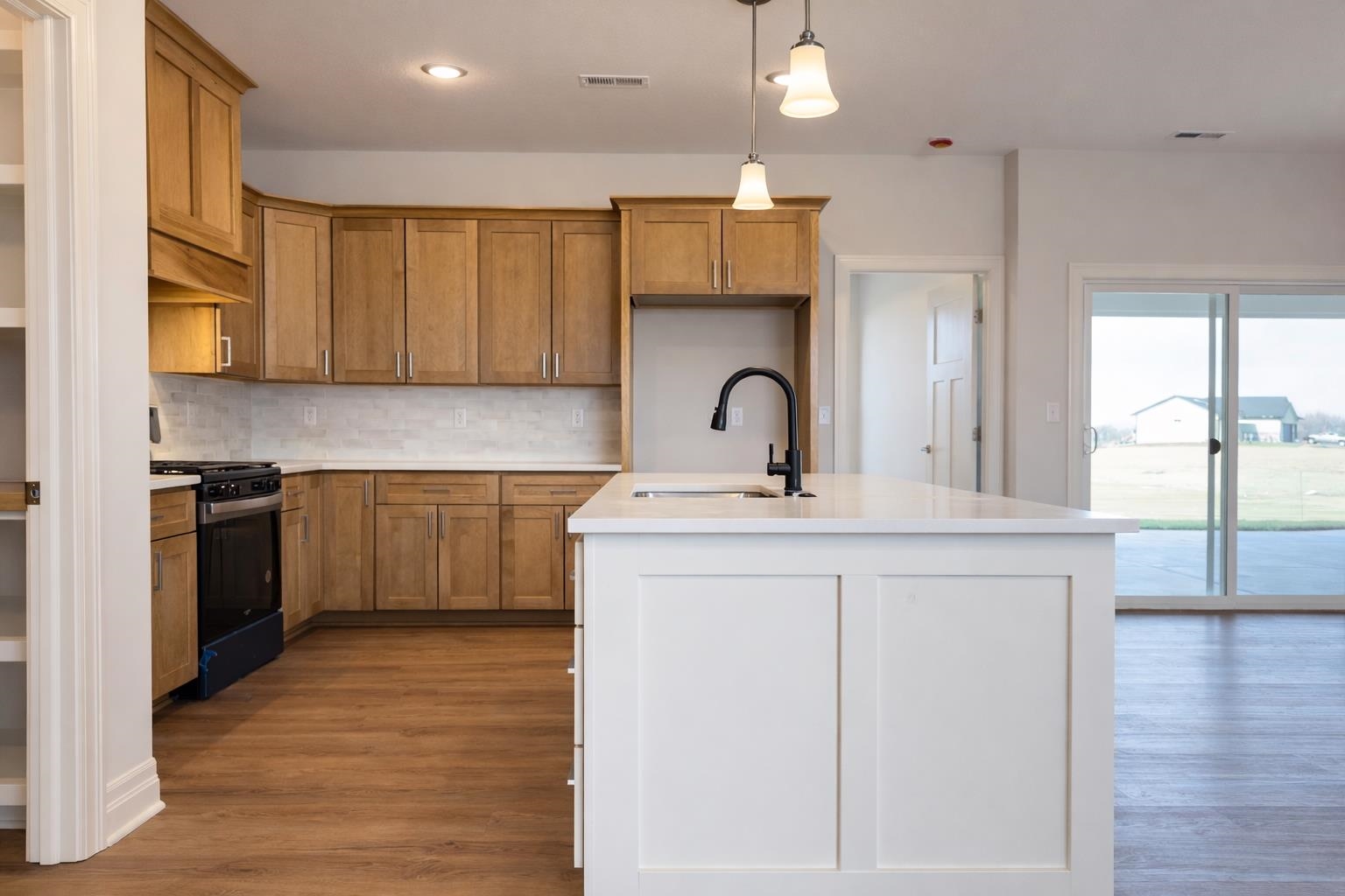 - Description: The Willow Plan by RJ Castle Custom Homes is a newly finished zero-entry home designed with comfort, accessibility, and everyday living in mind. Situated on a spacious half-acre lot with no rear neighbors, this home offers privacy, functionality, and room to breathe—all in the desirable Watermarke community. Inside, you’ll find a spacious living room featuring a cozy fireplace, built-in cabinets, and floating shelves, seamlessly flowing into a well-equipped kitchen with quartz countertops, gas range, large center island, walk-in pantry, and abundant cabinet space. The generous dining area provides plenty of room to expand your table, making it ideal for hosting family gatherings and entertaining friends. The luxurious primary suite includes a large bedroom with a beamed ceiling, private bath, and walk-in closet. Two additional spacious bedrooms—each with its own walk-in closet—share a full hall bath with quartz countertops. A separate laundry room offers built-in storage shelves and a folding table for added convenience. Enjoy outdoor living on the large, fully covered patio, which could easily be screened in the future. The massive 3-car tandem garage is a standout feature, complete with a separate walk-out door providing direct access to the patio—perfect for a workshop, extra storage, gardening gear, or even hosting legendary garage parties. Available now in Watermarke—don’t miss your opportunity to own this thoughtfully designed, move-in-ready home! Some information may be estimated and is not guaranteed. Please verify schools with USD 262. Show all description