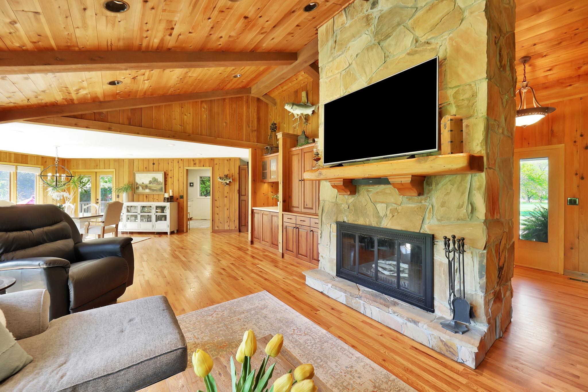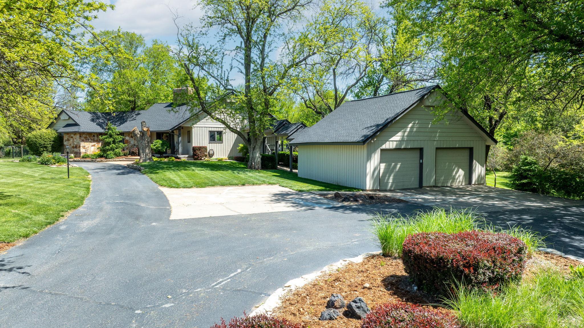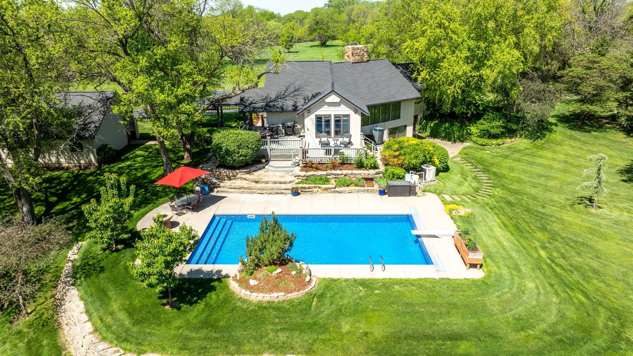 - Description: Welcome to this stunning 3, 618 sq ft rustic lodge-style home nestled on 9.5 secluded acres, where natural beauty meets thoughtful renovation. Located just minutes from town, this move-in ready property is perfect for those who desire peaceful country living without sacrificing convenience. The home has been meticulously updated, starting with a 3-year-old high-impact roof, fresh interior and exterior paint, modern lighting throughout, and a recently resurfaced private road. A covered walkway connects the home to a spacious, oversized 2-car garage, with an additional storage shed nearby for all your tools, toys, or hobby needs. Step outside to enjoy a resort-like setting featuring a beautiful saltwater in-ground pool complete with a new liner, pool cover, diving board, and water fountain—all surrounded by a generous deck perfect for entertaining or relaxing. The property is dotted with mature trees and fully enclosed on the north side with a wrought iron fence for added privacy and charm. Nature lovers will be enchanted by the fully stocked pond filled with bass, crappie, and bluegill, and it’s common to see deer and wild turkey roaming the grounds. For those with a green thumb or a passion for homegrown produce, the land boasts a mini orchard with apple, Bing cherry, peach, pear, and nectarine trees, as well as a variety of berry bushes—blackberry, raspberry, and strawberry—and thriving tomato plants. Inside, the home welcomes you with huge windows offering panoramic views of the wooded landscape and flowering gardens, filling each room with natural light. The interior exudes rustic elegance, with soaring cedar wood vaulted ceilings, a large open-concept kitchen featuring built-in pantries, and a main-level bar area ideal for hosting. The expansive dining area flows directly onto the rear deck, making indoor-outdoor gatherings effortless. The floor plan includes two spacious bedrooms upstairs and two-plus bedrooms downstairs, along with a walk-out basement family room that opens directly to the backyard. The primary suite is generously sized, offering a walk-in closet as well as a secondary closet within the bedroom itself. Whether you're gathering with friends, enjoying a quiet morning by the pond, or growing your own fruit and vegetables, this one-of-a-kind home offers a unique blend of comfort, privacy, and natural splendor. Don’t miss your chance to live the country lifestyle in a beautifully updated home, close to all the amenities of town. Show all description