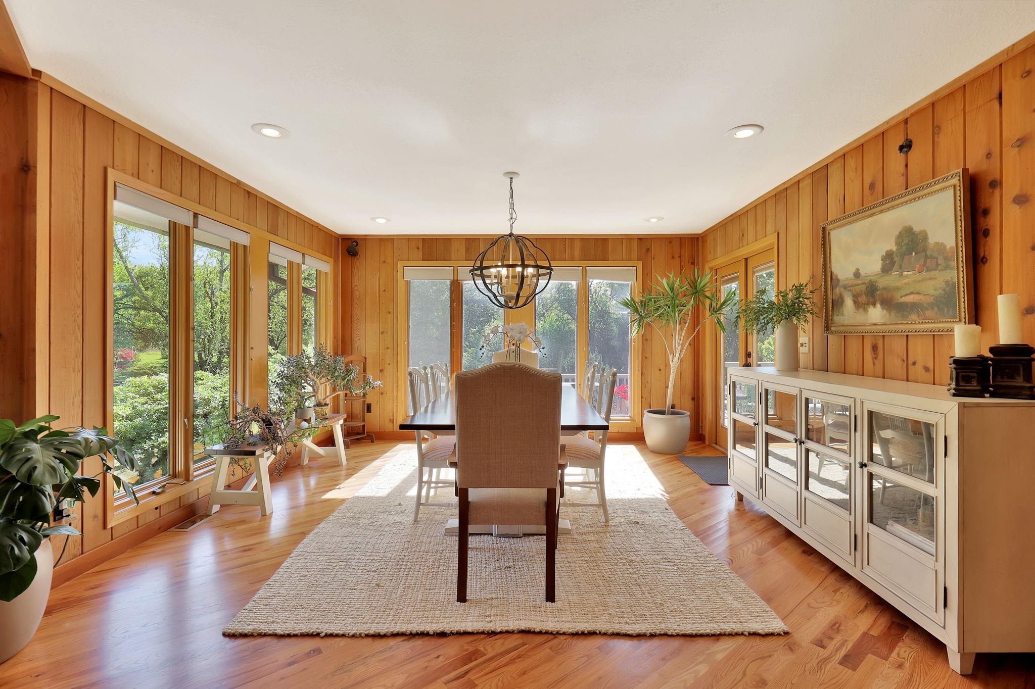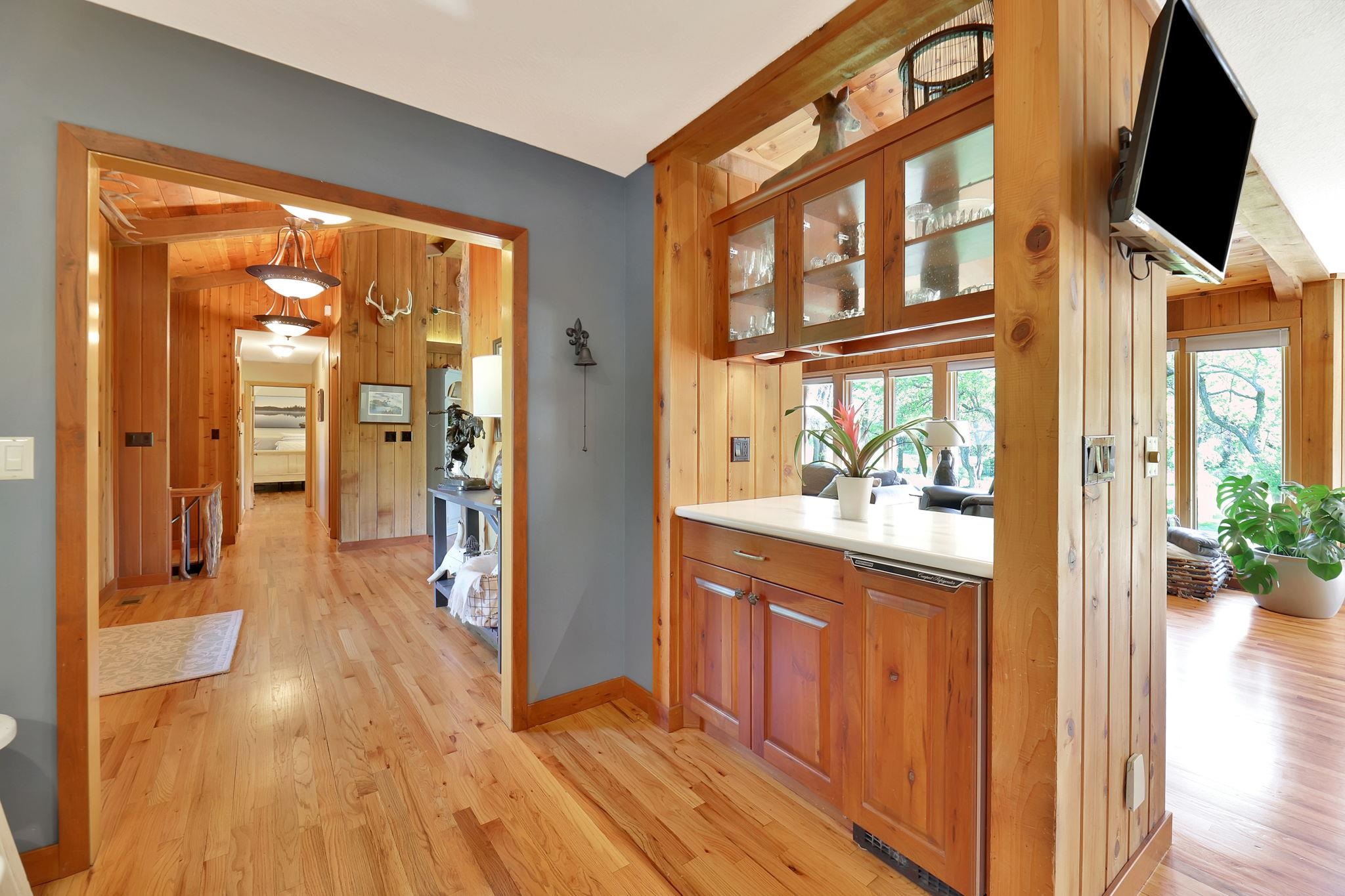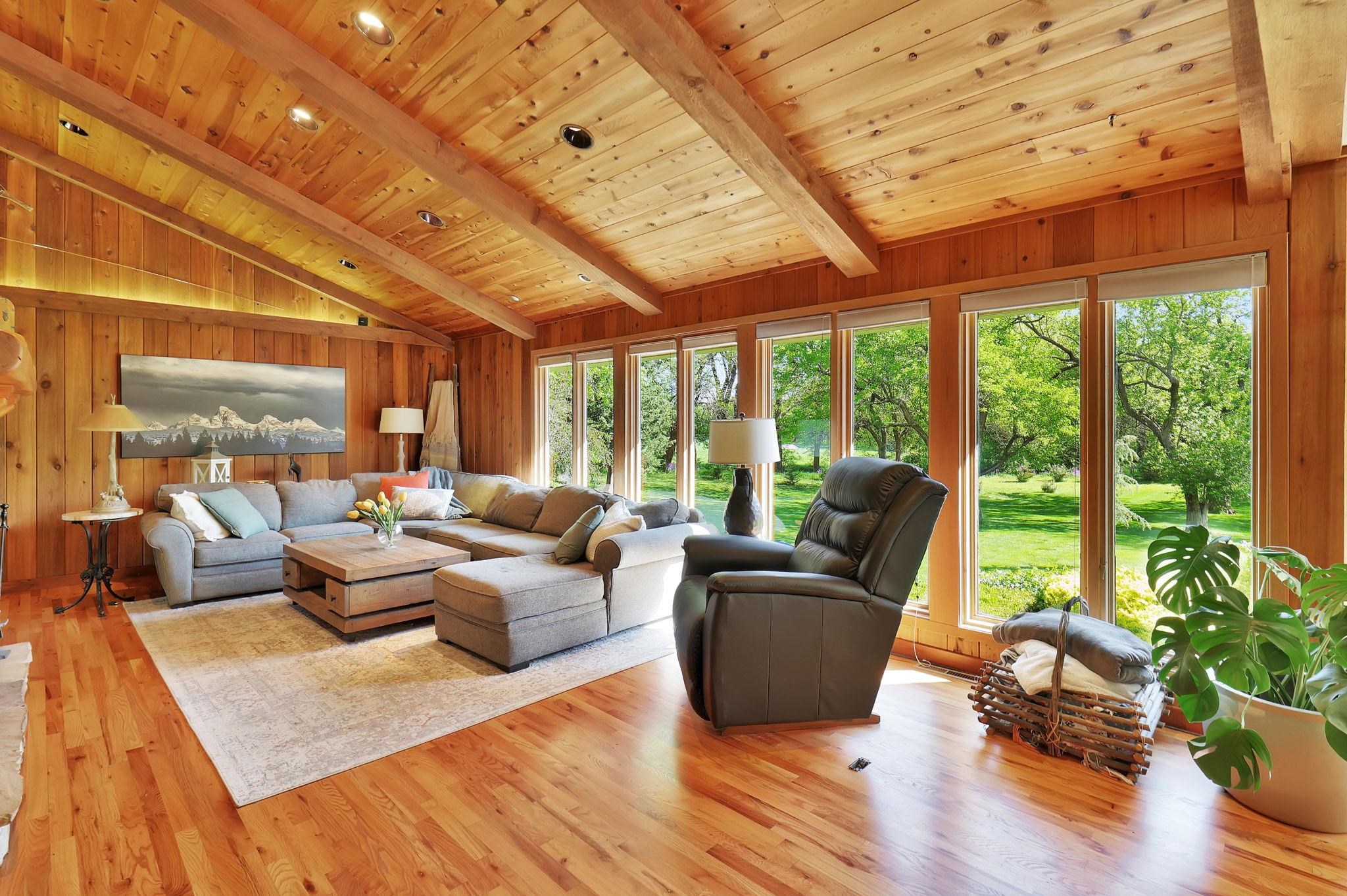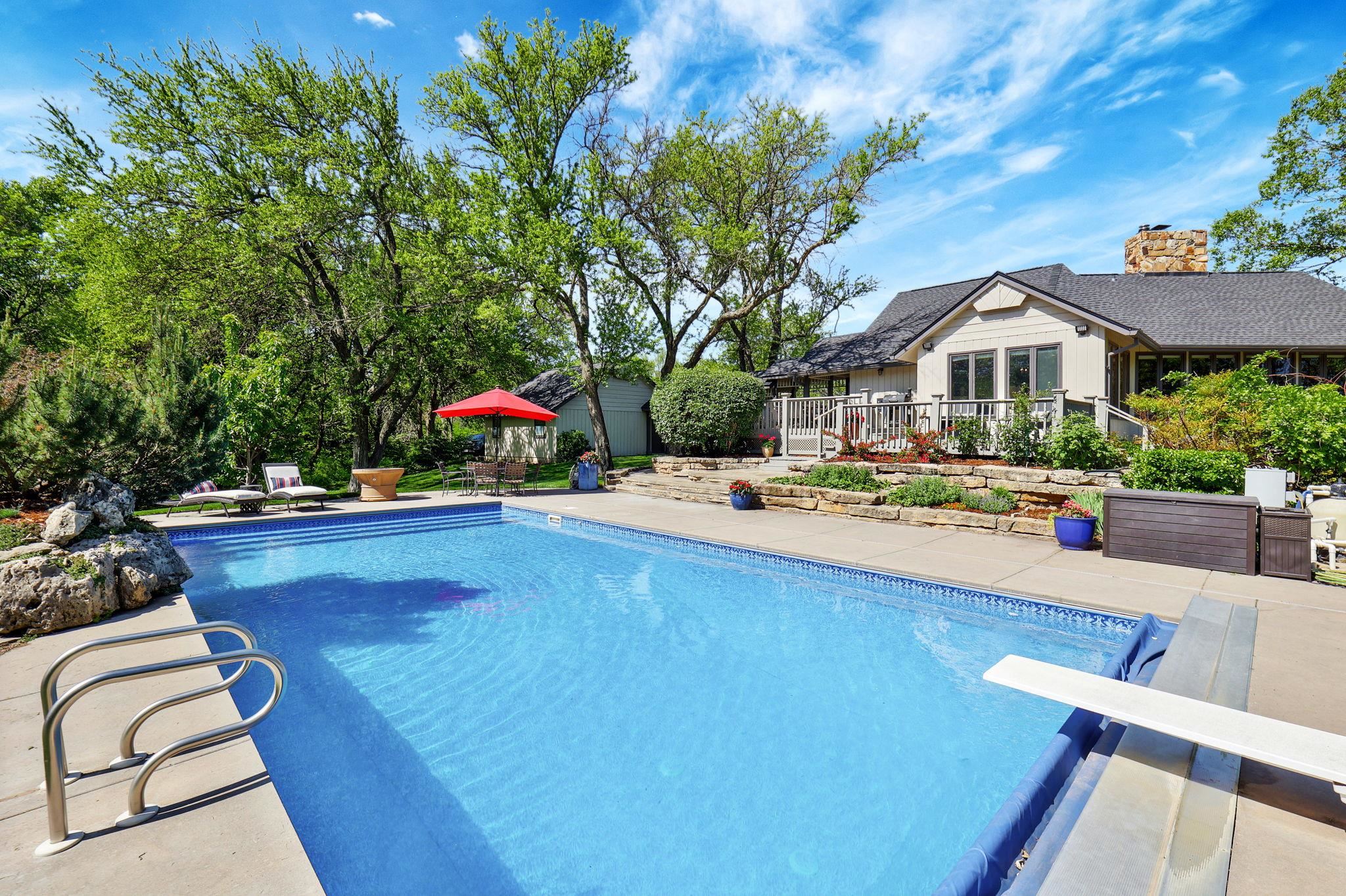 - Description: Welcome to this stunning 3, 618 sq ft rustic lodge-style home nestled on 9.5 secluded acres, where natural beauty meets thoughtful renovation. Located just minutes from town, this move-in ready property is perfect for those who desire peaceful country living without sacrificing convenience. The home has been meticulously updated, starting with a 3-year-old high-impact roof, fresh interior and exterior paint, modern lighting throughout, and a recently resurfaced private road. A covered walkway connects the home to a spacious, oversized 2-car garage, with an additional storage shed nearby for all your tools, toys, or hobby needs. Step outside to enjoy a resort-like setting featuring a beautiful saltwater in-ground pool complete with a new liner, pool cover, diving board, and water fountain—all surrounded by a generous deck perfect for entertaining or relaxing. The property is dotted with mature trees and fully enclosed on the north side with a wrought iron fence for added privacy and charm. Nature lovers will be enchanted by the fully stocked pond filled with bass, crappie, and bluegill, and it’s common to see deer and wild turkey roaming the grounds. For those with a green thumb or a passion for homegrown produce, the land boasts a mini orchard with apple, Bing cherry, peach, pear, and nectarine trees, as well as a variety of berry bushes—blackberry, raspberry, and strawberry—and thriving tomato plants. Inside, the home welcomes you with huge windows offering panoramic views of the wooded landscape and flowering gardens, filling each room with natural light. The interior exudes rustic elegance, with soaring cedar wood vaulted ceilings, a large open-concept kitchen featuring built-in pantries, and a main-level bar area ideal for hosting. The expansive dining area flows directly onto the rear deck, making indoor-outdoor gatherings effortless. The floor plan includes two spacious bedrooms upstairs and two-plus bedrooms downstairs, along with a walk-out basement family room that opens directly to the backyard. The primary suite is generously sized, offering a walk-in closet as well as a secondary closet within the bedroom itself. Whether you're gathering with friends, enjoying a quiet morning by the pond, or growing your own fruit and vegetables, this one-of-a-kind home offers a unique blend of comfort, privacy, and natural splendor. Don’t miss your chance to live the country lifestyle in a beautifully updated home, close to all the amenities of town. Show all description