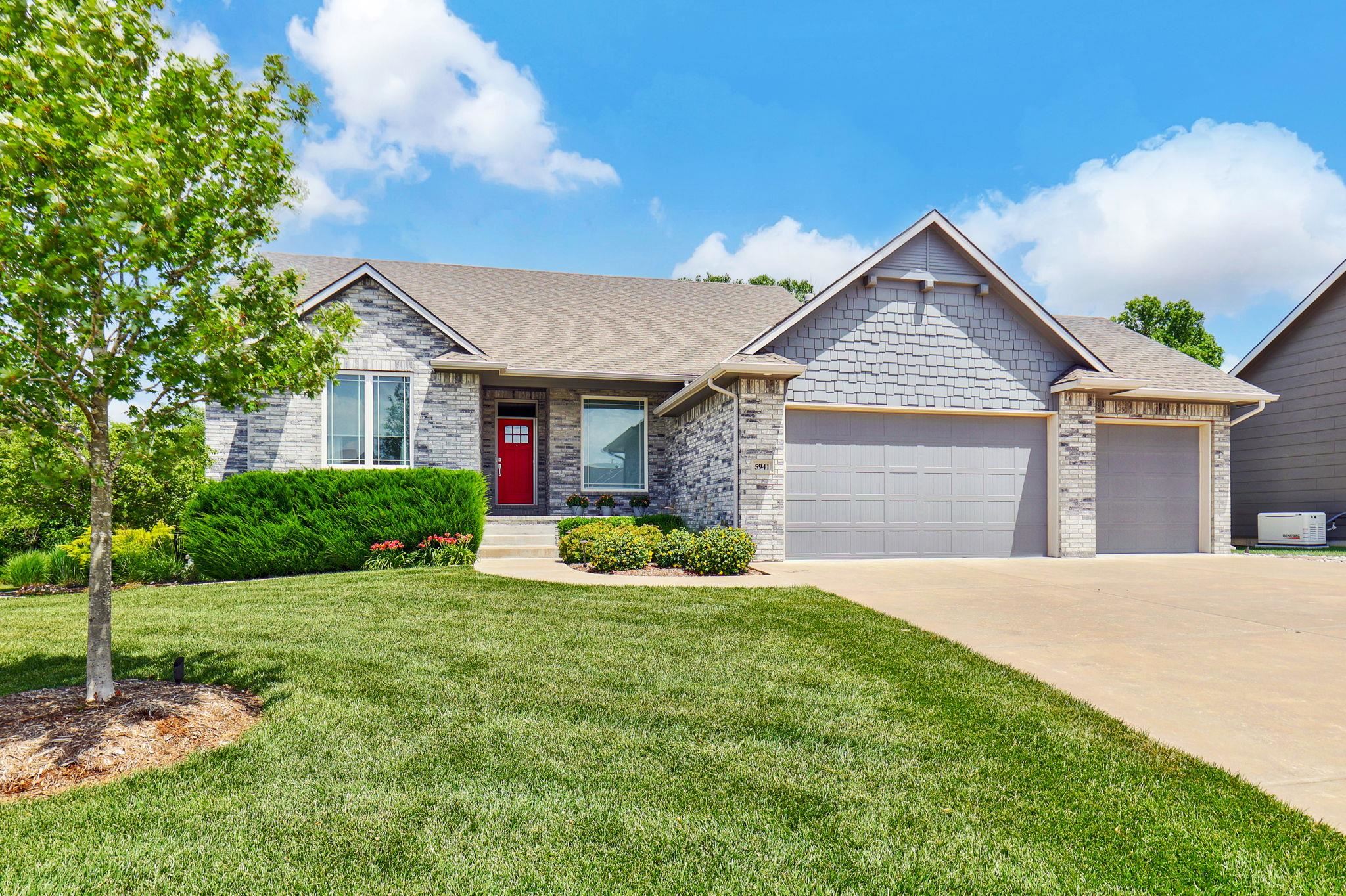 - Description: Custom built by H & H Homebuilders and impeccably maintained by its original owners, this stunning home sits on a beautifully landscaped 0.40-acre tree-lined lot. Enjoy peaceful morning sun and shaded evenings with the East-facing orientation —perfect for relaxing on the covered deck or covered patio below. Professional landscaping and outdoor lighting enhance the home’s exceptional curb appeal. Step inside to an open concept floor plan with soaring ceilings, crisp white trim, and beautiful engineered hardwood floors. A striking floor-to-ceiling stacked stone fireplace, flanked by large windows, creates a warm focal point in the main living area and draws your eyes to the peaceful backyard setting. The kitchen is a true standout, featuring an oversized island ideal for entertaining, quartz countertops, a gas range, decorative vent hood, under and above cabinet lighting, and a walk-in pantry. Designed with privacy in mind, the split bedroom layout includes a serene primary suite with backyard views, a spacious walk-in closet connected to the laundry room, dual vanities, and a tiled walk-in shower. Tailored for everyday living, the laundry room offers built-in storage with a drop zone, bench, hooks, and cubbies. Entertaining is effortless in the light and bright view-out basement, complete with a generous space for a media area and game table, plus a wet bar with a wine fridge, two additional bedrooms, a full bath, and plenty of storage. Additional features include a sprinkler system, a three-car garage, and quick access to highways and Koch Industries. This thoughtfully designed home has been so gently used, it feels brand new—offering move-in ready comfort, timeless finishes, and smart functionality throughout. Show all description