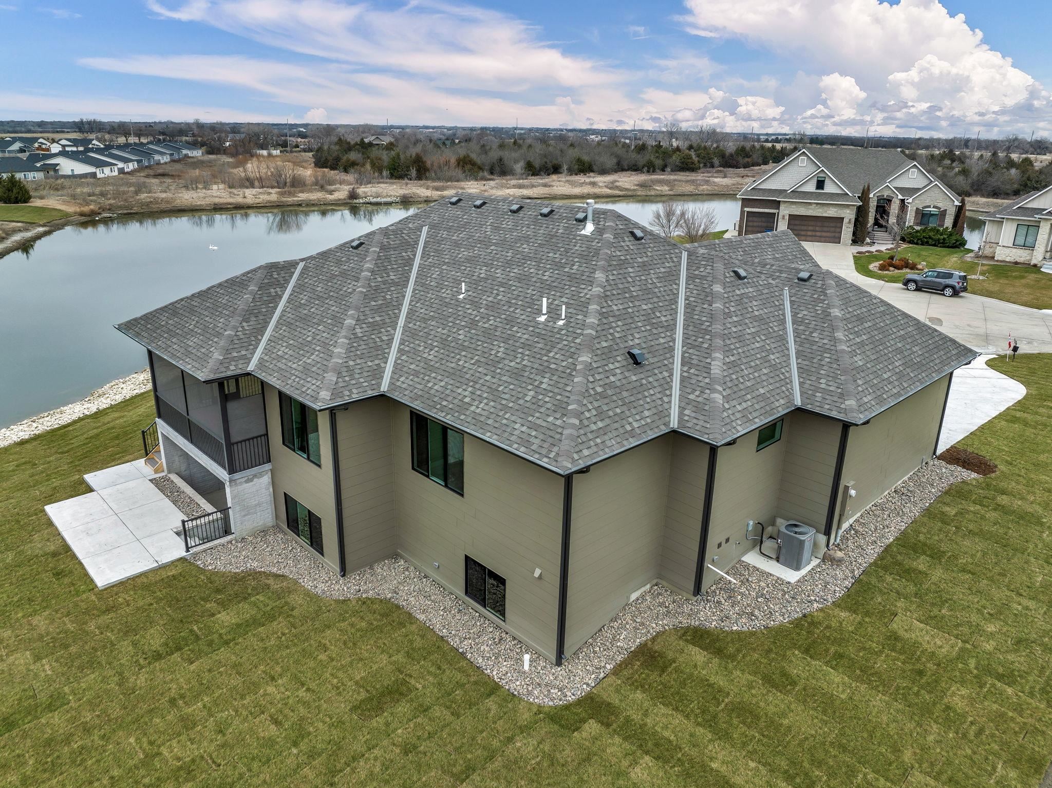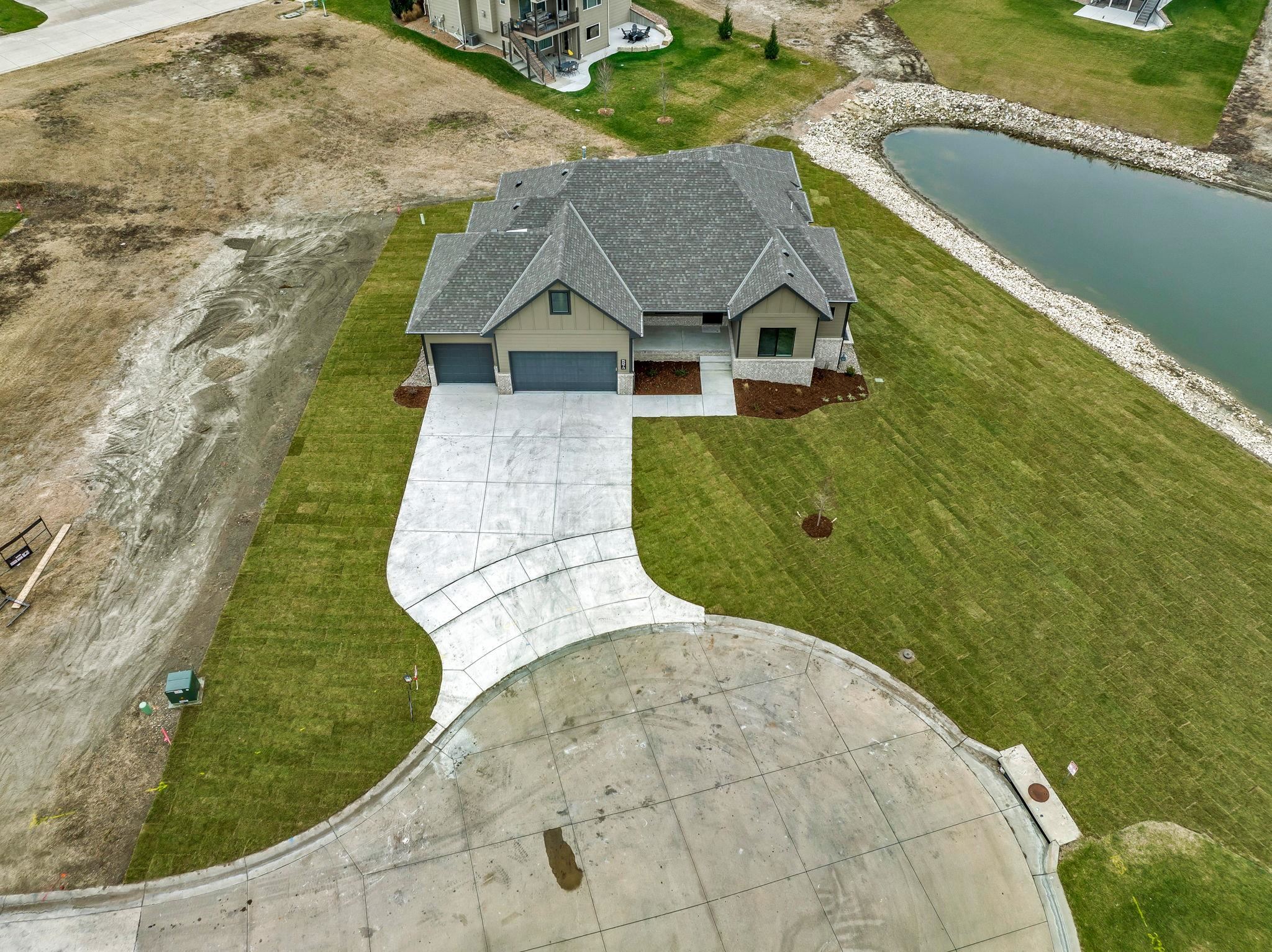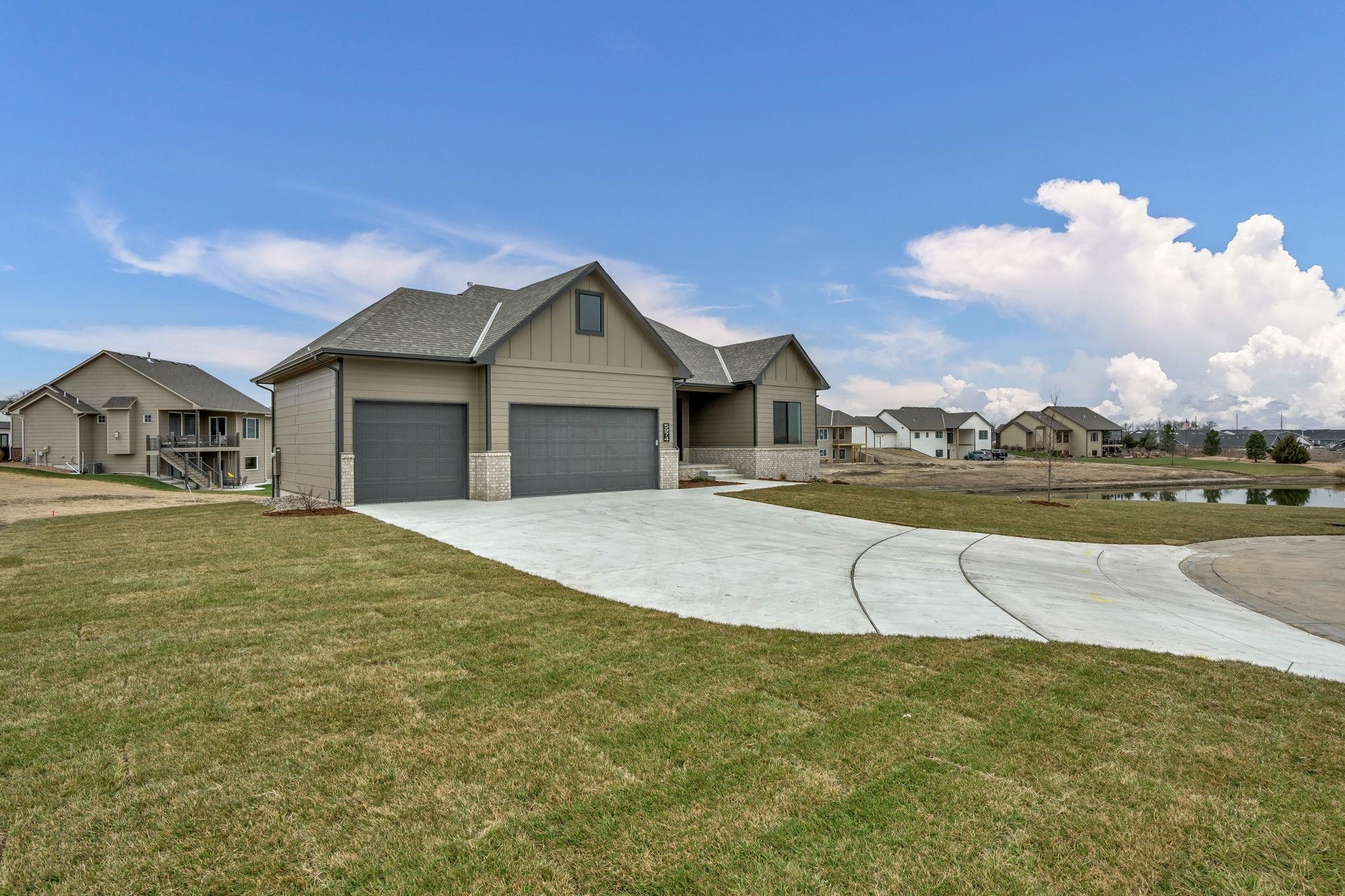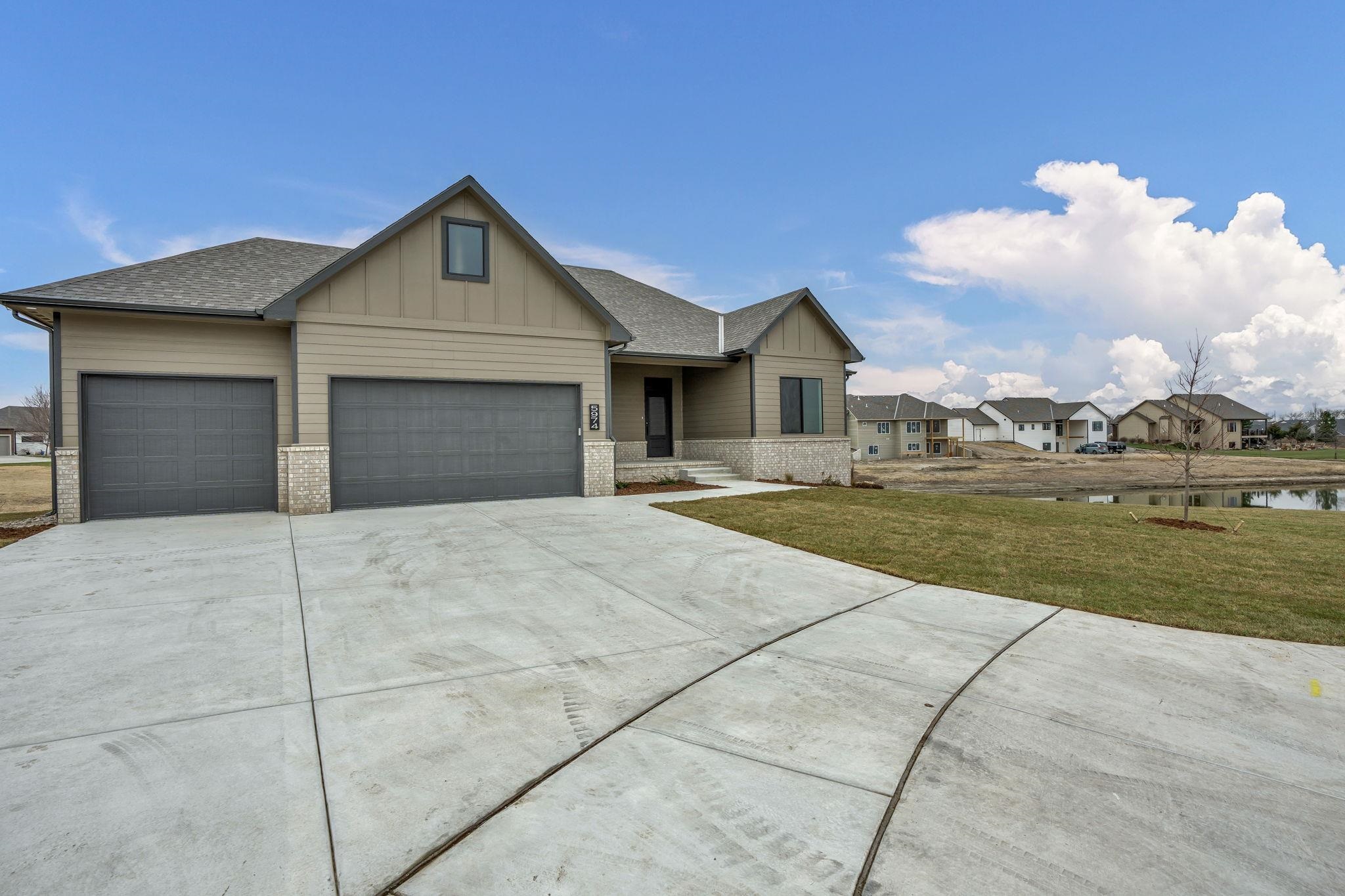 - Description: Luxury waterfront living with a small town feel! Nestled in a quite neighborhood in Bel Aire sits this modern masterpiece built by H&H Homebuilders. Upon entering this home you will be immediately captivated by the -truly- grand foyer with 11" box ceilings! Immediately to the right of this split floorplan you will find two bedrooms with generously sized closets and the guest bathroom. When entering into the living room you will be blown away by the modern tile feature wall with built in windows which highlight the view of one of the communities stocked ponds! The living room is not only spacious, but it is also cozy with a modern electric fireplace and custom mantel! This home is an entertainers dream starting in your chef's kitchen with an oversized island, gas range, custom exterior vented rangehood, and walk in panty. Off the dining room you will find direct access to your screened in and covered concrete deck which allows for the perfect flow for indoor and outdoor entertaining! Enter into your owner's suite, where the modern design continues, with a decorative feature wall. The owner's suite is as beautiful as it is functional with the luxury of a double vanity, large linen cabinet, and a zero-entry custom tile shower with a built-in niche and bench! You will also fall in love with the spacious master closet with a built-in dresser and custom shelving including off season & long hanging space. Did we mention how well thought out and convenient this floor plan truly is? The laundry room located directly off the master bath and directly across from the drop zone making this plan exceptional for both form and function. The unfinished walk-out basement allows for you to grow at your own pace and customized the space to your liking and it is already plumed for a wet bar! The basement also includes a safe room! Added perks: A whole home humidifier! (sprinkler, sod, and landscaping coming soon!) Show all description