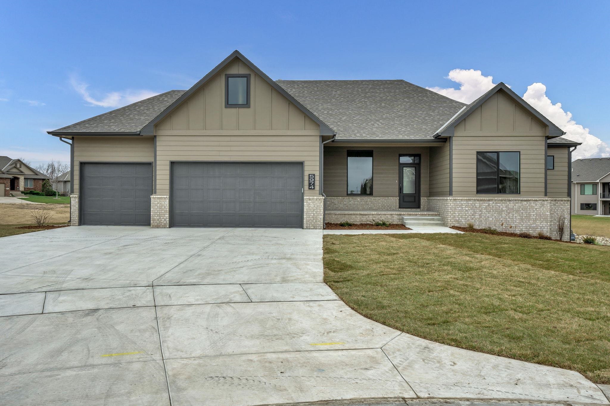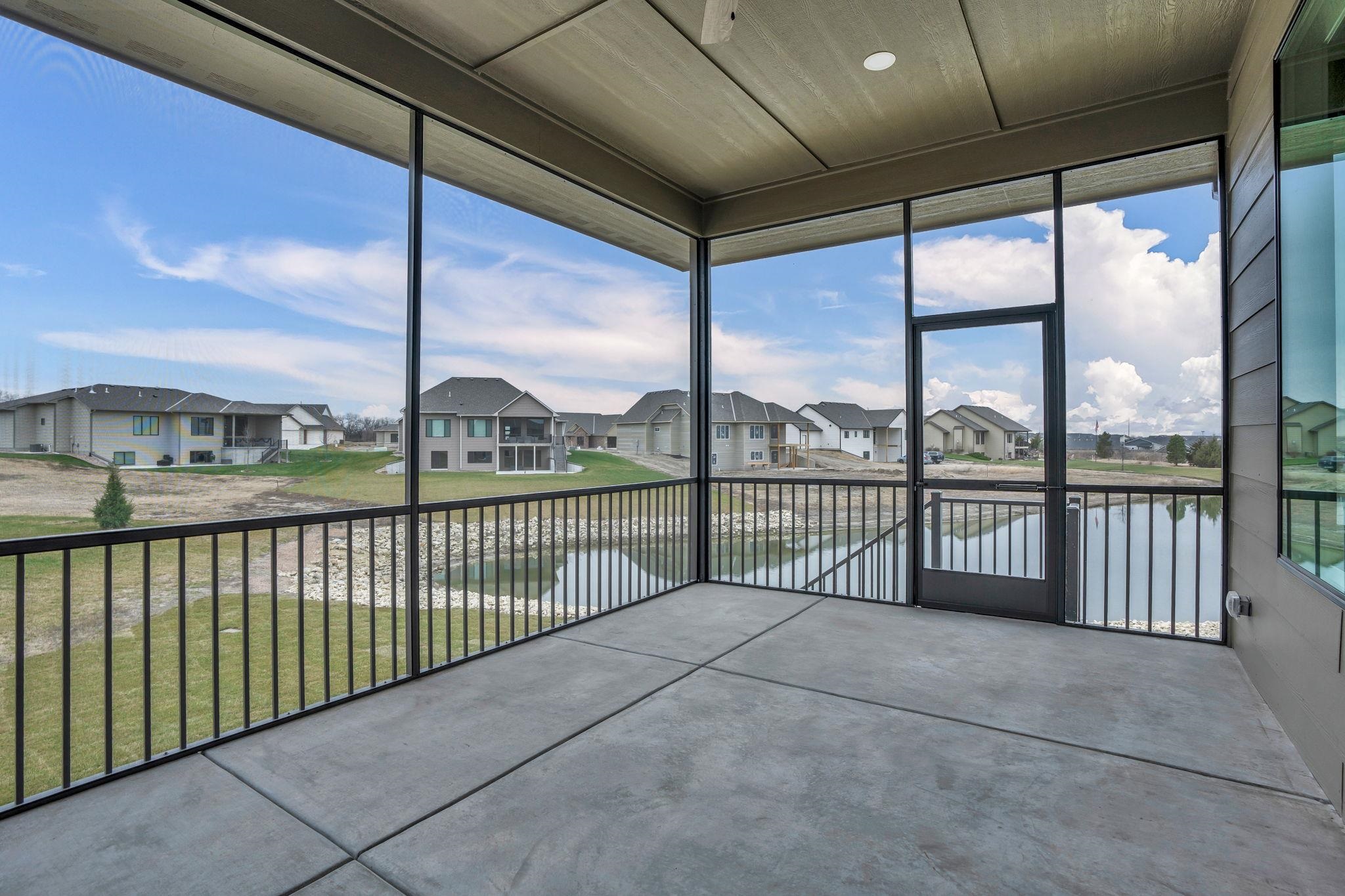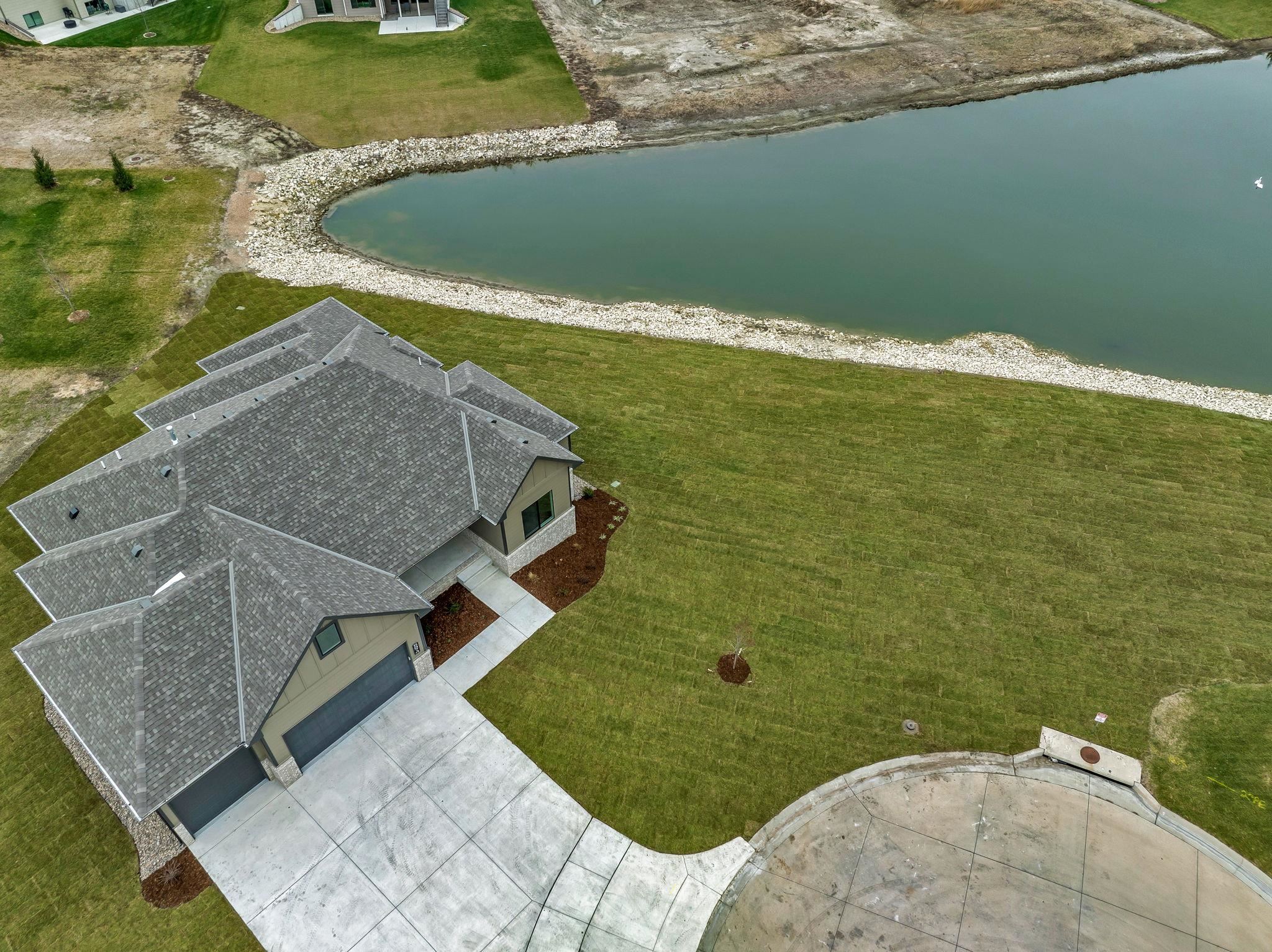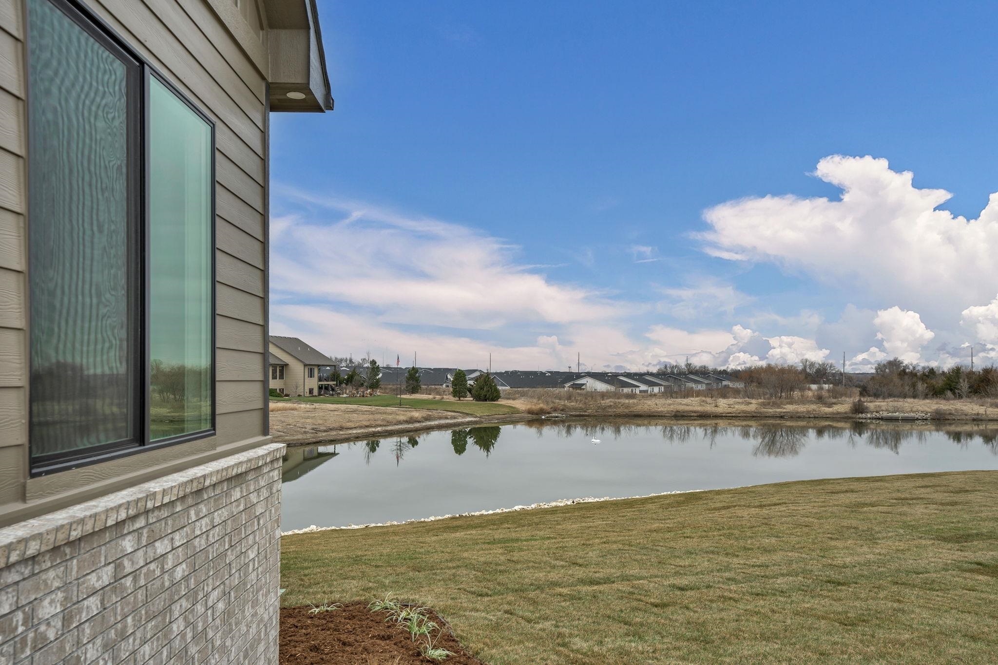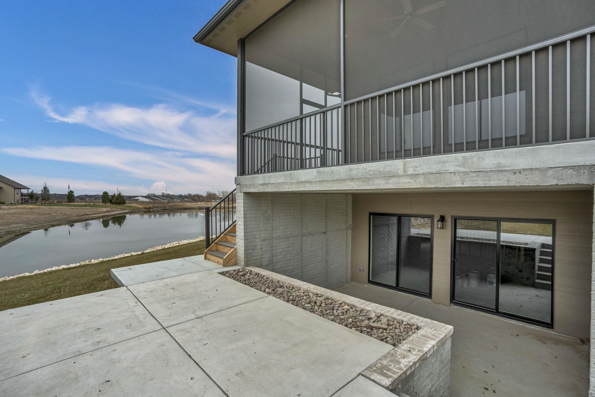 - Description: Luxury waterfront living with a small town feel! Nestled in a quite neighborhood in Bel Aire sits this modern masterpiece built by H&H Homebuilders. Upon entering this home you will be immediately captivated by the -truly- grand foyer with 11" box ceilings! Immediately to the right of this split floorplan you will find two bedrooms with generously sized closets and the guest bathroom. When entering into the living room you will be blown away by the modern tile feature wall with built in windows which highlight the view of one of the communities stocked ponds! The living room is not only spacious, but it is also cozy with a modern electric fireplace and custom mantel! This home is an entertainers dream starting in your chef's kitchen with an oversized island, gas range, custom exterior vented rangehood, and walk in panty. Off the dining room you will find direct access to your screened in and covered concrete deck which allows for the perfect flow for indoor and outdoor entertaining! Enter into your owner's suite, where the modern design continues, with a decorative feature wall. The owner's suite is as beautiful as it is functional with the luxury of a double vanity, large linen cabinet, and a zero-entry custom tile shower with a built-in niche and bench! You will also fall in love with the spacious master closet with a built-in dresser and custom shelving including off season & long hanging space. Did we mention how well thought out and convenient this floor plan truly is? The laundry room located directly off the master bath and directly across from the drop zone making this plan exceptional for both form and function. The unfinished walk-out basement allows for you to grow at your own pace and customized the space to your liking and it is already plumed for a wet bar! The basement also includes a safe room! Added perks: A whole home humidifier! (sprinkler, sod, and landscaping coming soon!) Show all description