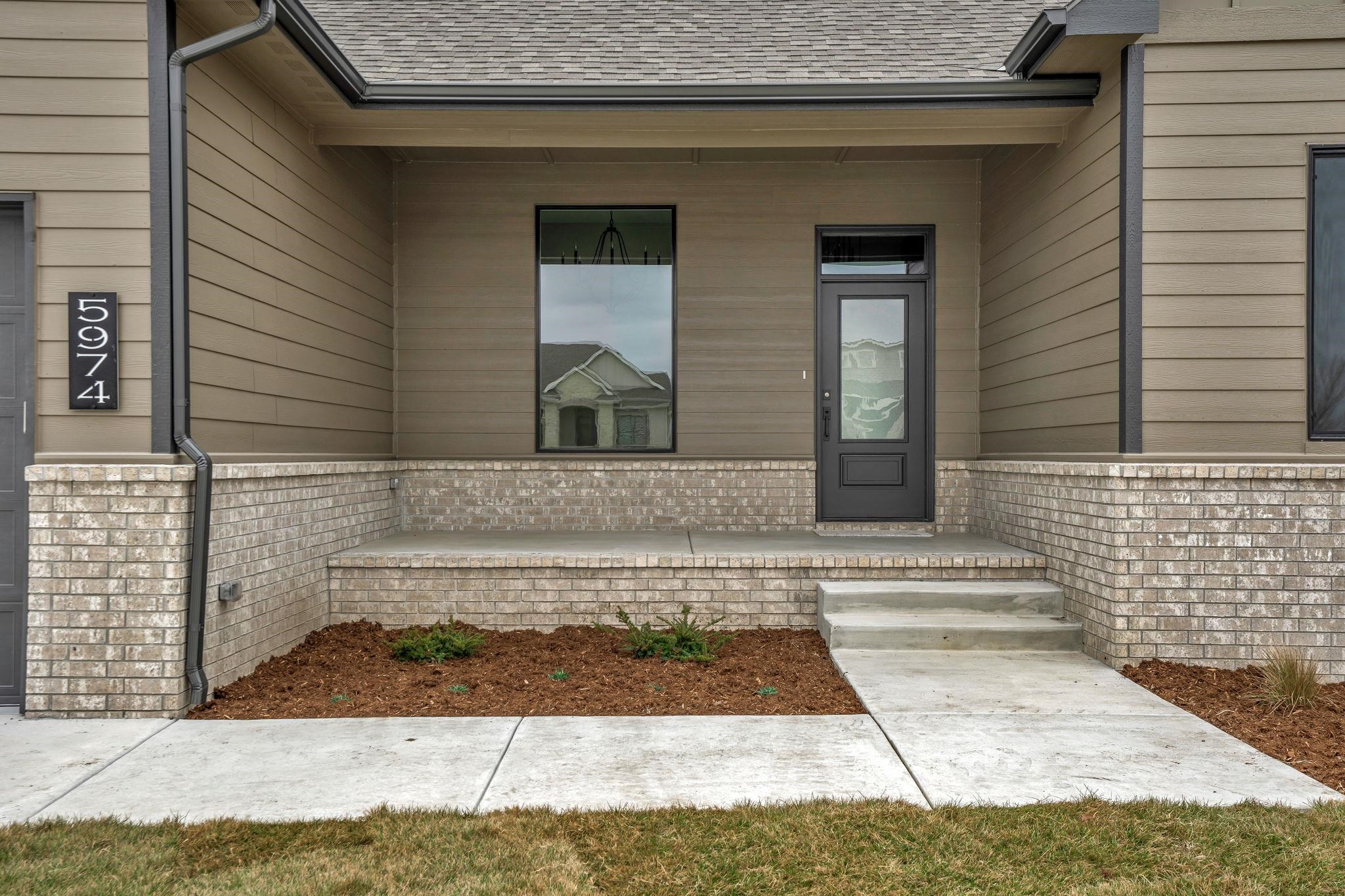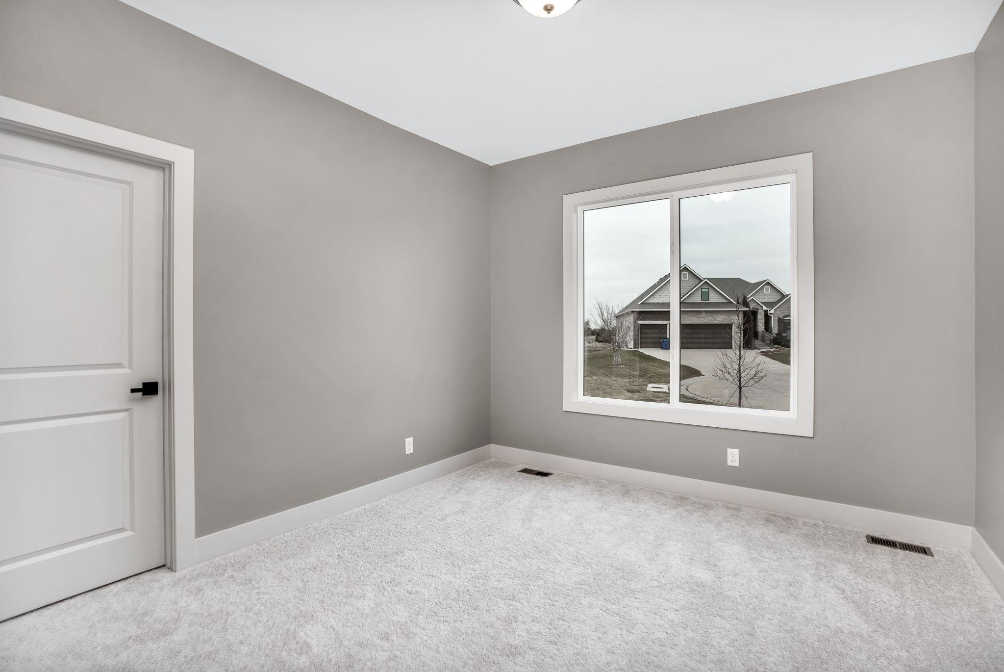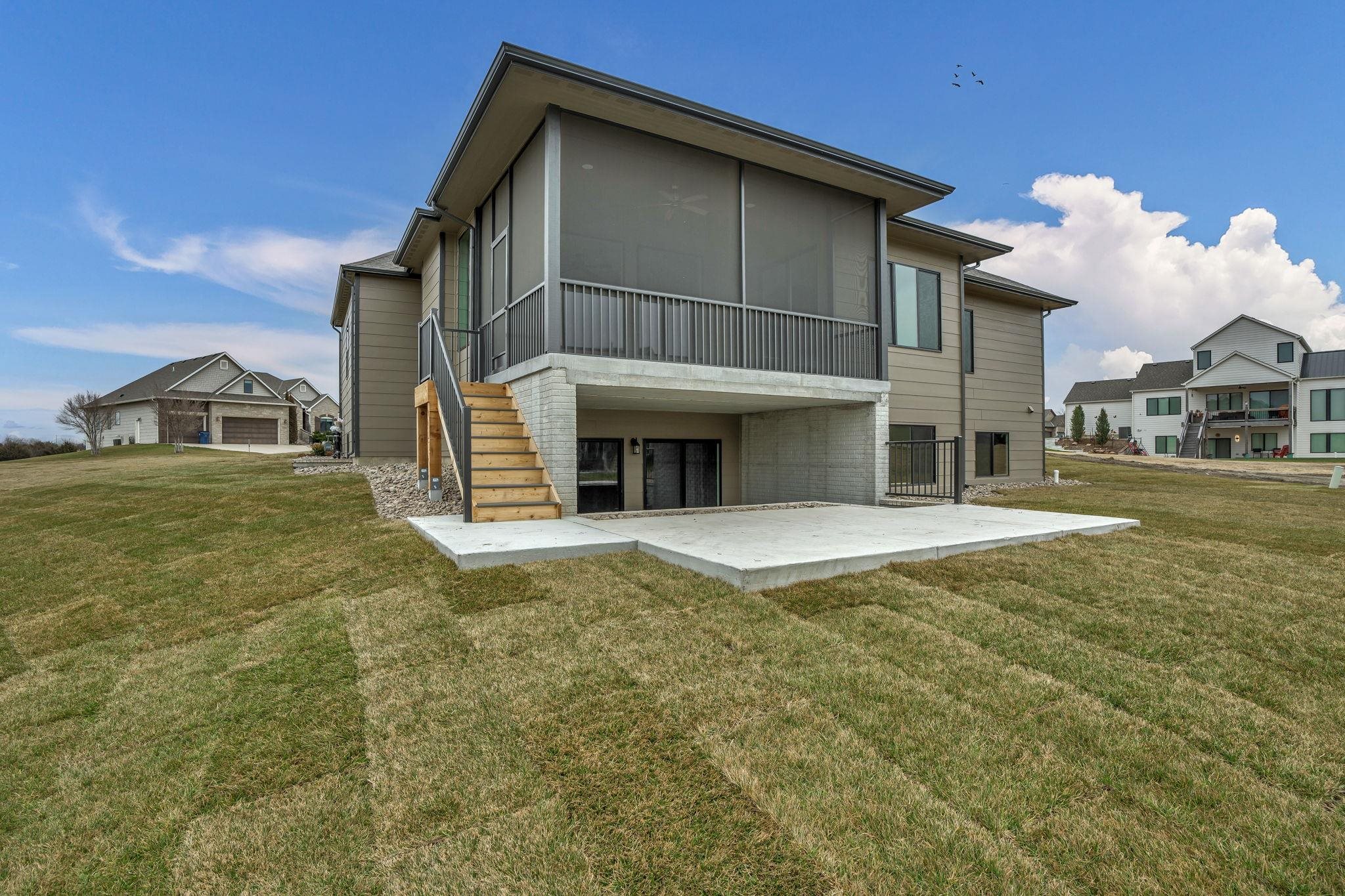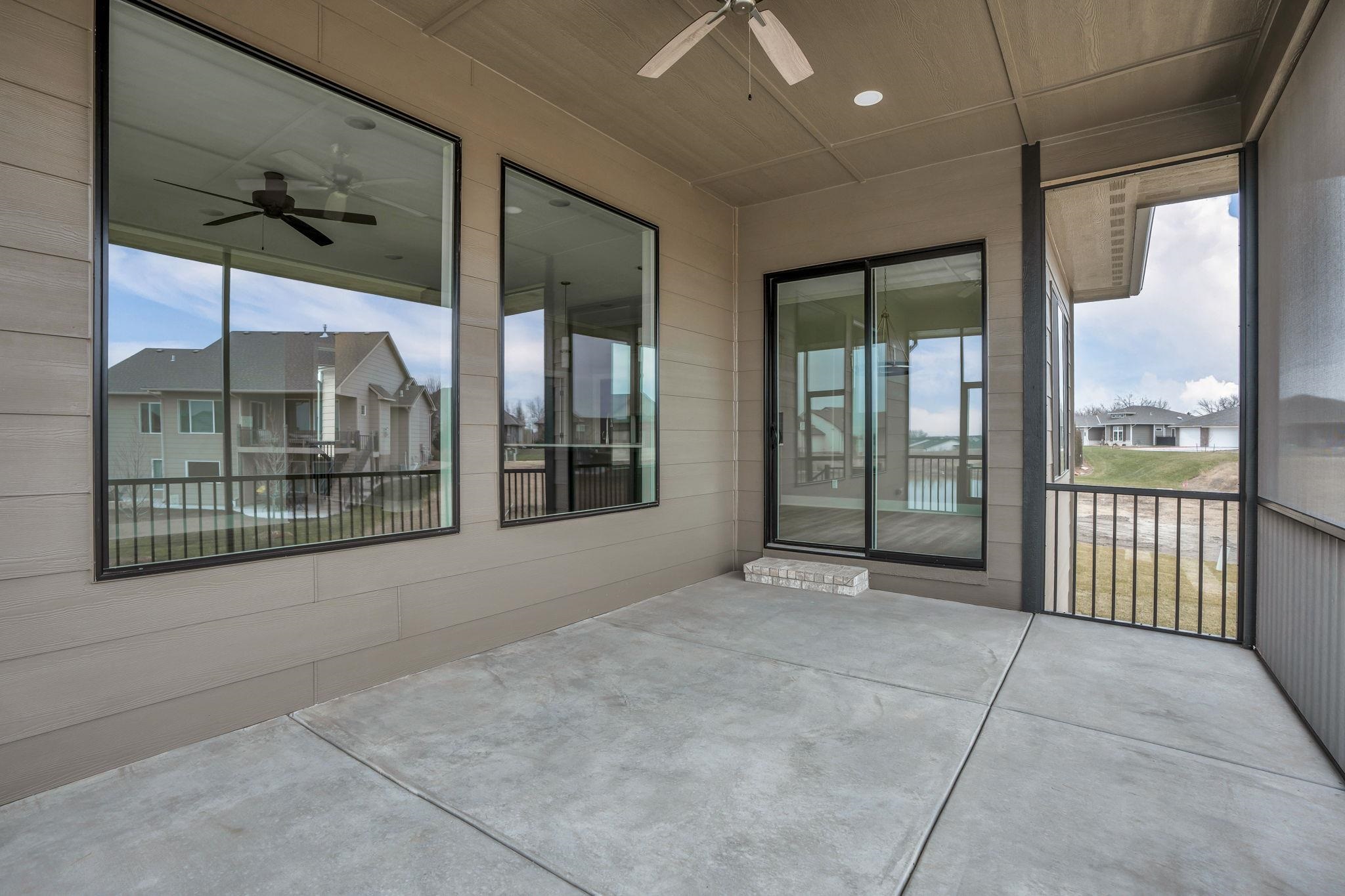 - Description: Luxury waterfront living with a small town feel! Nestled in a quite neighborhood in Bel Aire sits this modern masterpiece built by H&H Homebuilders. Upon entering this home you will be immediately captivated by the -truly- grand foyer with 11" box ceilings! Immediately to the right of this split floorplan you will find two bedrooms with generously sized closets and the guest bathroom. When entering into the living room you will be blown away by the modern tile feature wall with built in windows which highlight the view of one of the communities stocked ponds! The living room is not only spacious, but it is also cozy with a modern electric fireplace and custom mantel! This home is an entertainers dream starting in your chef's kitchen with an oversized island, gas range, custom exterior vented rangehood, and walk in panty. Off the dining room you will find direct access to your screened in and covered concrete deck which allows for the perfect flow for indoor and outdoor entertaining! Enter into your owner's suite, where the modern design continues, with a decorative feature wall. The owner's suite is as beautiful as it is functional with the luxury of a double vanity, large linen cabinet, and a zero-entry custom tile shower with a built-in niche and bench! You will also fall in love with the spacious master closet with a built-in dresser and custom shelving including off season & long hanging space. Did we mention how well thought out and convenient this floor plan truly is? The laundry room located directly off the master bath and directly across from the drop zone making this plan exceptional for both form and function. The unfinished walk-out basement allows for you to grow at your own pace and customized the space to your liking and it is already plumed for a wet bar! The basement also includes a safe room! Added perks: A whole home humidifier! (sprinkler, sod, and landscaping coming soon!) Show all description