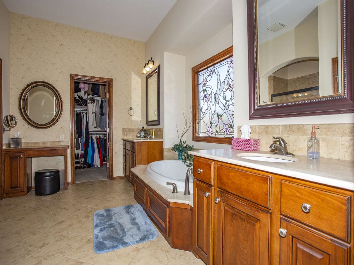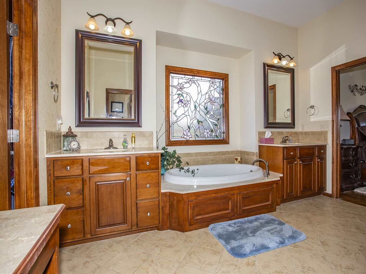 - Master Bedroom: Master Bdrm on Main Level, Split Bedroom Plan, Master Bedroom Bath, Sep. Tub/Shower/Mstr Bdrm, Two Sinks, Quartz Counters