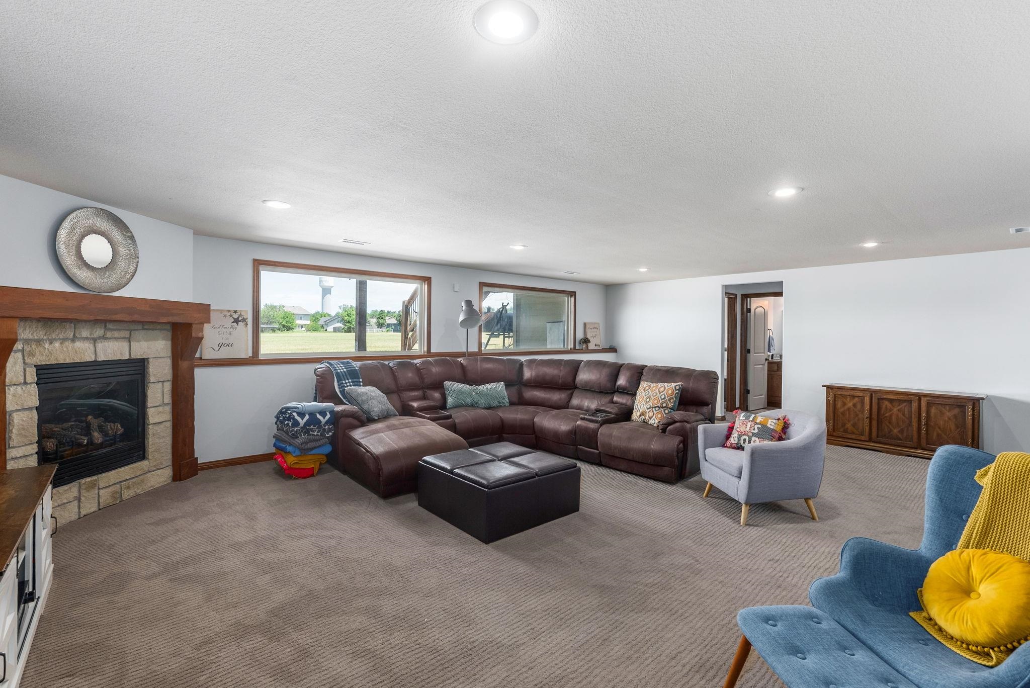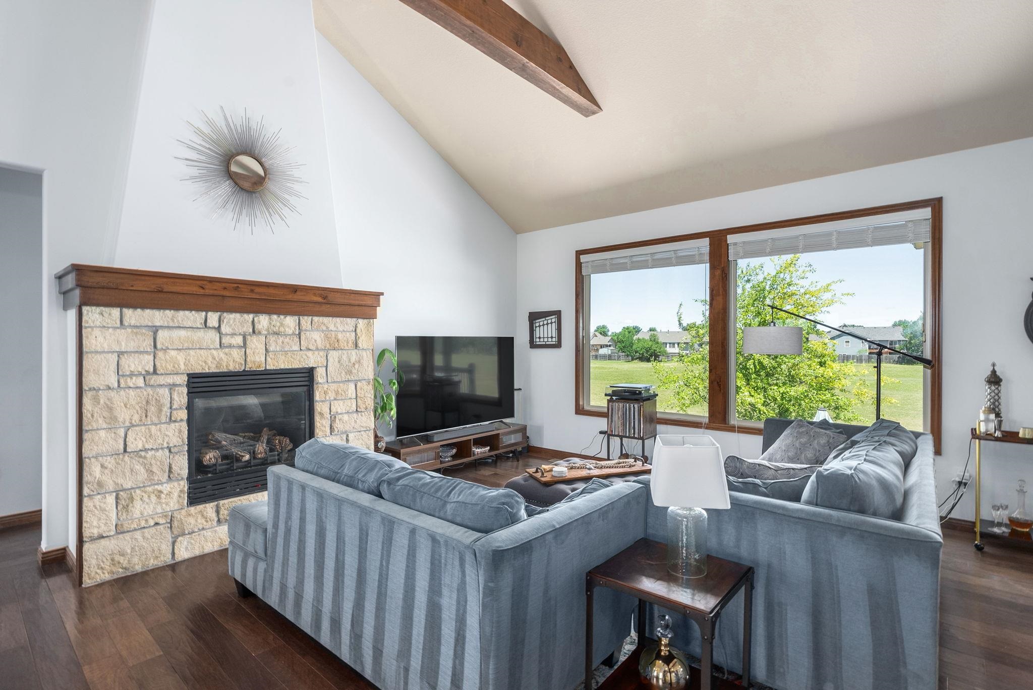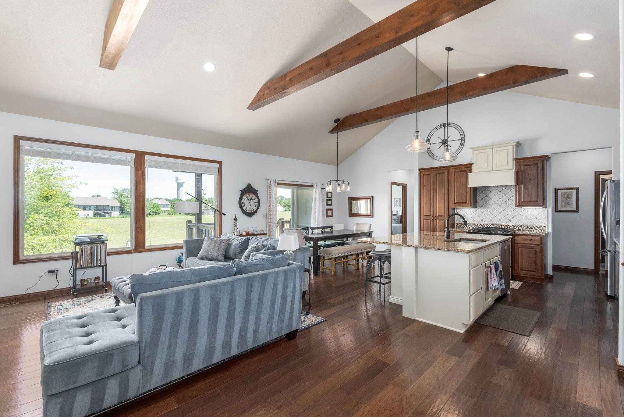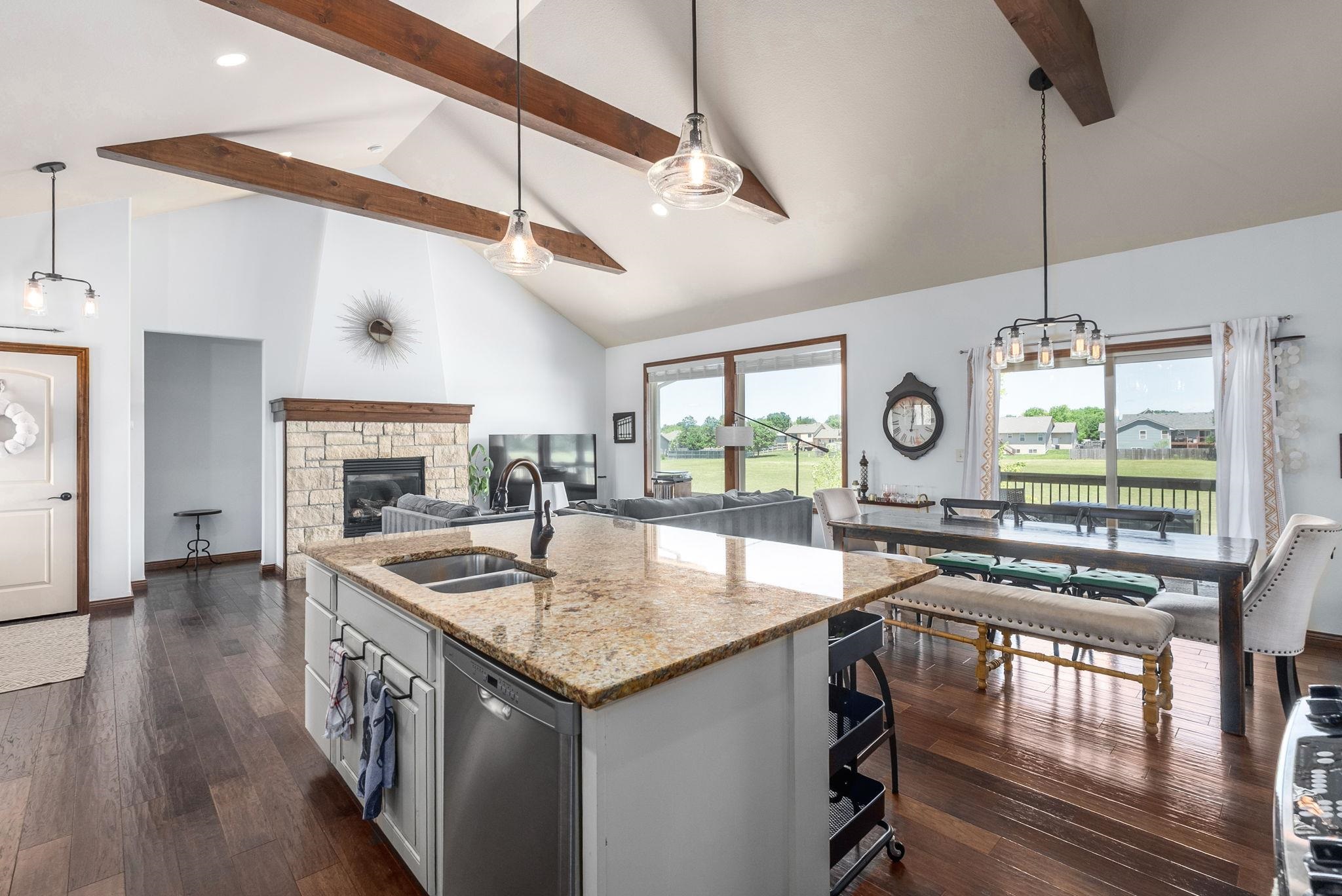 - Description: Welcome to 602 E. Stone Lake Cir.—a beautifully appointed ranch home tucked away on a quiet cul-de-sac in the desirable Stone Lake community. Designed with both comfort and style in mind, this residence offers an open concept layout ideal for effortless entertaining. Step inside to find soaring vaulted ceilings with rich wood beams, expansive windows that flood the space with natural light, and gorgeous hardwood flooring throughout the main living areas. The inviting great room centers around a stunning gas fireplace with a floor-to-ceiling stone surround, while the adjacent dining area—with its elegant chandelier and sliding glass doors—opens seamlessly to the covered deck, perfect for summer gatherings. The chef’s kitchen is a true showstopper, featuring a generous granite island with breakfast bar, under-cabinet lighting, tile backsplash, a brand-new gas range and oven, glass-front display cabinets, and a walk-in pantry. Just off the kitchen, the well-designed laundry room offers additional cabinetry, a folding counter, hanging rod, and even direct access to the primary suite's walk-in closet—making laundry day a breeze. Retreat to the spacious primary suite, complete with plush carpeting, tray ceiling, ceiling fan, and large windows overlooking the backyard. The spa-like en suite bath includes dual granite vanities, a luxurious soaker tub, private water closet, separate shower with rain-textured glass, and a walk-in closet with custom shelving and convenient access to the laundry room. The split-bedroom floor plan ensures added privacy, with two main-floor bedrooms located opposite the primary suite. Downstairs, you’ll find a sprawling finished viewout basement that doesn’t feel like a basement at all—thanks to oversized windows, recessed lighting, a cozy gas fireplace, and a full wet bar. The lower level also includes two additional bedrooms with walk-in closets, a full bathroom, and generous storage space. Outside, relax on the covered deck or gather around the built-in fire pit on the patio below. Additional upgrades include new toilets, two bidets, a sump pump with water backup, built-in drop zone, and more. With its thoughtful design, tasteful finishes, and unbeatable location, this home offers exceptional value. Enjoy the convenience of being just a short stroll from the neighborhood’s community pool, playground, and basketball court—perfect for fun, fitness, and family time right outside your door. Don’t miss your chance to call it your own! Show all description