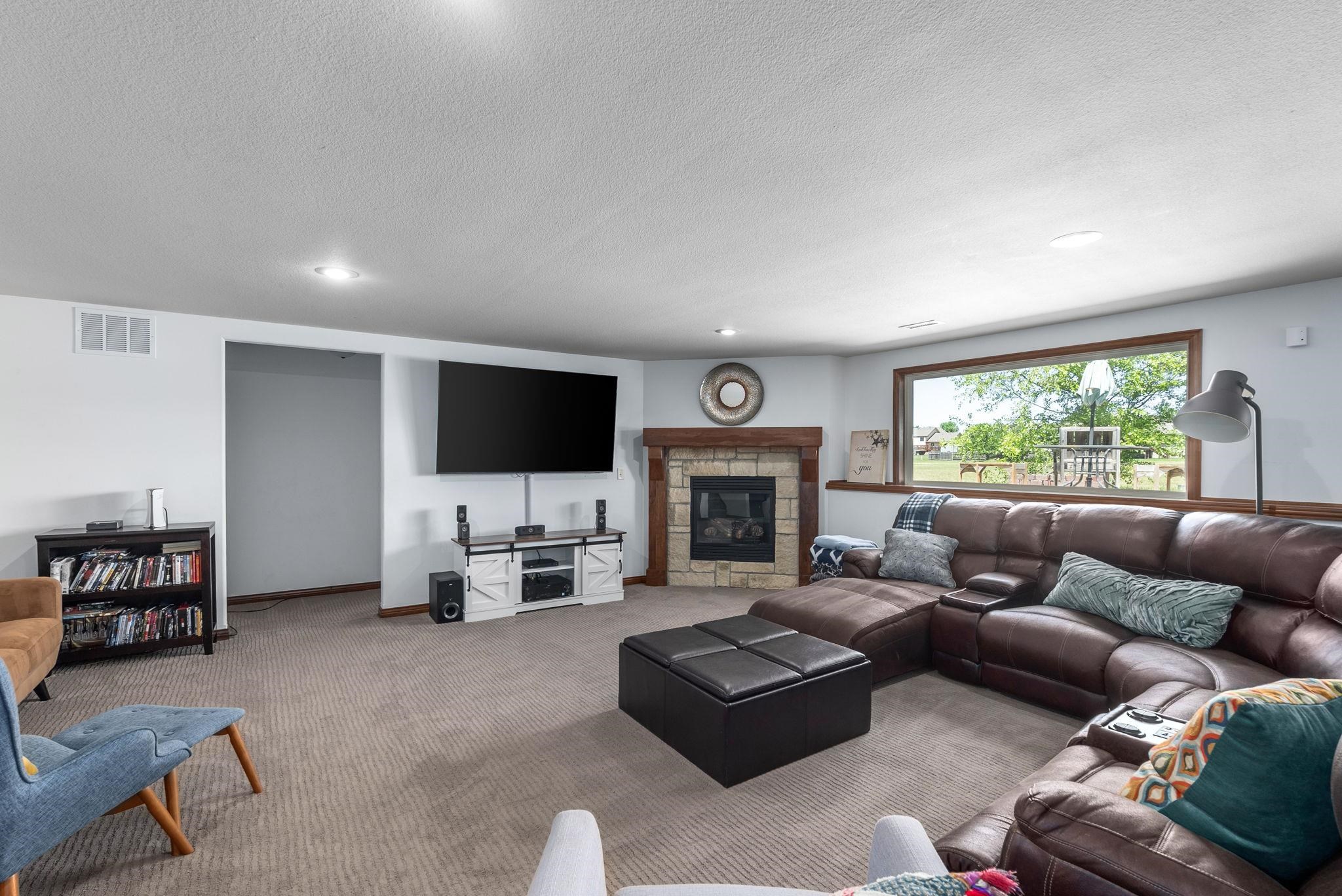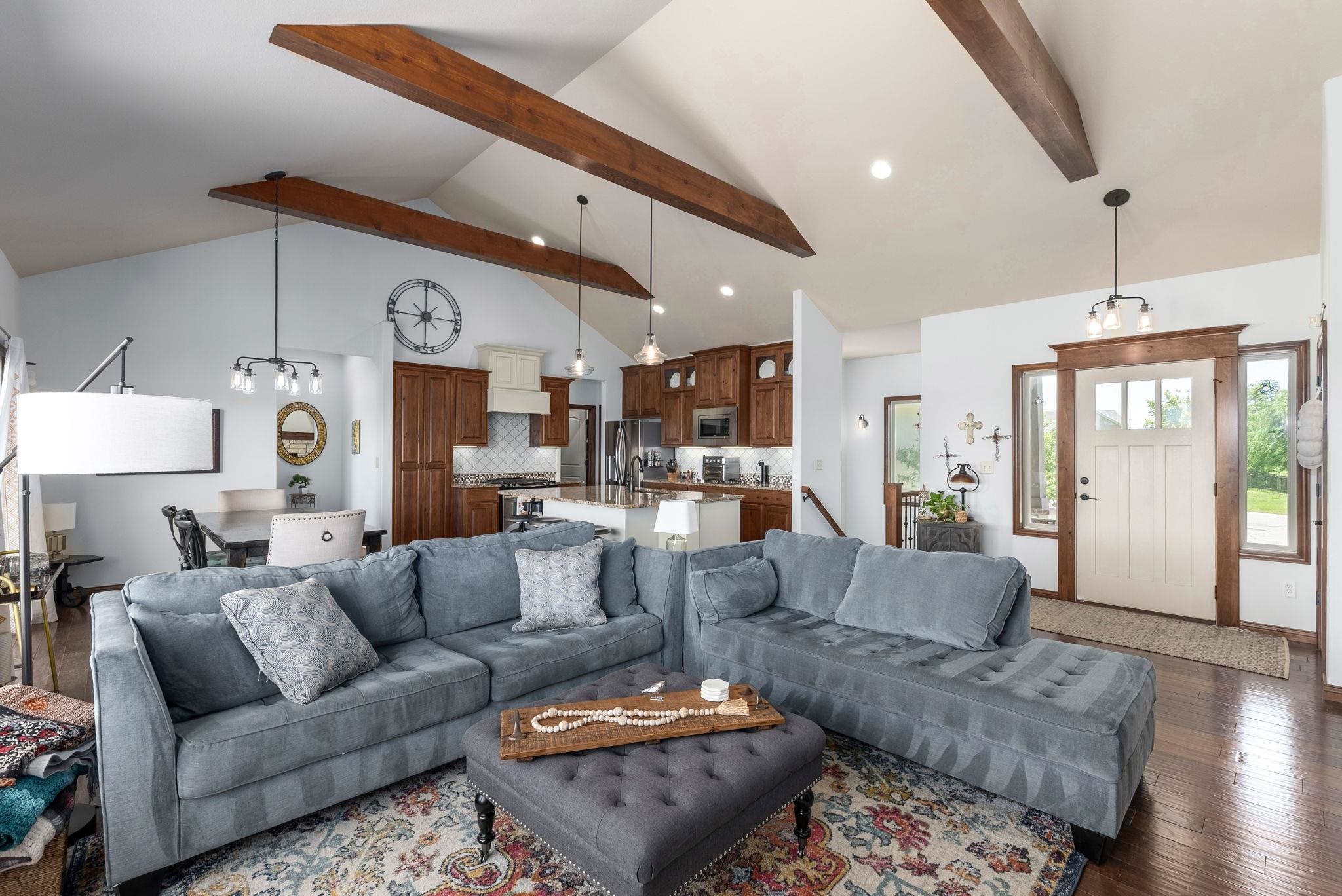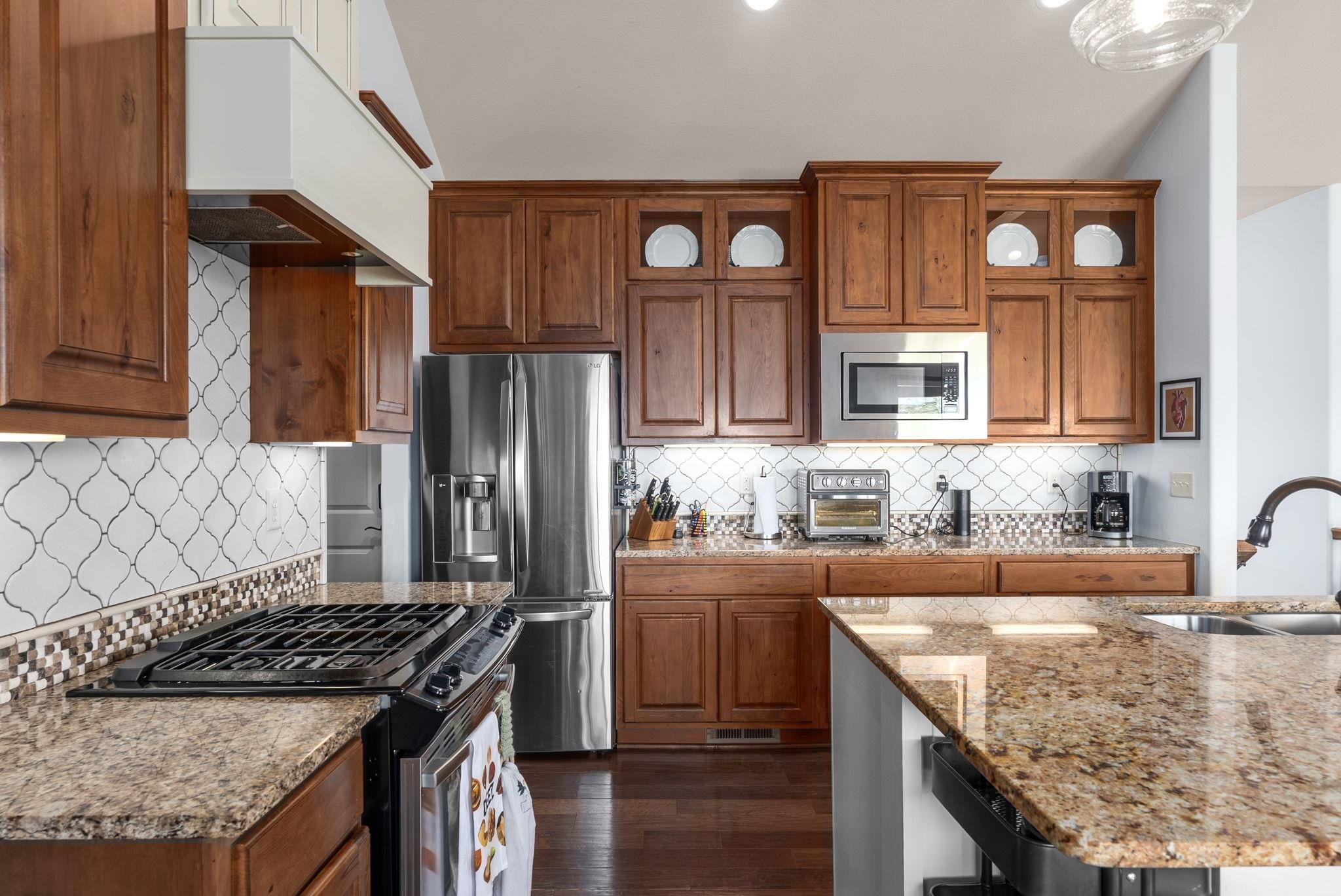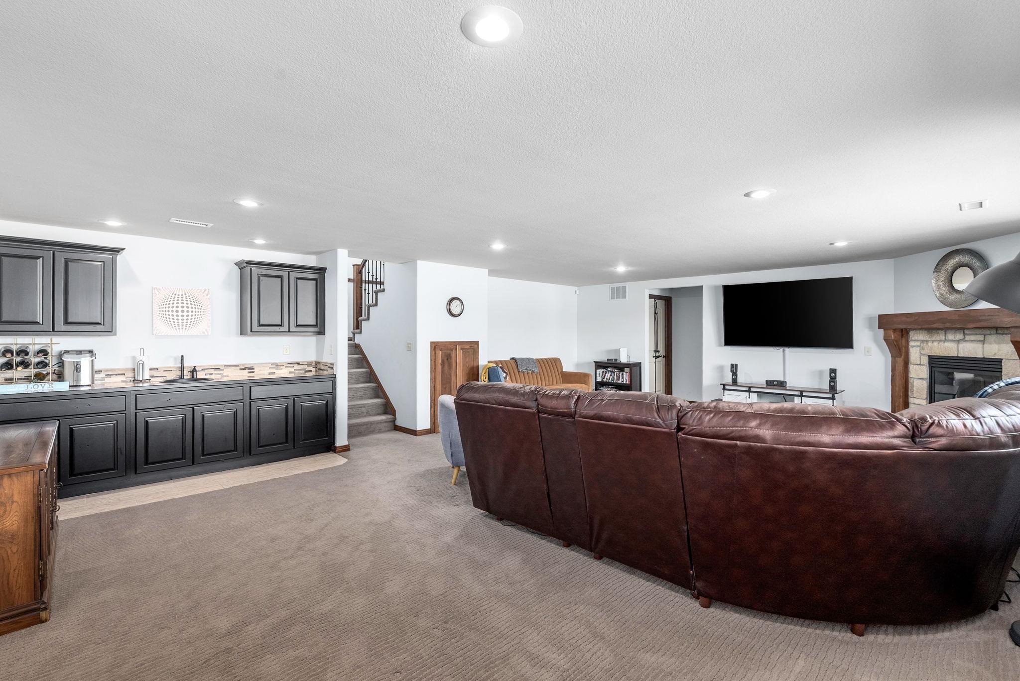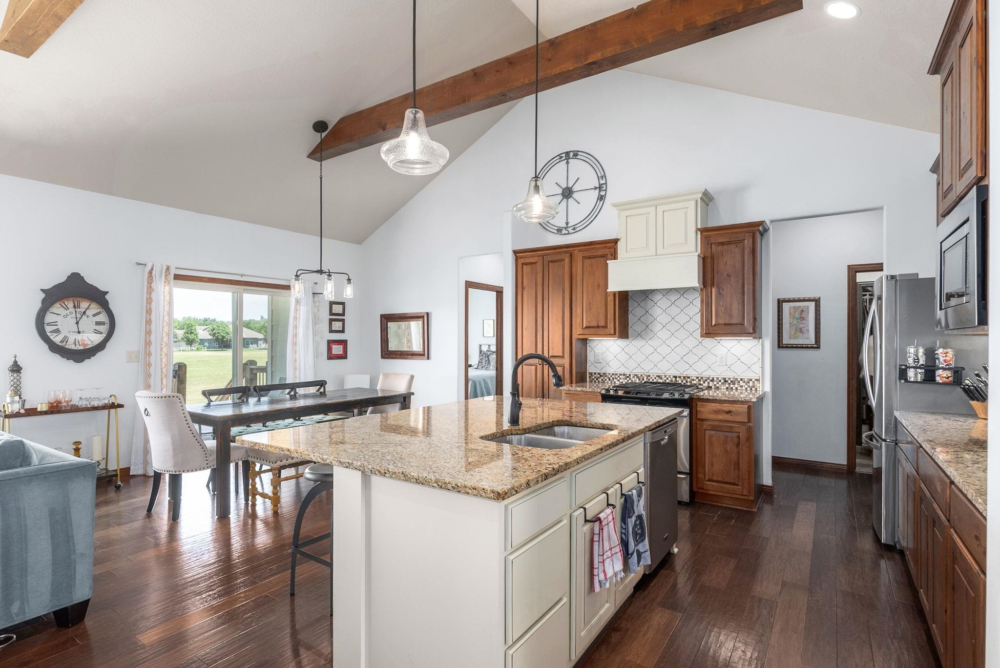 - Description: Welcome to 602 E. Stone Lake Cir.—a beautifully appointed ranch home tucked away on a quiet cul-de-sac in the desirable Stone Lake community. Designed with both comfort and style in mind, this residence offers an open concept layout ideal for effortless entertaining. Step inside to find soaring vaulted ceilings with rich wood beams, expansive windows that flood the space with natural light, and gorgeous hardwood flooring throughout the main living areas. The inviting great room centers around a stunning gas fireplace with a floor-to-ceiling stone surround, while the adjacent dining area—with its elegant chandelier and sliding glass doors—opens seamlessly to the covered deck, perfect for summer gatherings. The chef’s kitchen is a true showstopper, featuring a generous granite island with breakfast bar, under-cabinet lighting, tile backsplash, a brand-new gas range and oven, glass-front display cabinets, and a walk-in pantry. Just off the kitchen, the well-designed laundry room offers additional cabinetry, a folding counter, hanging rod, and even direct access to the primary suite's walk-in closet—making laundry day a breeze. Retreat to the spacious primary suite, complete with plush carpeting, tray ceiling, ceiling fan, and large windows overlooking the backyard. The spa-like en suite bath includes dual granite vanities, a luxurious soaker tub, private water closet, separate shower with rain-textured glass, and a walk-in closet with custom shelving and convenient access to the laundry room. The split-bedroom floor plan ensures added privacy, with two main-floor bedrooms located opposite the primary suite. Downstairs, you’ll find a sprawling finished viewout basement that doesn’t feel like a basement at all—thanks to oversized windows, recessed lighting, a cozy gas fireplace, and a full wet bar. The lower level also includes two additional bedrooms with walk-in closets, a full bathroom, and generous storage space. Outside, relax on the covered deck or gather around the built-in fire pit on the patio below. Additional upgrades include new toilets, two bidets, a sump pump with water backup, built-in drop zone, and more. With its thoughtful design, tasteful finishes, and unbeatable location, this home offers exceptional value. Enjoy the convenience of being just a short stroll from the neighborhood’s community pool, playground, and basketball court—perfect for fun, fitness, and family time right outside your door. Don’t miss your chance to call it your own! Show all description