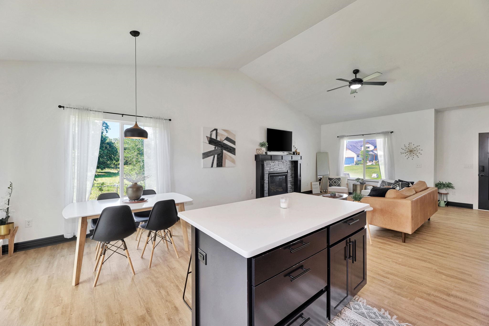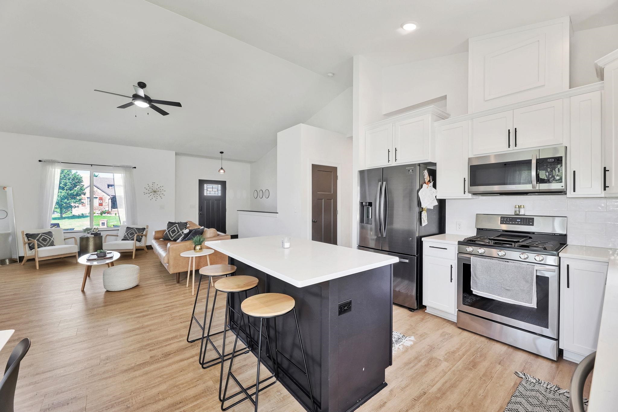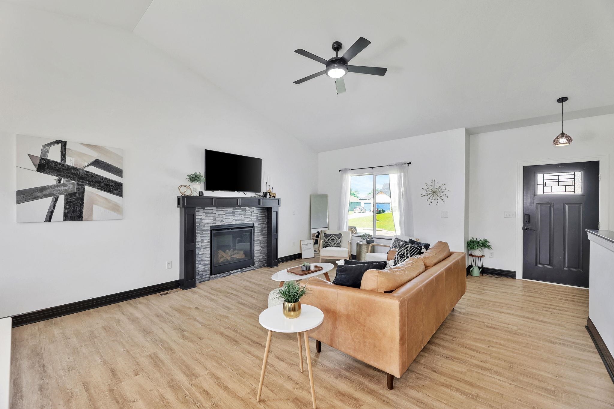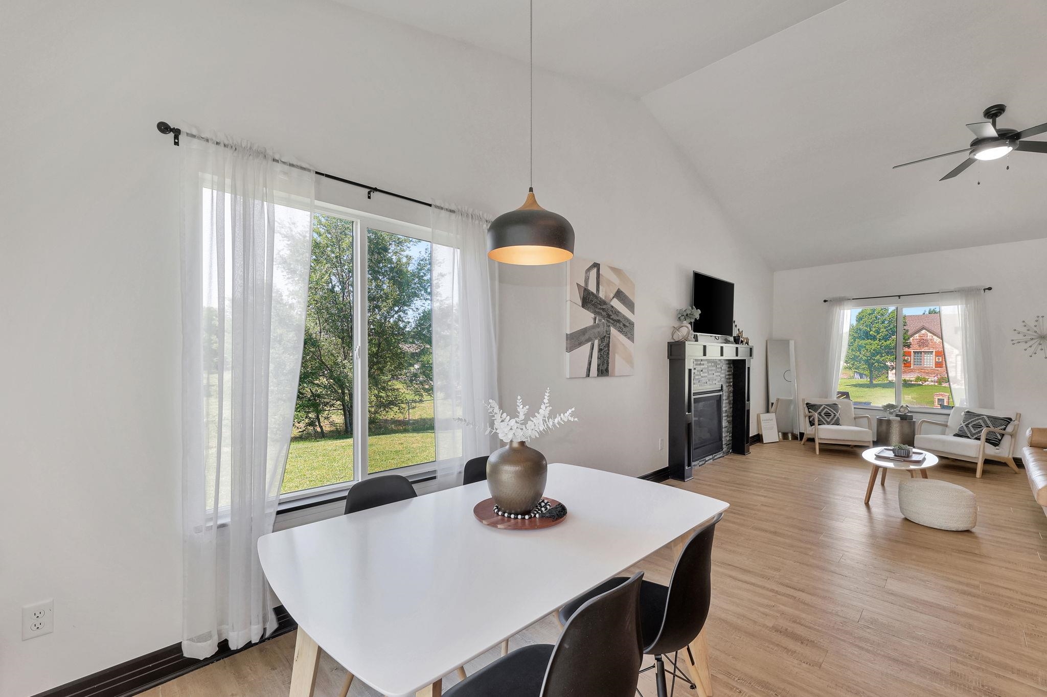 - Description: If you have been waiting for your dream home to come available, the wait is finally over!!! This stunning home is located in a quiet neighborhood, Derby school district, and situated on a large lot with 3 car side load garage access from a private cul-de-sac. You will enjoy all of the perks of a newer home with NO SPECIALS! Prepare to be captivated by the open concept floorplan, vaulted ceilings, and upgraded modern finishes. This floorplan was thoughtfully designed allowing ample space in the dining and living area to expand seating when hosting guest or large family gatherings! An unrestricted dining space is hard to find in most new home floorplans! The living area is equipped with a gas fireplace, kitchen island with seating and granite countertops, upgraded light fixtures, a gas range, stainless steel appliances, and luxury wood laminate flooring. Enjoy your morning coffee on your covered back patio with a peaceful view of mature trees. The oversized main floor laundry and mud room is located directly off of the garage and includes a drop zone! The bathroom features a luxurious design with a black chandelier hanging from the ceiling, which provides an elegant touch. The bathtub is nestled in a corner beneath a frosted window, offering privacy and natural light. The bathroom is equipped with a dual vanity with granite countertops providing a mix of black and white patterns, complementing the dark cabinetry and flooring below. The walk-in tile shower is equipped with two built in shower niches! off the Owners suite is a spacious walk-in master closet with built-in shelving! Two additional bedrooms and an additional bathroom complete the main floor. All bathrooms have been upgraded with granite countertops! The finished basement offers a large recreation room, a generously sized third bathroom with built in shelving, two additional bedrooms, and an oversized storage area! The possibilities are endless with your spacious backyard on a 0.4-acre lot! The yard has been reseeded this fall and will be ready for you to enjoy a nice green yard this coming spring! Call and schedule your showing today! Show all description