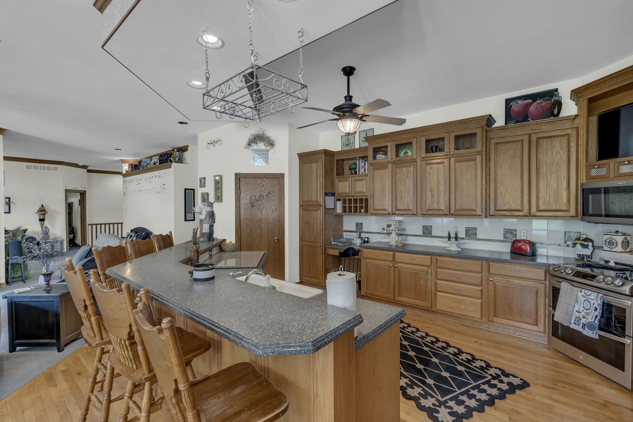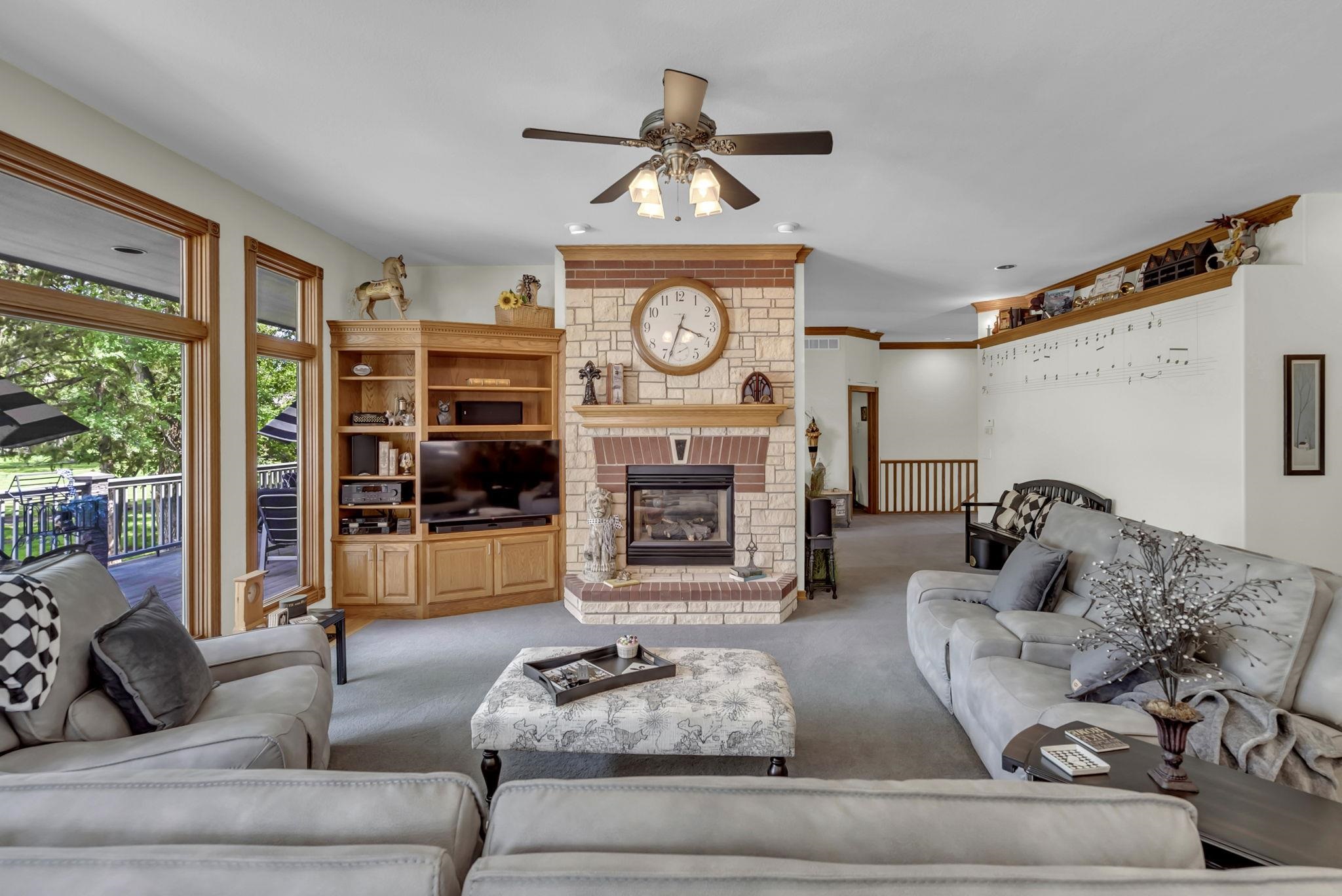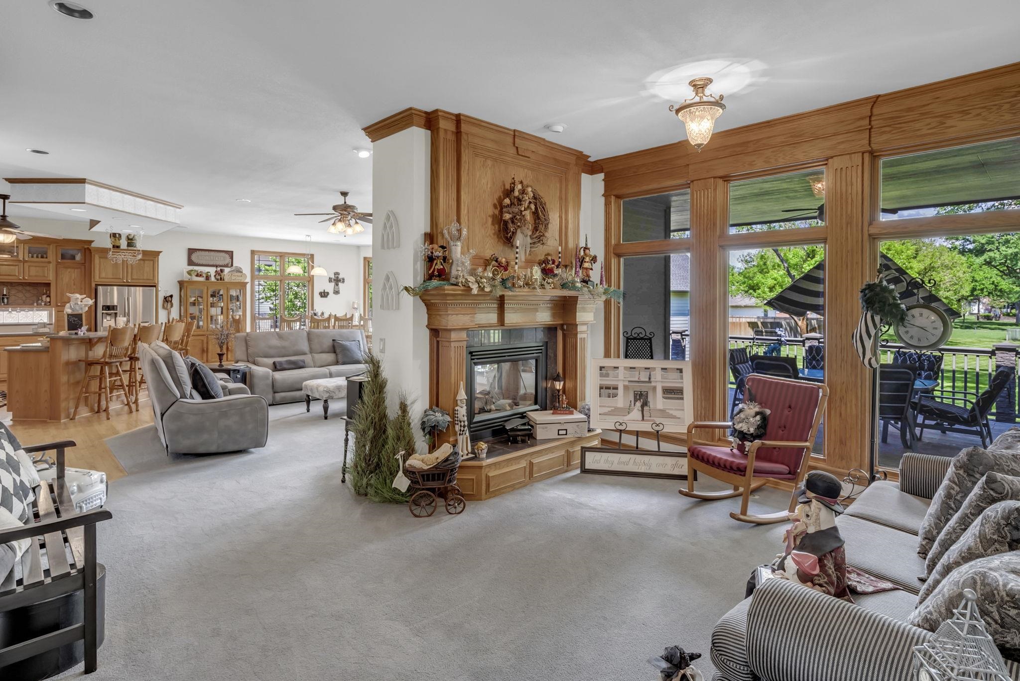 - Description: Amazing Tudor architectural designed 1 story home that features traditional, formal and charming characteristics that make this a one of a kind. This specifically designed one owner home shows pride of ownership. Situated on 1.17 acres with mature trees and beautiful surroundings. The exterior has beautiful curb appeal and a court yard to enhance the entry appeal. Brick exterior, 40x12 deck, 3 car attached oversized side load garage and detached oversized garage with two overhead doors. The interior compliments the exterior design. Impressive entryway. Tall windows and window groupings that include bay windows. Arched doorways and more. Two way stone fireplace on main floor with built in cabinets for TV placement and accessories. Hard surface counters. Wood, carpet and tiled flooring. High quality craftsman-style woodwork. Desirable open kitchen with a free standing island and eating bar that seats 6. Desk, Walk in pantry, and Surround sound. All complimented by the high ceilings through out. Dining room that is spacious enough for a table that seats 14. Formal living space. Glass door entry into one of the main floor bedrooms. All main floor bedrooms feature walk-in closets and built in desks. The main floor master suite has access to the spacious deck, includes decorate high ceilings, a private master bath that boasts a soaker tub and separate shower, vanities and separate dressing room, a sizeable walk-in closet with built in dressers. The 17x10 laundry room includes a multi-functional hall tree, desk, spacious counters, full size sink and more. The lower level is designed for entertainment. Game room. Wet bar, A play room under the stairs. Amazing family room with incredible built in entertainment center and fireplace. Powder room for guests. Two additional spacious bedrooms, amazing walk in closets., Jack & Jill bath and so much more. Plenty of storage space. Well maintained mechanical room, storm room. Zoned HVAC system, two water tanks. So many design secrets to honor this home. Rio Vista Estates! Walking distance to the Arkansas River that surrounds this community of homes. Show all description