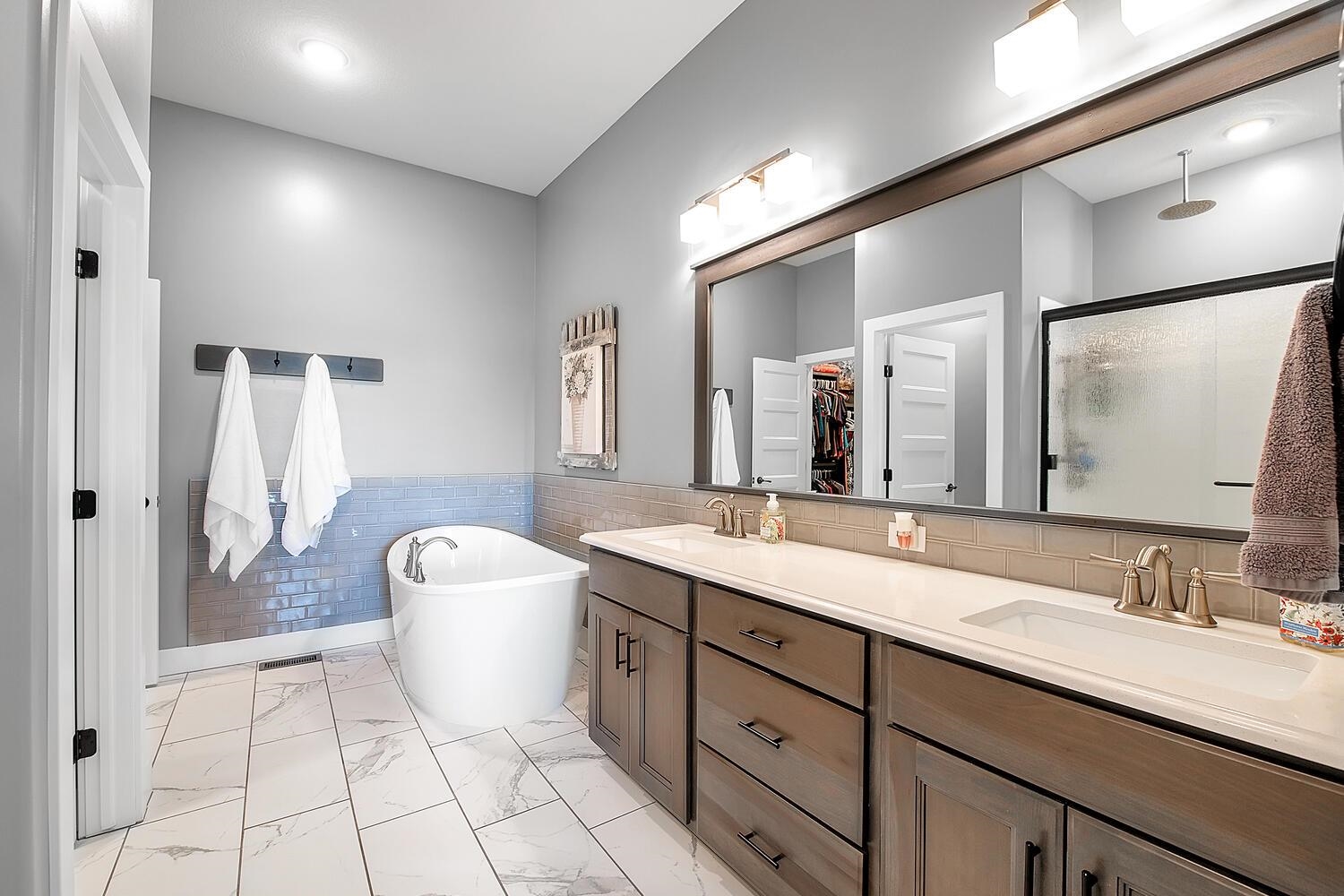 - Master Bedroom: Master Bdrm on Main Level, Split Bedroom Plan, Master Bedroom Bath, Sep. Tub/Shower/Mstr Bdrm, Two Sinks, Quartz Counters, Water Closet