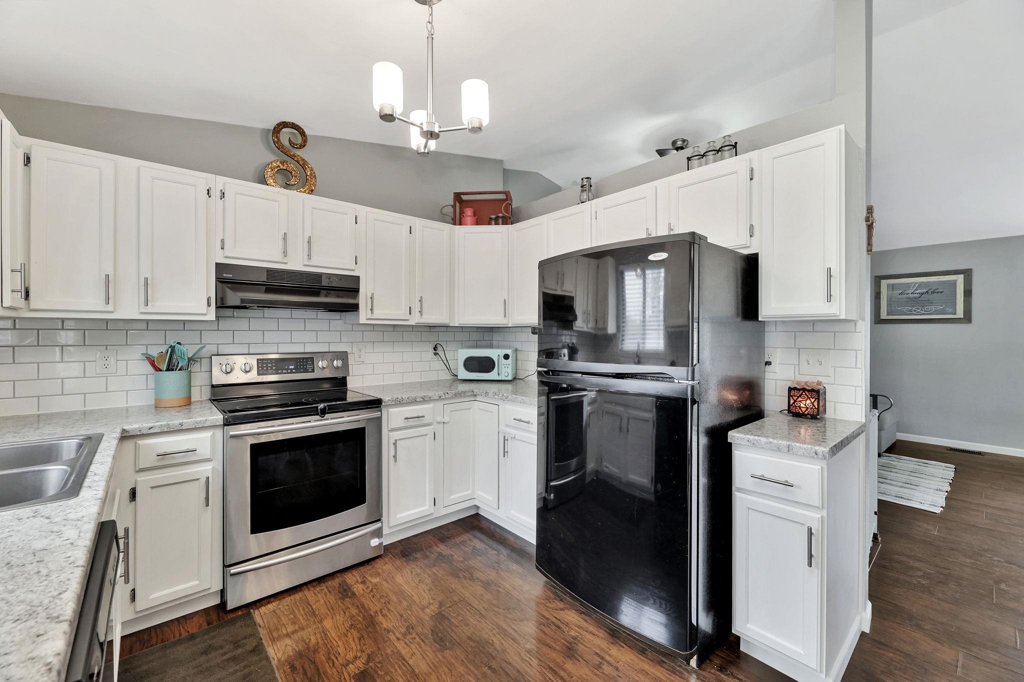 - Description: A truly special home which has been well-maintained and is move-in ready! This beautiful open concept home features many updates throughout. In the spacious living room you will find vaulted ceilings and an updated fireplace as the focal point of the room. The modern kitchen features a subway tile backsplash, a blend of stainless steel and black appliances and a dining area. The large full bath has been freshly updated! Brand new carpet has been installed in the bedrooms and on the stairs leading to the basement. In the basement you will find updated flooring in the family room, a storage area and the laundry. French doors lead to the oversized back-yard offering privacy with new and updated fencing and no neighbors to the back of the property. Mature trees provide an abundance of shade and a newer large concrete patio is perfect for grilling and gatherings. Vinyl siding and a brand new roof in charcoal (completed mid-May 2025) complete the low maintenance exterior. Contact Debbie to schedule your private showing soon, this property will not last! Show all description