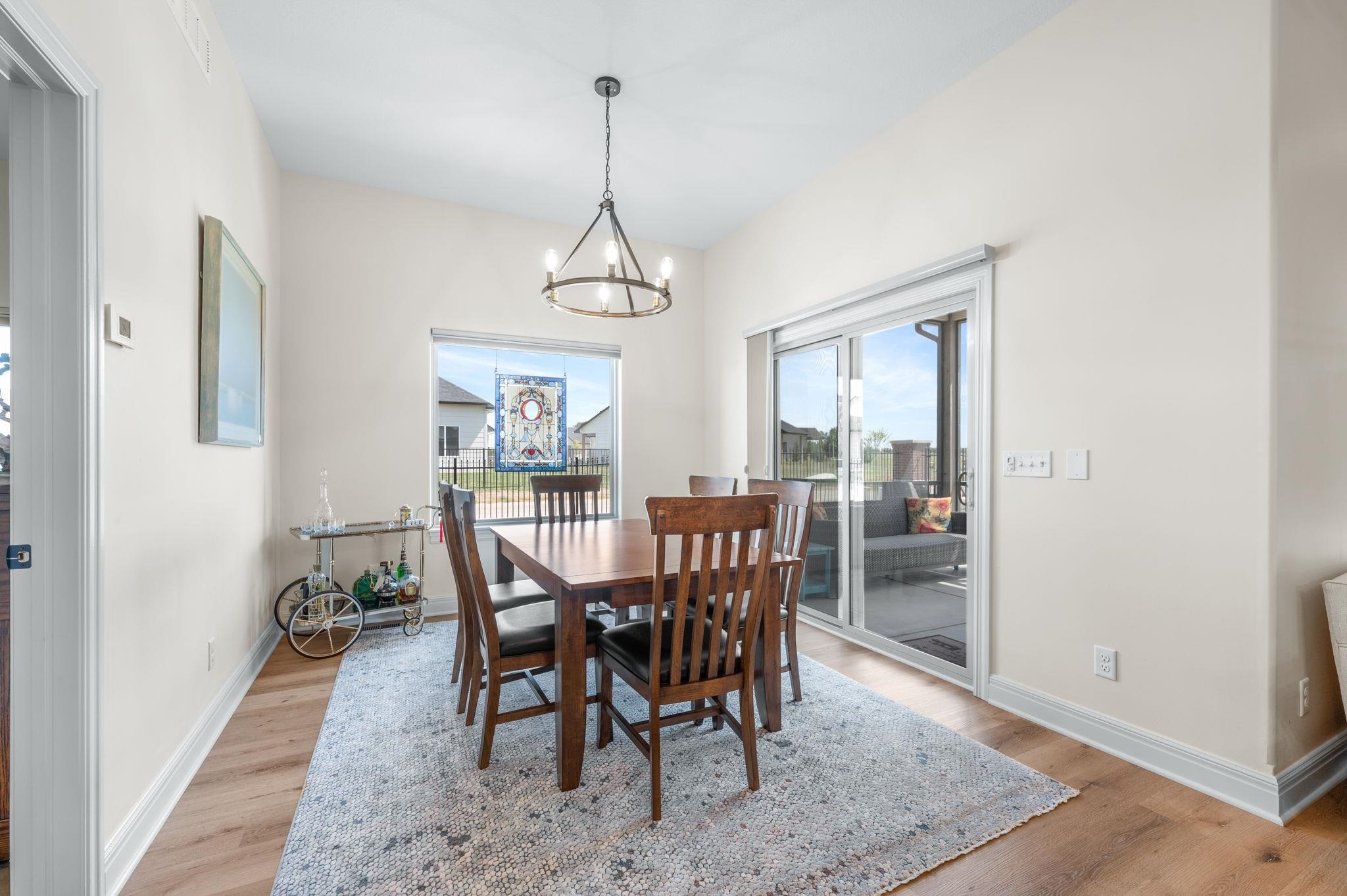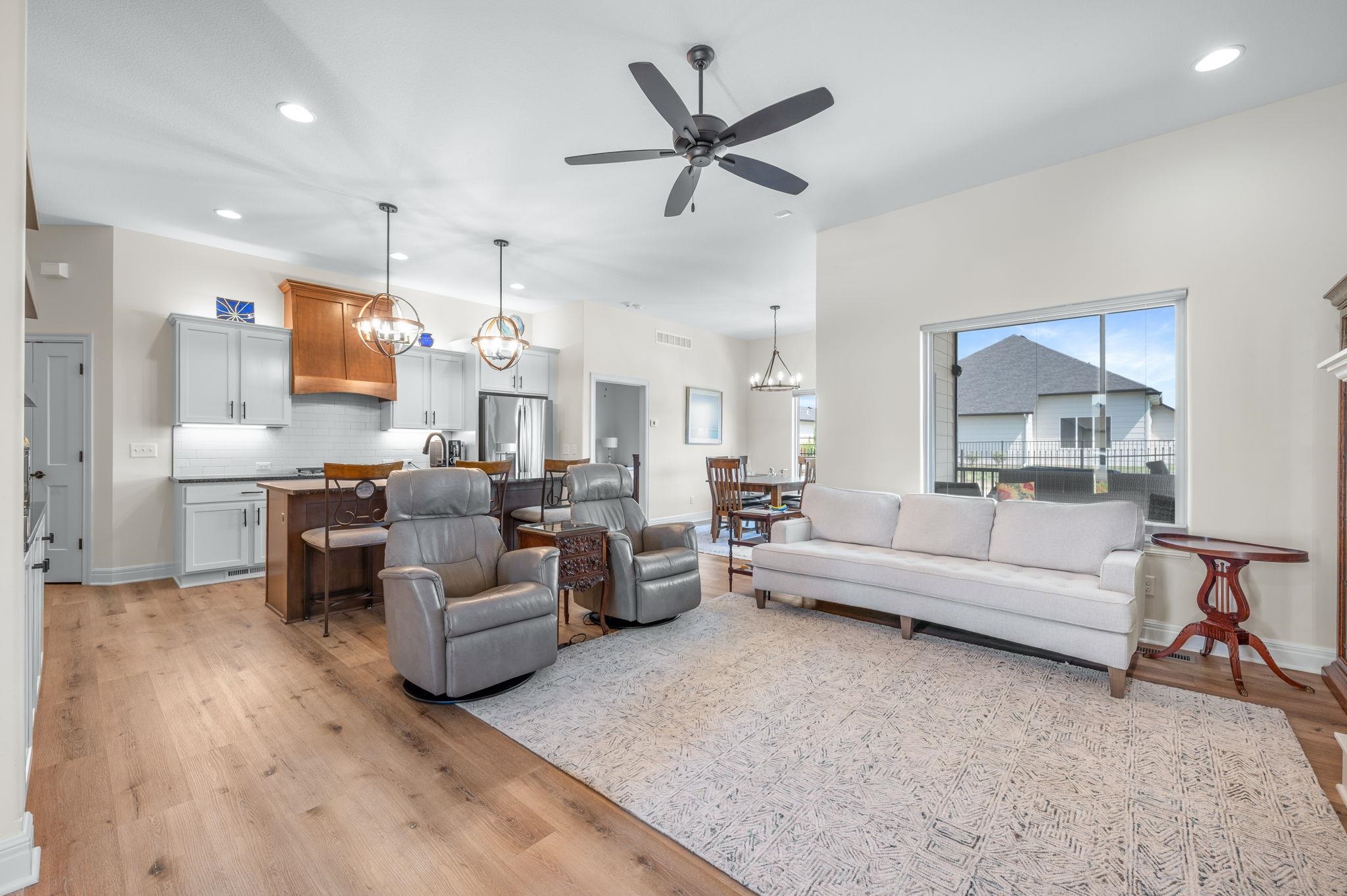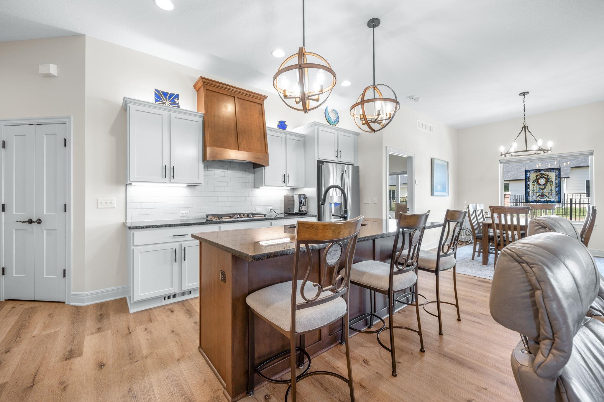- Description: Enjoy low-maintenance luxury living in this beautifully designed twin home tucked away on a quiet dead-end street. The spacious open floor plan is ideal for entertaining, featuring a warm and inviting living room with a stone-surround gas fireplace, large sun-filled window, luxury vinyl flooring, and ceiling fan. The gourmet kitchen boasts an oversized granite island with breakfast bar, stunning tile backsplash, recessed and under/over cabinet lighting, and two pantry spaces for ample storage. Adjacent to the kitchen, the dining area offers a stylish chandelier, large window, and sliding glass doors leading to a screened-in patio—perfect for relaxing evenings outdoors. Retreat to the serene primary suite with luxury vinyl flooring, generous natural light, ceiling fan, and a walk-in closet equipped with custom shelving and triple-level hanging rods. The spa-inspired en-suite bath includes quartz countertops, double sinks, a private water closet, and a beautifully tiled walk-in shower with built-in bench. Main floor laundry adds convenience with granite countertops, a sink, and hanging rod. The finished basement is ideal for hosting guests or unwinding, with a spacious rec room featuring an electric fireplace, built-in shelving, luxury vinyl floors, and a sleek granite wet bar. A large bedroom, private office with French doors, full bath, and plenty of storage complete the lower level. Outdoor living is just as impressive, with a screened-in patio and additional concrete patio with a charming stone sitting wall and built-in lighting. Located near Terradyne, hop on your golf cart and head to the course or enjoy dinner at the clubhouse. This home is truly a must-see! Show all description