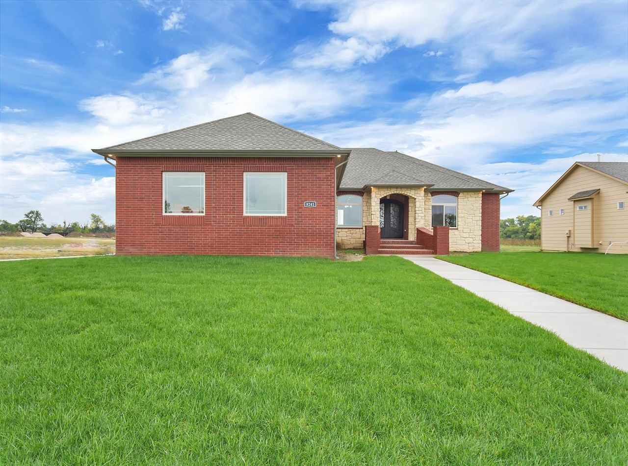 - Description: Tucked away on a cul de sac in northeast Wichita, this brand new 5 bedroom, 4 1/2 bath estate is your dream home. Featuring high-end upgrades, NO SPECIALS, gorgeous pond views, and nearly 4, 000 sq. ft. of space within, it's fully loaded and ready for its first owner to call it "home." As you pull in you'll notice the 3 car side garage and the stately brick and stone facade in the front of the home. Head inside and be blown away by the masterful design and luxury touches. The living room is under a coffered ceiling and has a fireplace that makes a beautiful backdrop for holiday gatherings. Huge picture windows throughout the home envelope each room in bright, natural light. The living room is open to the kitchen which gives you the perfect layout for entertaining. The kitchen is any home chef's dream, with granite counters, an eating bar island, and a big walk-in pantry. The attached dining area is seated in front of enormous windows that offer lovely views of the pond outside. Your master bedroom has a tray ceiling and a spa-like en suite bath with granite counters, a huge tub, and a separate shower. It's like a personal retreat! Two more big bedrooms, a full bath, and a half bath complete this spacious main floor. Head downstairs to find a large family/recreation room under 9 ft. ceilings. There's walk-out access to the back yard, plus built-in shelves and a wet bar. Two additional bedrooms and bathrooms finish this home's layout and give you so much space to spread out. Located close to the beautifully maintained Willowbend Golf Club, several parks, and plenty of shopping and dining options, you have found an incredible home in an absolutely stunning new development. Schedule your private showing today and come see this one before it's gone forever! Show all description