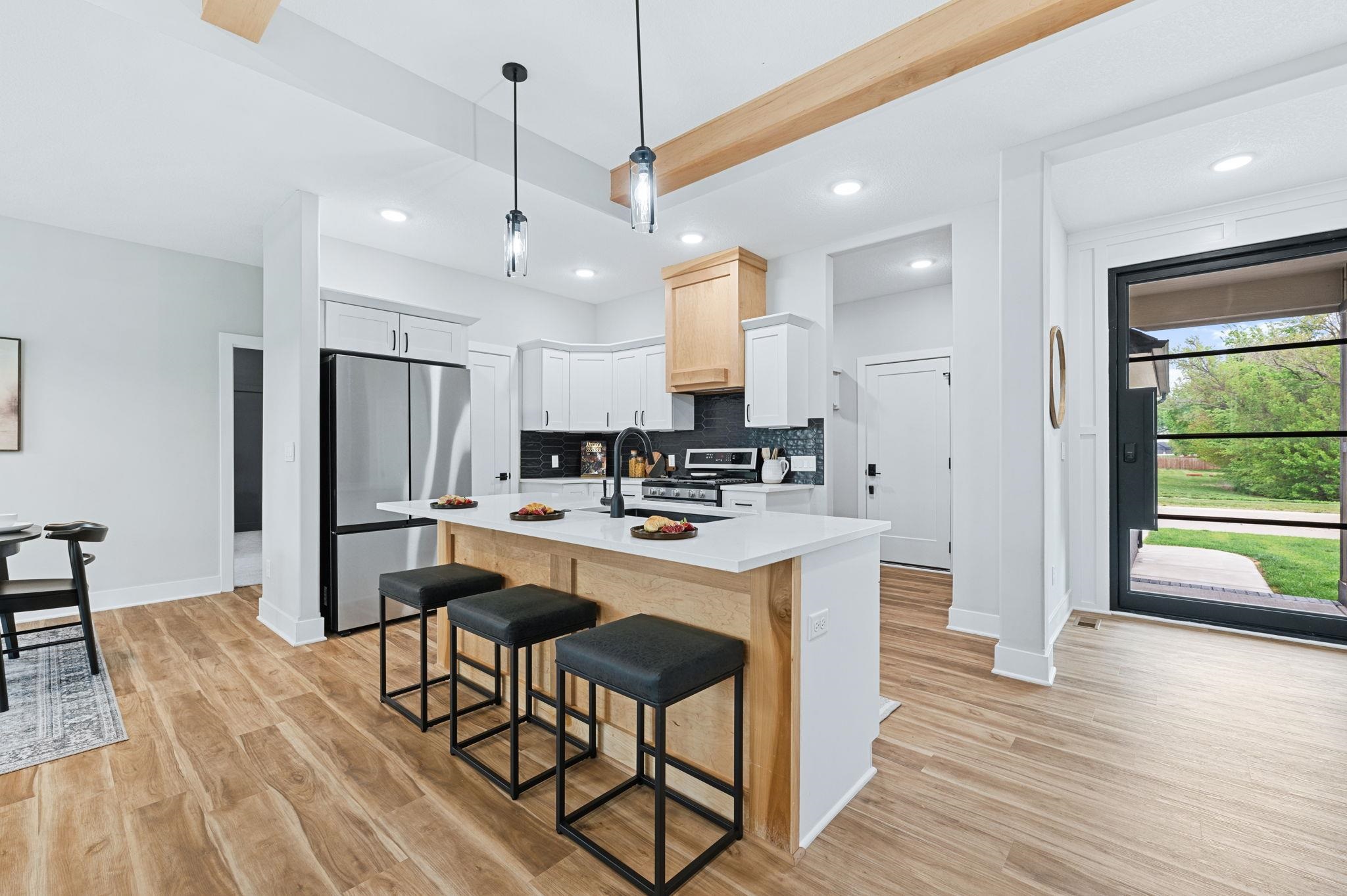 - Description: Welcome to this stunning, like-new home ideally located just minutes from McConnell AFB and within the top-rated Derby School District.Thoughtfully designed with an open floor plan and flooded with natural light, this home offers both style and comfort. You’ll love the numerous upgrades throughout—from modern fixtures and finishes to upgraded flooring and custom touches that truly set this home apart. The kitchen comes fully equipped—all appliances stay—so you can move right in and start cooking! Enjoy seamless indoor-outdoor living with a covered deck overlooking open space—no backyard neighbors to interrupt your view. Downstairs, the finished basement features a stylish wet bar, perfect for entertaining or relaxing. With quality upgrades, prime location, and unbeatable privacy, this home is the total package. Show all description
