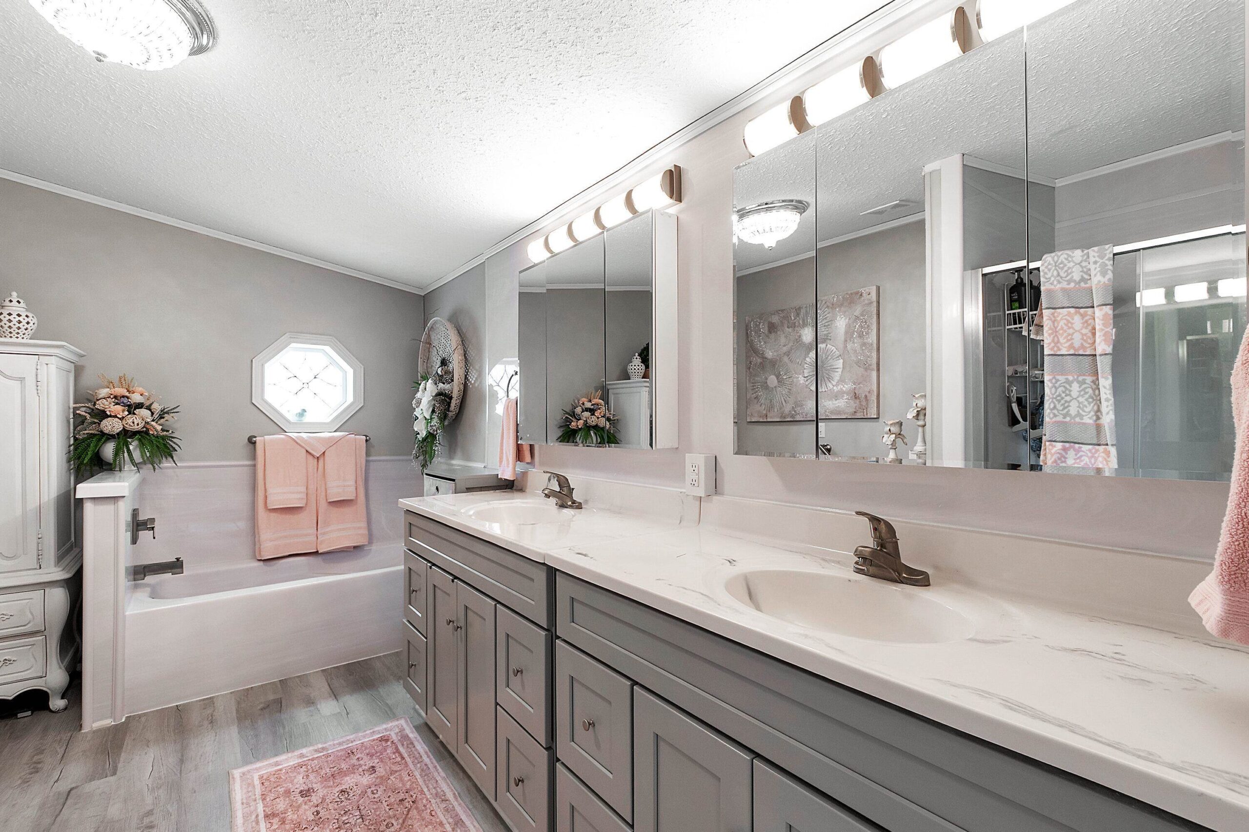 - Master Bedroom: Master Bdrm on Main Level, Split Bedroom Plan, Sep. Tub/Shower/Mstr Bdrm, Two Sinks, Laminate Counters