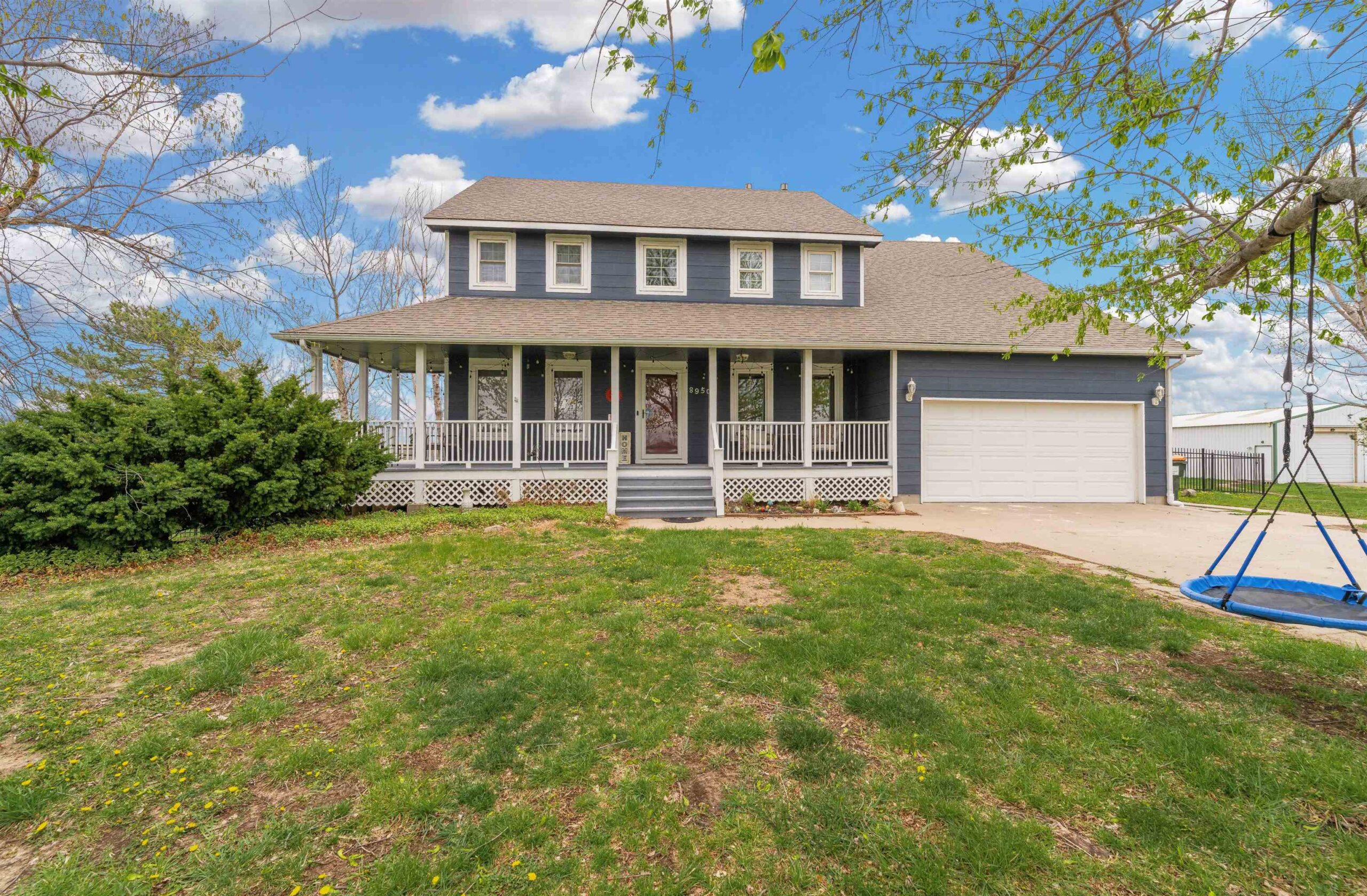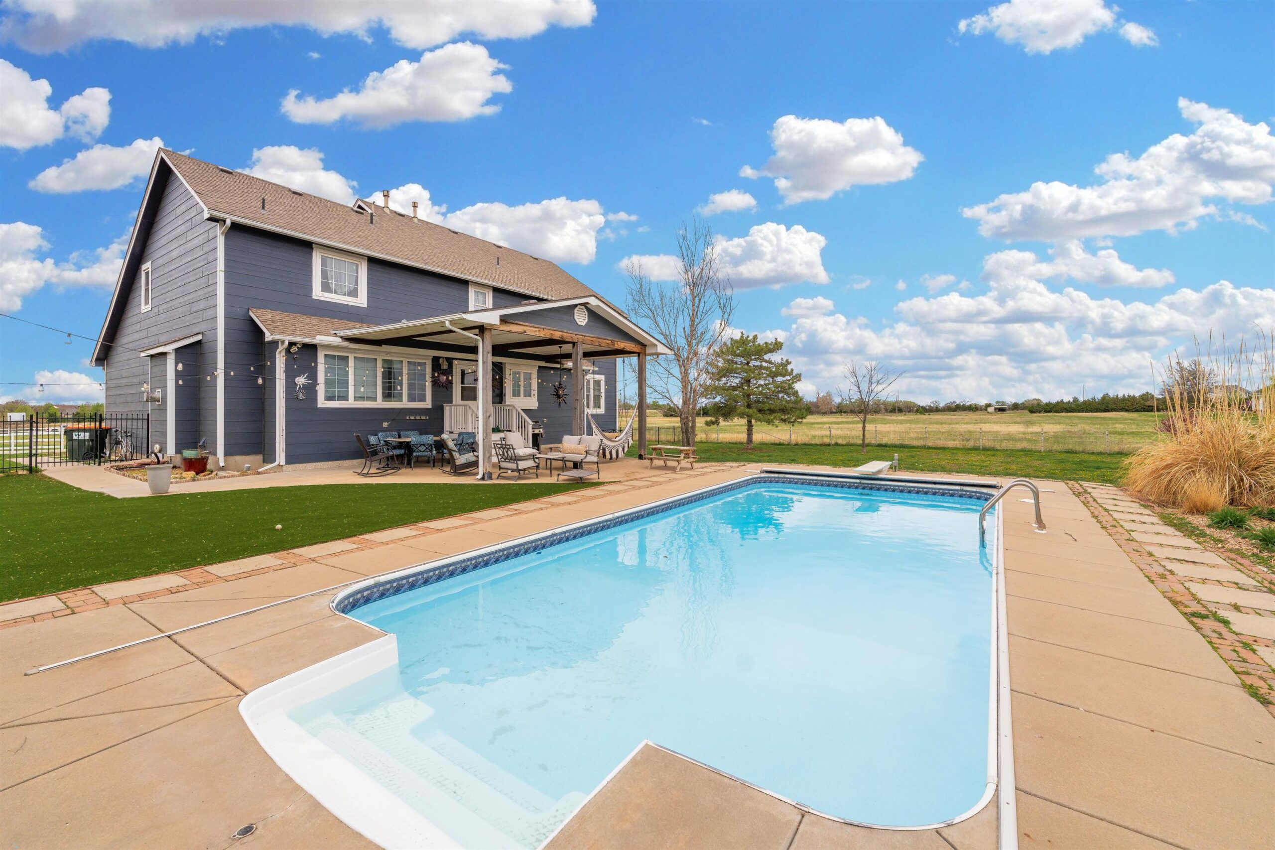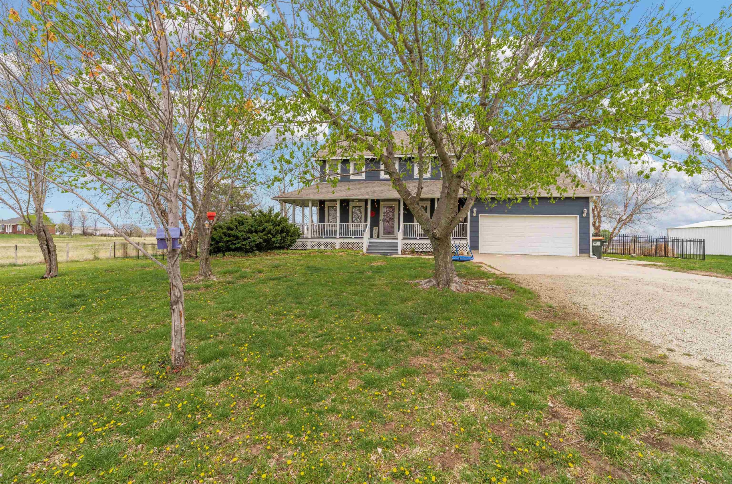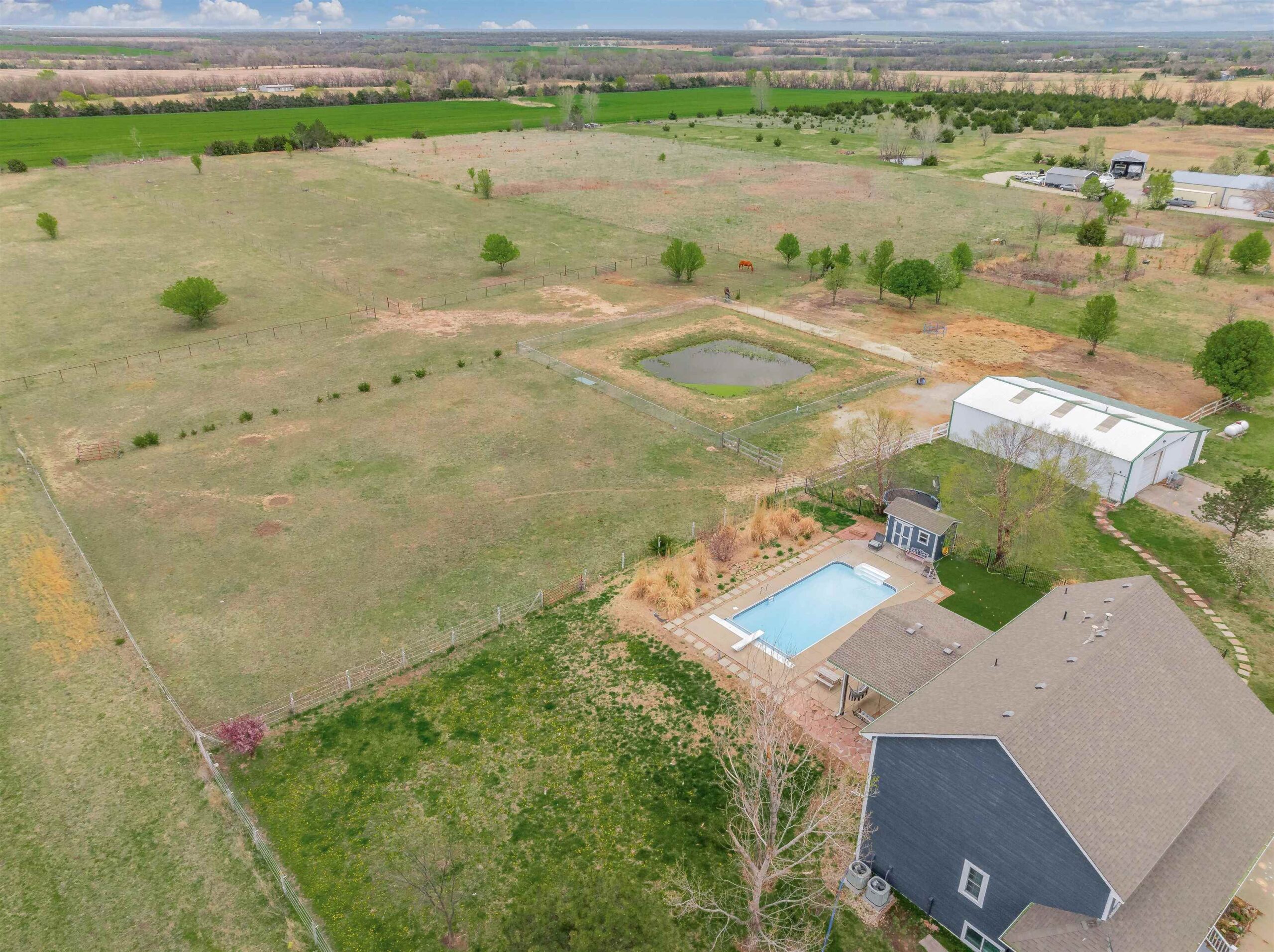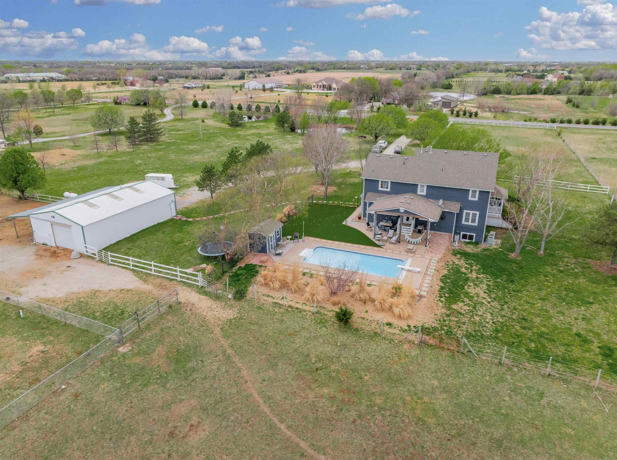 - Description: This 4/5 bedroom 3 ½ bathroom home is the perfect mix between modern farmhouse and rural Derby. The house is just minutes away from the grocery store and restaurants, but you feel like you are out in the country. This home begins to impress from the start. As you drive down the tree lined driveway there is a pond stocked with bass and fire pit on the south and a corral area that gives ample flat and enclosed area for exercising the horses or practice riding. When you pull up to the 2 story home, you will notice an amazing front porch to sit and enjoy the sunsets. As you enter the home there is an office/bonus room on the right and a formal dining room on the left. The large formal dining room is big enough for a very large table. Next to the dining room is a sitting room that carries a cozy feel for family and friends. The show piece of the main floor is the kitchen. The amazing kitchen boasts maximum storage space – huge pantry – granite countertops – and multiple cabinets with pullout drawers. All of the appliances stay as well as the new refrigerator and new washer and dryer. There is a half bath on the main floor. The living room has wood floors, fireplace, large picture window for natural light and an abundance of room. From the living room / kitchen area, there is access to the back yard that has a covered back patio, fenced in inground pool area, and pool equipment shed. The 4 bedrooms are all located on the upper level. The main bedroom is 16 ft x 16 ft with 2 closets – storage area – very spacious main bathroom with 2 sinks and separate tub and shower. The 3 additional bedrooms have lots of room for the kids or guests. The upper level bathroom has 2 sinks. Finished in the basement is a family/game room. There is also room for a kids play area and a TV / movie area. There is a full bathroom and laundry. The bonus room could easily be a 5th bedroom. Just remove the beverage center and convert to a closet. The room has an egress window. If that is not enough. There is a 40 x 50 working horse barn with tack room. There have been many upgrades completed to the barn as well as the pasture areas. They added a new well and pump – auto watering bowls for each stall – 3 indoor stalls – and fully enclosed chicken coop. The pasture area has 3 fenced paddocks with new fencing for rotation of livestock and any other animals. Do not miss this home. It has it all. Call me and set up your private showing today. Show all description