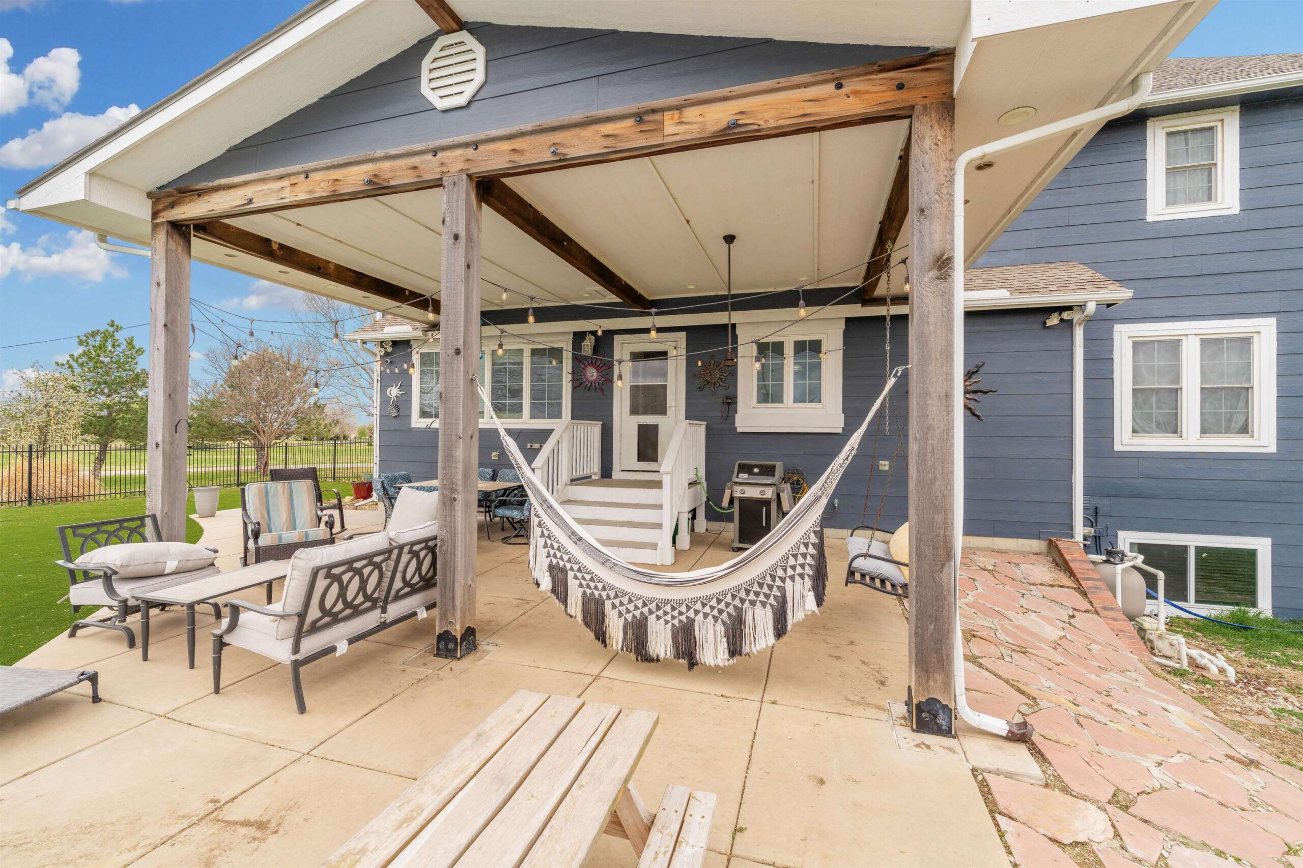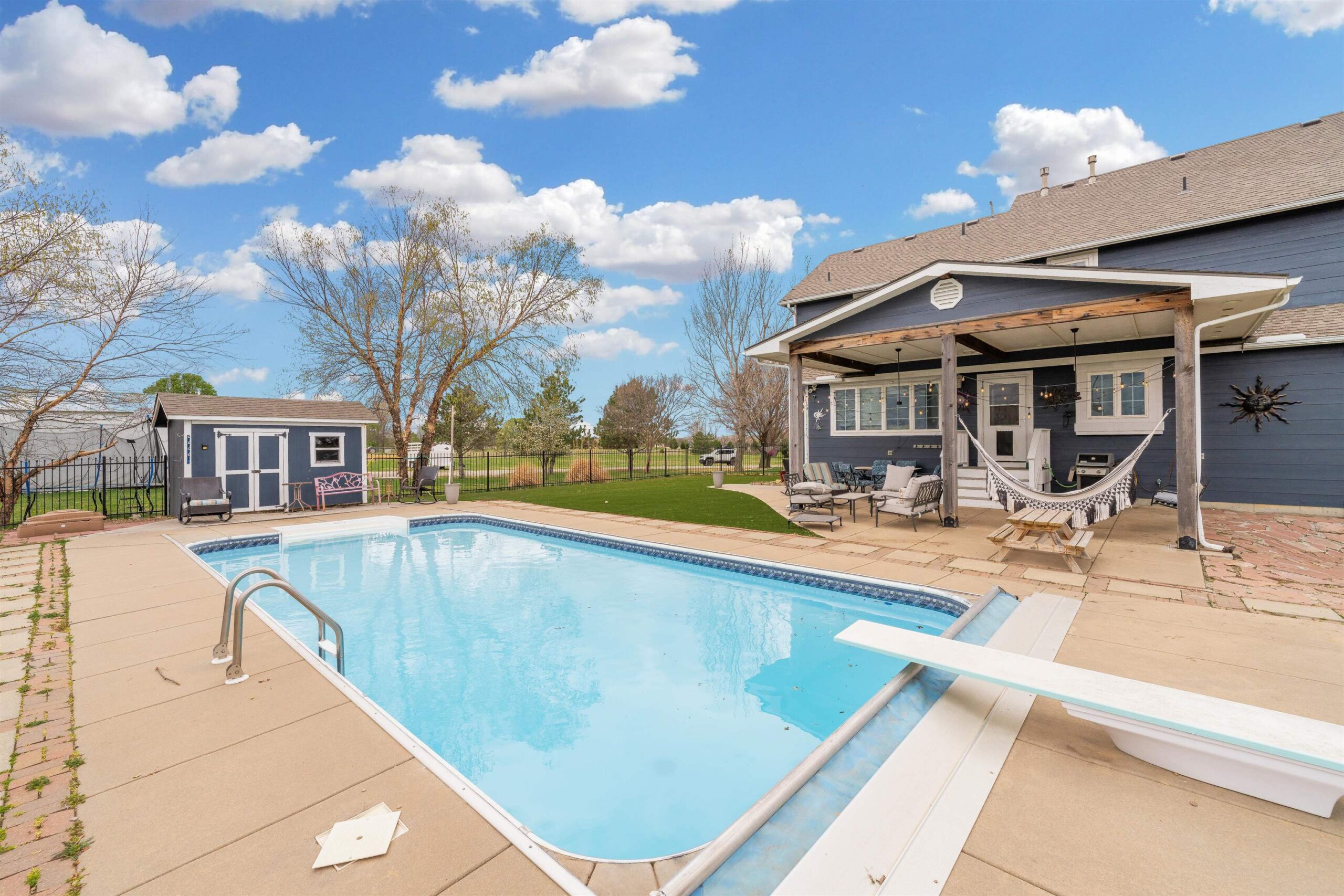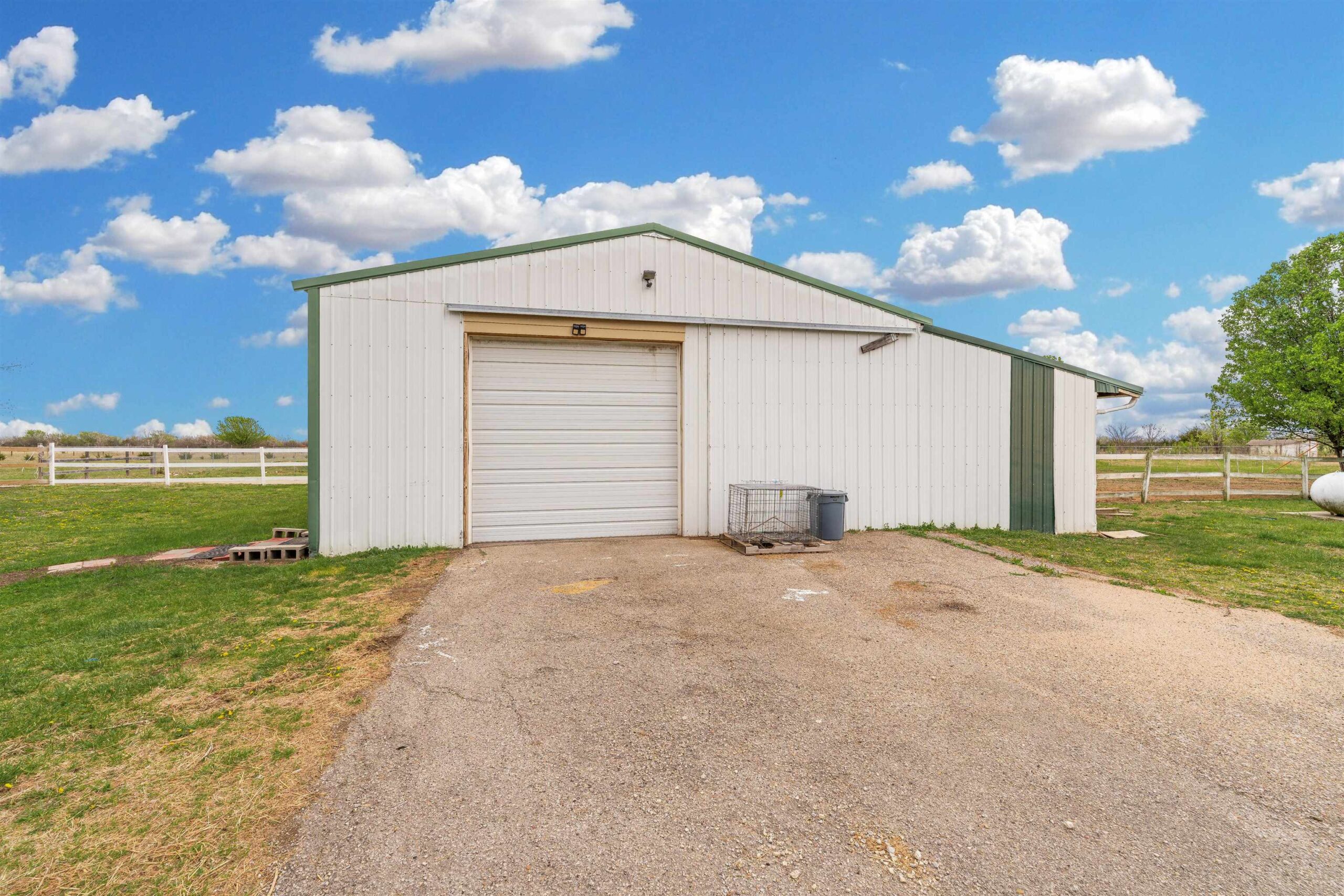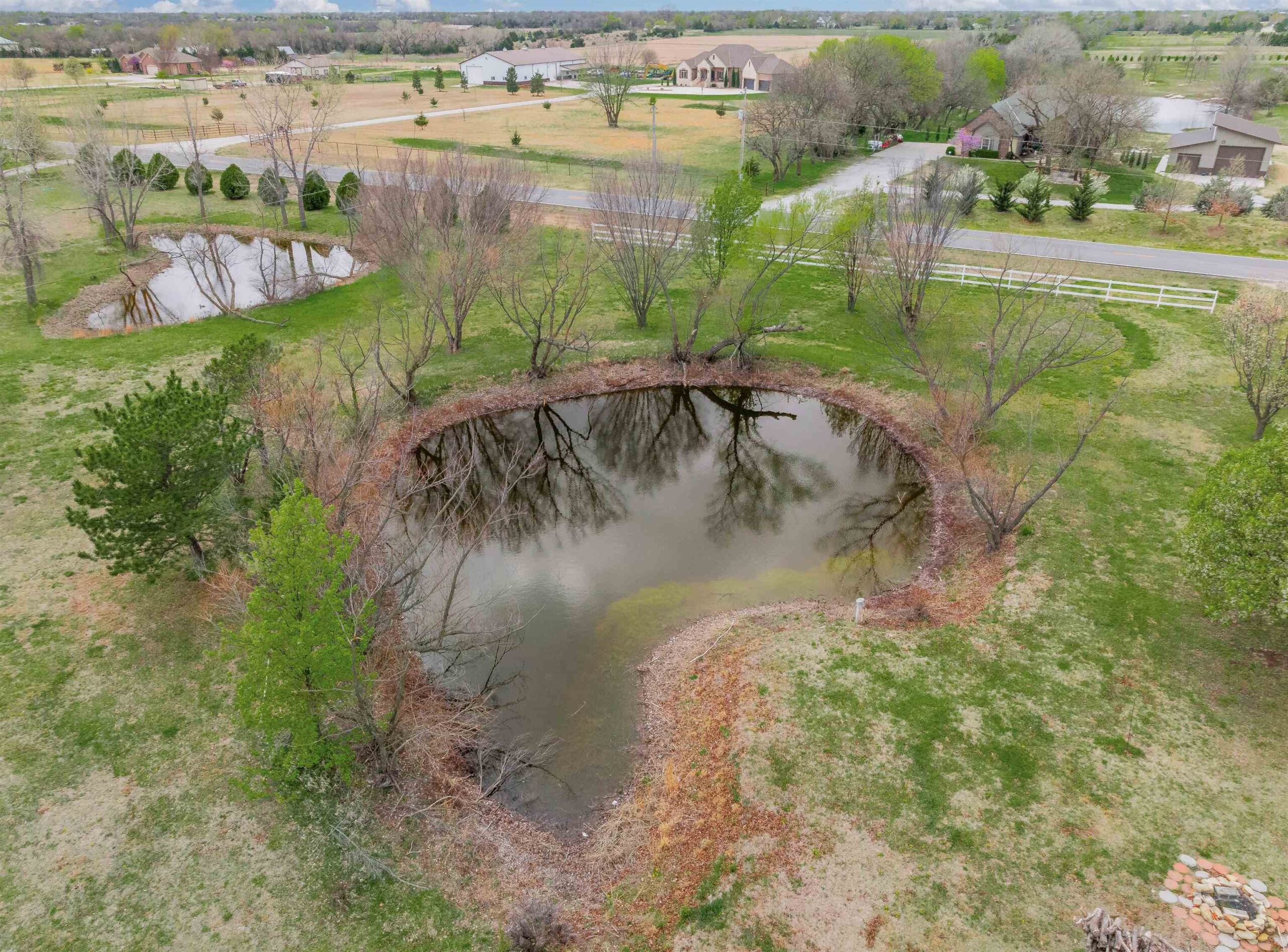 - Description: This 4/5 bedroom 3 ½ bathroom home is the perfect mix between modern farmhouse and rural Derby. The house is just minutes away from the grocery store and restaurants, but you feel like you are out in the country. This home begins to impress from the start. As you drive down the tree lined driveway there is a pond stocked with bass and fire pit on the south and a corral area that gives ample flat and enclosed area for exercising the horses or practice riding. When you pull up to the 2 story home, you will notice an amazing front porch to sit and enjoy the sunsets. As you enter the home there is an office/bonus room on the right and a formal dining room on the left. The large formal dining room is big enough for a very large table. Next to the dining room is a sitting room that carries a cozy feel for family and friends. The show piece of the main floor is the kitchen. The amazing kitchen boasts maximum storage space – huge pantry – granite countertops – and multiple cabinets with pullout drawers. All of the appliances stay as well as the new refrigerator and new washer and dryer. There is a half bath on the main floor. The living room has wood floors, fireplace, large picture window for natural light and an abundance of room. From the living room / kitchen area, there is access to the back yard that has a covered back patio, fenced in inground pool area, and pool equipment shed. The 4 bedrooms are all located on the upper level. The main bedroom is 16 ft x 16 ft with 2 closets – storage area – very spacious main bathroom with 2 sinks and separate tub and shower. The 3 additional bedrooms have lots of room for the kids or guests. The upper level bathroom has 2 sinks. Finished in the basement is a family/game room. There is also room for a kids play area and a TV / movie area. There is a full bathroom and laundry. The bonus room could easily be a 5th bedroom. Just remove the beverage center and convert to a closet. The room has an egress window. If that is not enough. There is a 40 x 50 working horse barn with tack room. There have been many upgrades completed to the barn as well as the pasture areas. They added a new well and pump – auto watering bowls for each stall – 3 indoor stalls – and fully enclosed chicken coop. The pasture area has 3 fenced paddocks with new fencing for rotation of livestock and any other animals. Do not miss this home. It has it all. Call me and set up your private showing today. Show all description