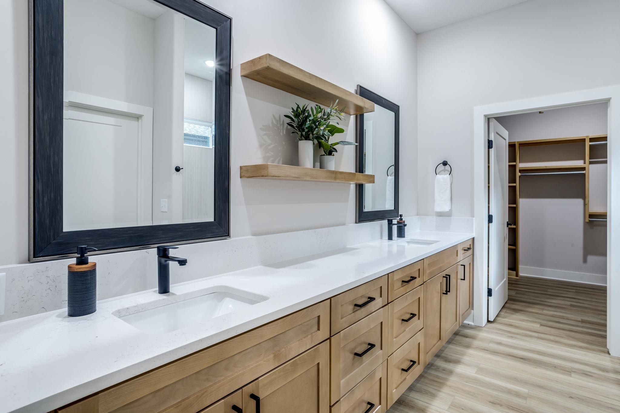 - Master Bedroom: Master Bdrm on Main Level, Split Bedroom Plan, Master Bedroom Bath, Sep. Tub/Shower/Mstr Bdrm, Two Sinks, Quartz Counters