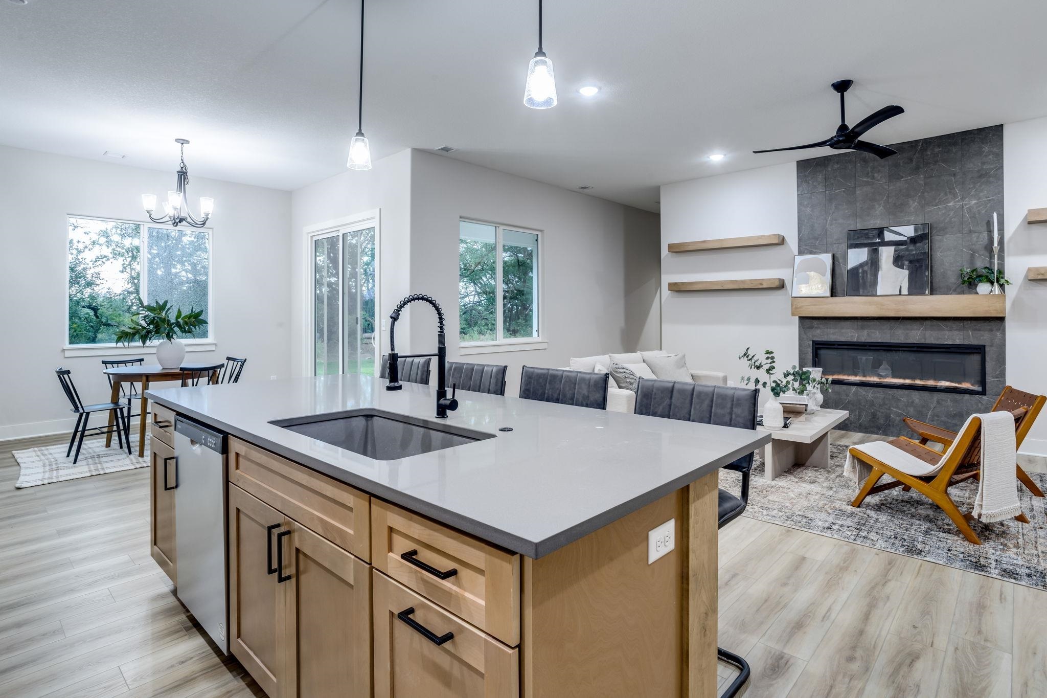 - Description: Zero Entry home with 4 bedrooms, 3 bath, 3 car garage on a wooded lot! Great Open Floor Plan has 4 bedrooms and 3 bathrooms. The Kitchen features an Island Cabinet with Quartz Counter Tops and a Walk-in Pantry, Luxury Vinyl Plank Flooring is Throughout the living, kitchen, dining and entryway. Electric Fireplace in the Living with a tile Front. The Master Bedroom has a Tray Ceiling and the Master Bath has Double Vanities and a custom walk in Tile Shower. The Master Closet is also oversized. Covered Patio, Sod & Sprinklers are Included in the Price. The General Taxes and the Special Taxes are Estimated and have not been Fully Assessed to the Property. All information deemed reliable, but not guaranteed. Call for showing Show all description