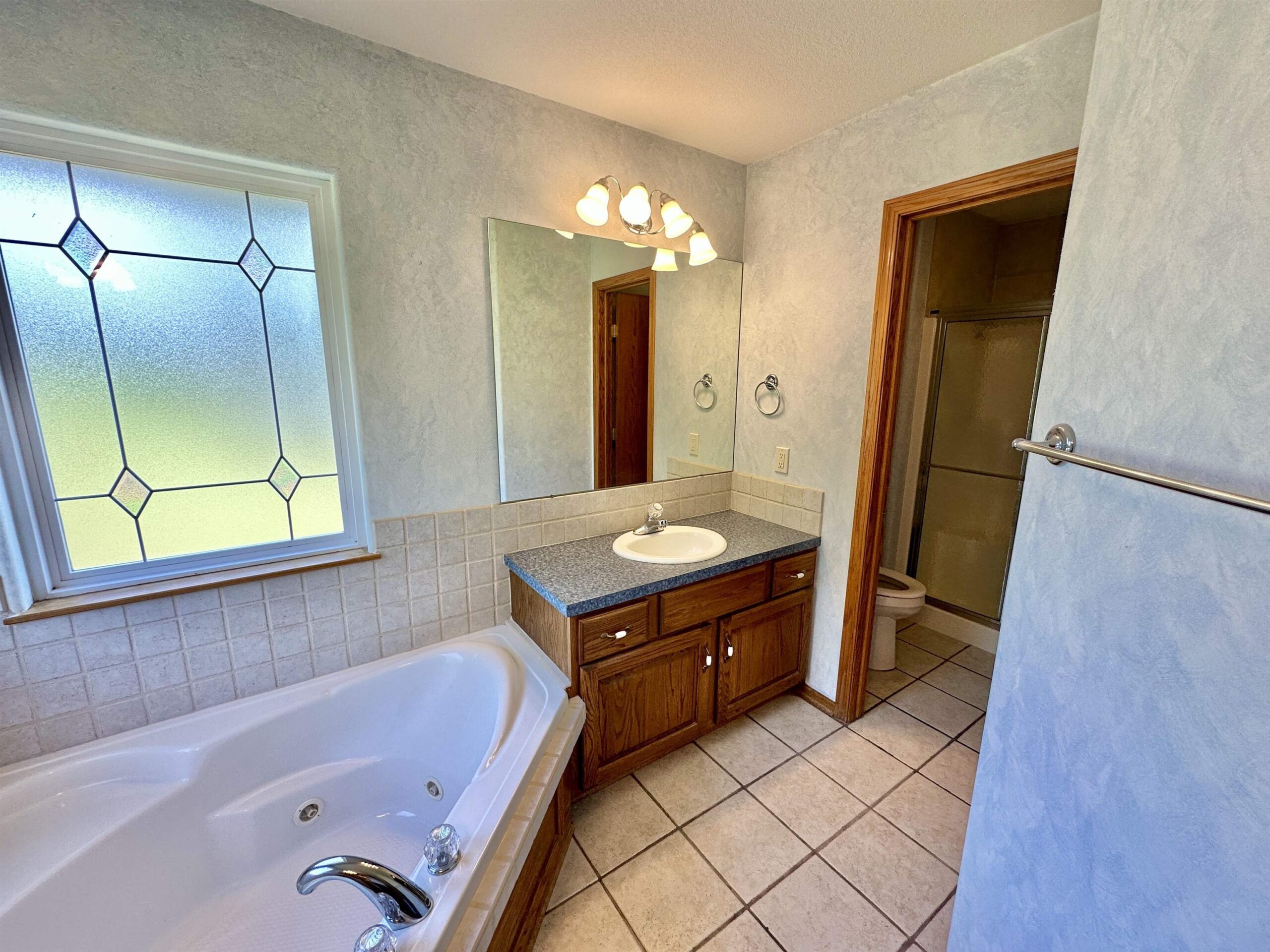 - Master Bedroom: Master Bdrm on Main Level, Tub/Shower/Master Bdrm, Two Sinks, Laminate Counters, Jetted Tub