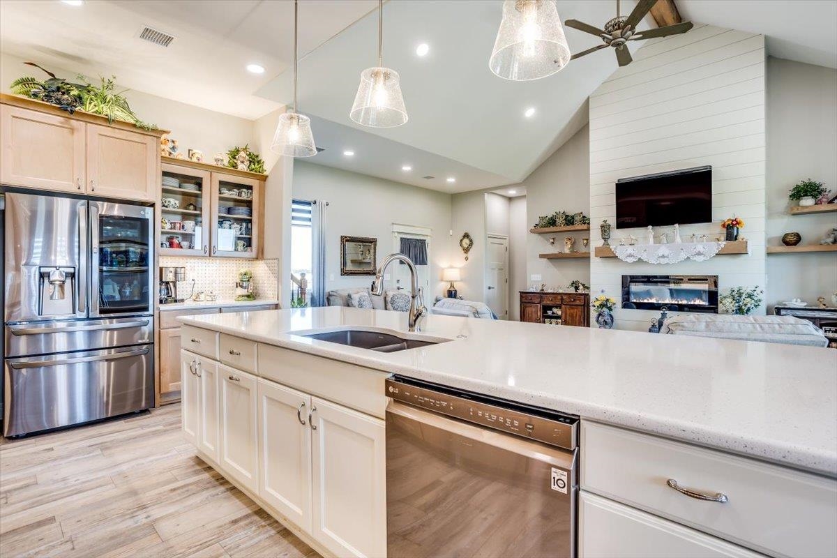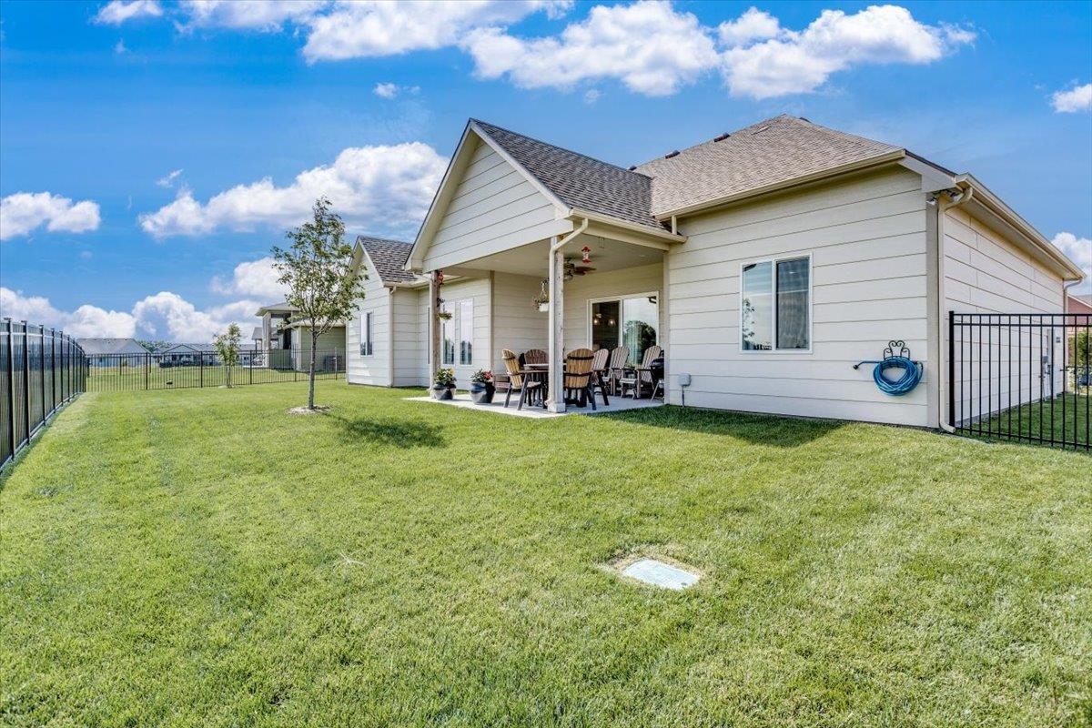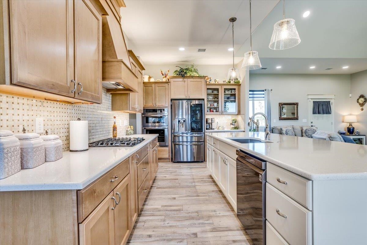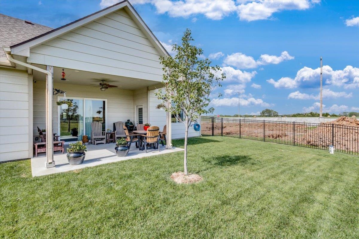 - Description: Perfect ZERO Entry Home with a 3 car tandem garage with parking for 4! Wide open Views, fenced yard and gorgeous landscaping with a SPRINKLER AND A WELL! Split bedroom plan with a private master and a door to your covered patio. Master Bath has double sinks, walk in shower and a private toilet room. HUGE Open Living Room with Fireplace, extra large slider to covered patio, Spacious Island and roomy dining area. Lots of storage areas and a drop zone off by the garage. Separate Laundry room and walk in Pantry doubles as a SAFE ROOM! 3rd bedroom and 3rd full bath in the Bonus Bedroom over the garage!! Feels and looks Brand new! Fence can be moved back 9-10 feet if a buyer would like a larger yard. City Gargen Coop is behind home by pool. Development plan on building a walking path area. Show all description
