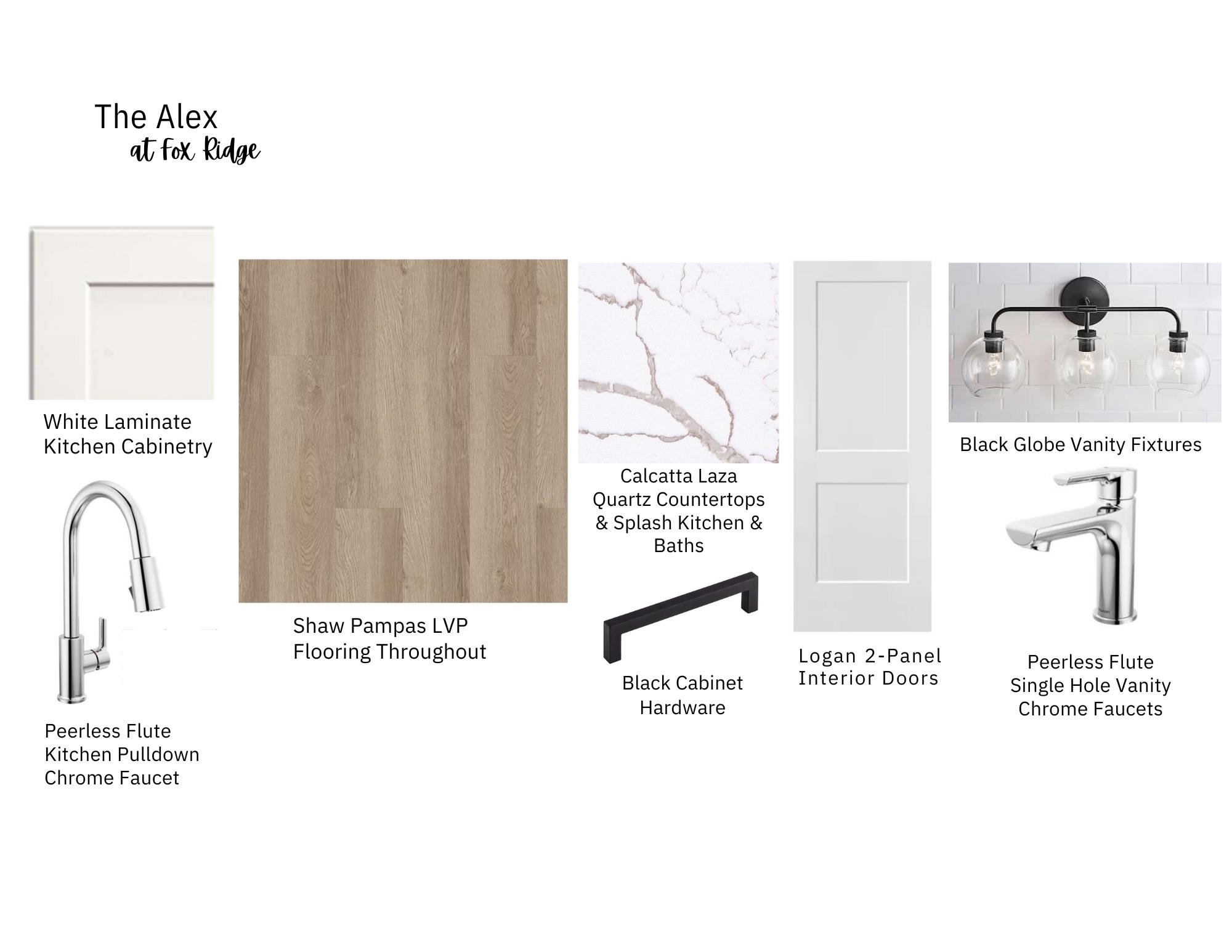 - Description: "The Alex" floor plan features 3 bedrooms, 2 bath with 1150 square feet of living space. Easy care and maintenance LVP flooring throughout. Kitchen and baths feature Calcutta Laza Quartz countertops in both kitchen and baths. Black cabinet hardware and black lighting in bathrooms. Kitchen fixtures are chrome. Come on out and take a look. Show all description