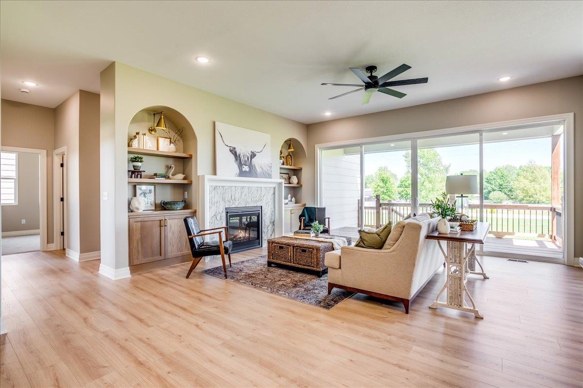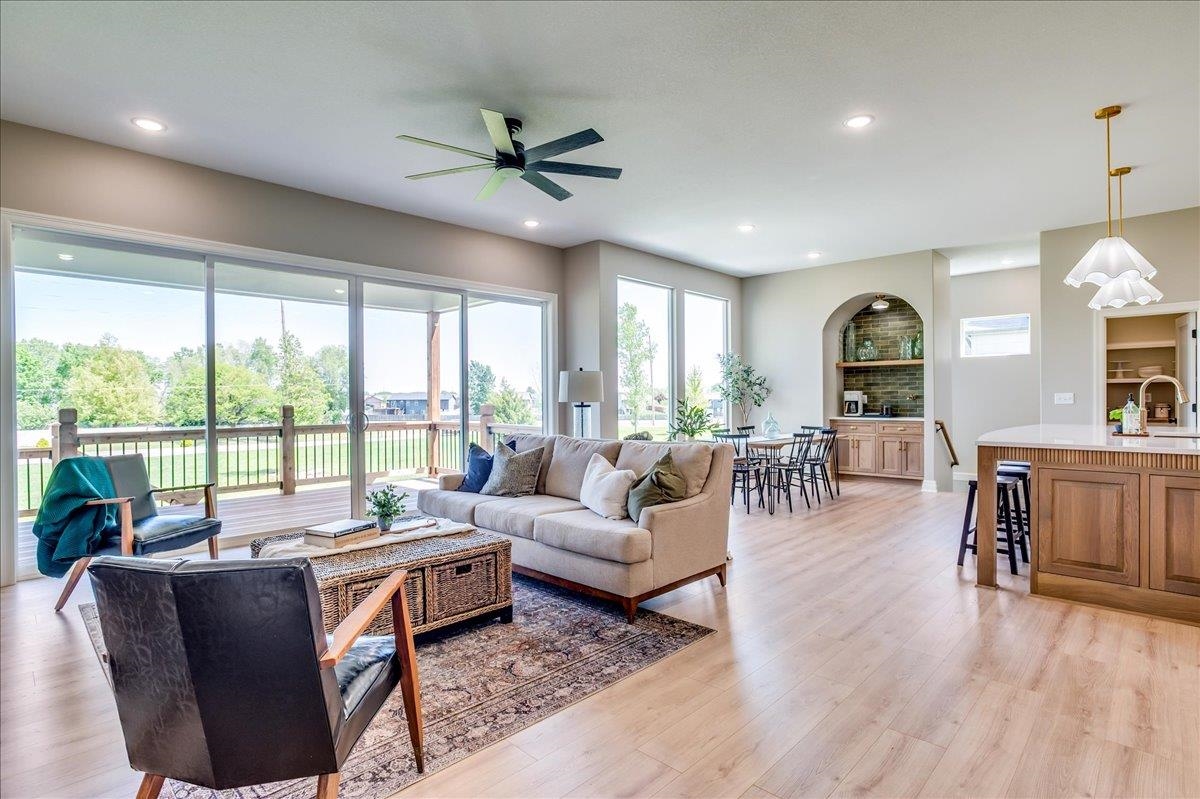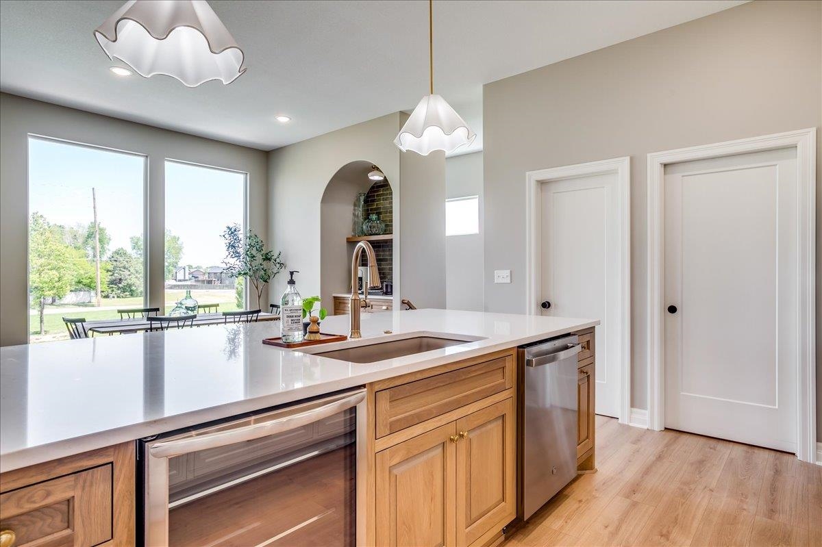 - Description: The Olive is an award winning 6 bedroom 3 bath home that also has an office! Arch door entry opens to a great room with a tray ceiling and a 16’ slider that opens up to a 19’ deck. Custom kitchen cabinets are beautiful and a trademark of this builder. You’ll love the coffee bar/beverage bar niche in the dining area, complete with a sink. The kitchen even has room for a beverage fridge. The primary suite is beautiful with a lovely high vaulted ceiling, and the bathroom has a gorgeous rich toned full tile shower with dual shower heads and wand. Laundry connects to primary closet. The dedicated office on the main level has a pocket door, and lots of built in cabinets and book cases for your needs. In addition to the extra large deck, you can access the back yard from a mid level walk out door on the way to the basement. Stunning wet bar with lit cabinets is found in the huge family room. The bedrooms are all larger and give room for everyone to have their own space. There is also a large unfinished area for your storage needs. The garage is oversized and has extra space behind the 3rd car bay for storage, bikes, lawn mowers, or a work shop area. The details in this home are amazing and quality craftmanship show everywhere. Information deemed reliable but not guaranteed and may change without notice. Room sizes may be estimated. Taxes are shown on vacant lot. Specials may not be entirely spread yet and are shown as estimates. There is a $250 mailbox key collected at closing. Show all description